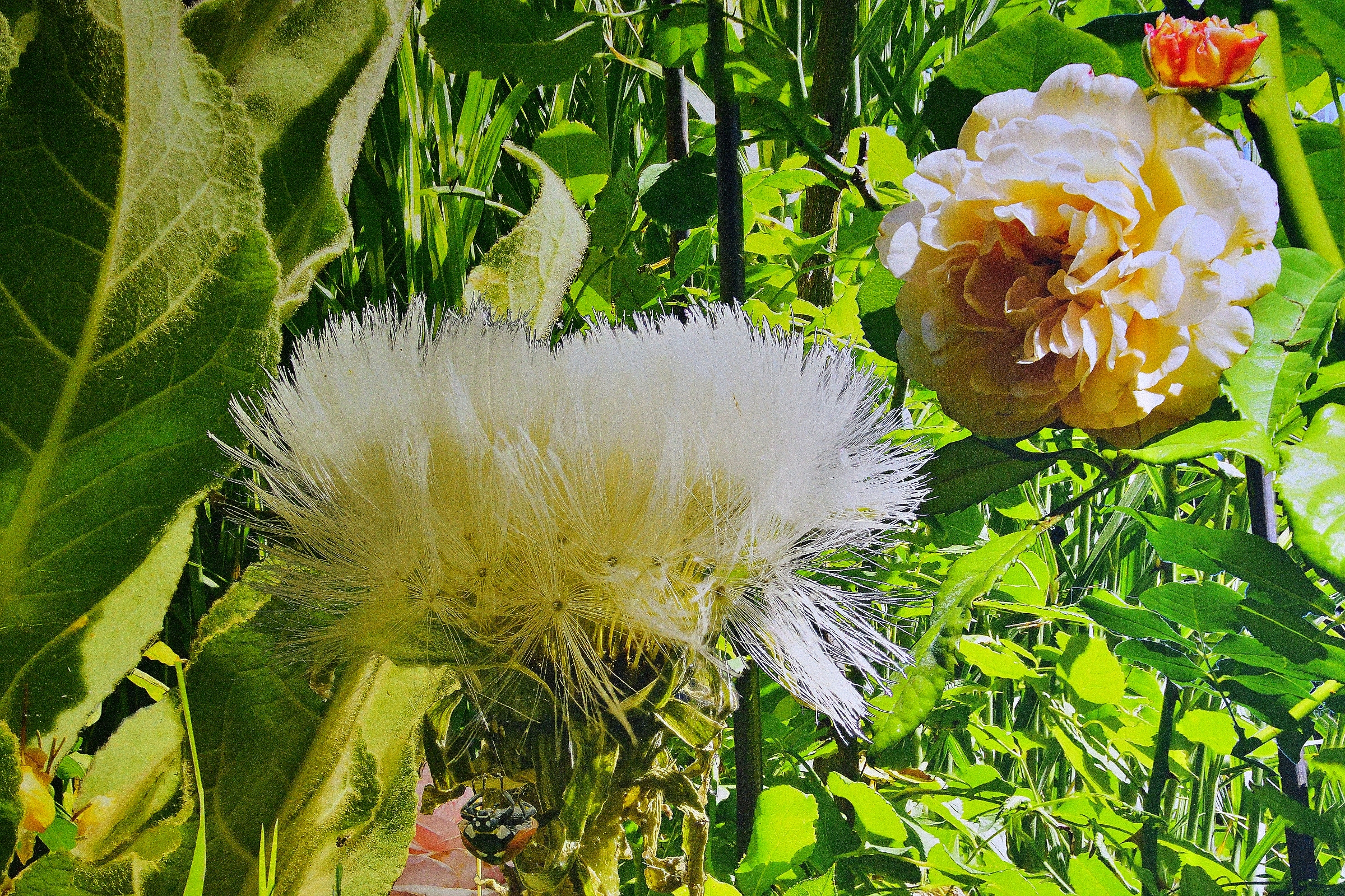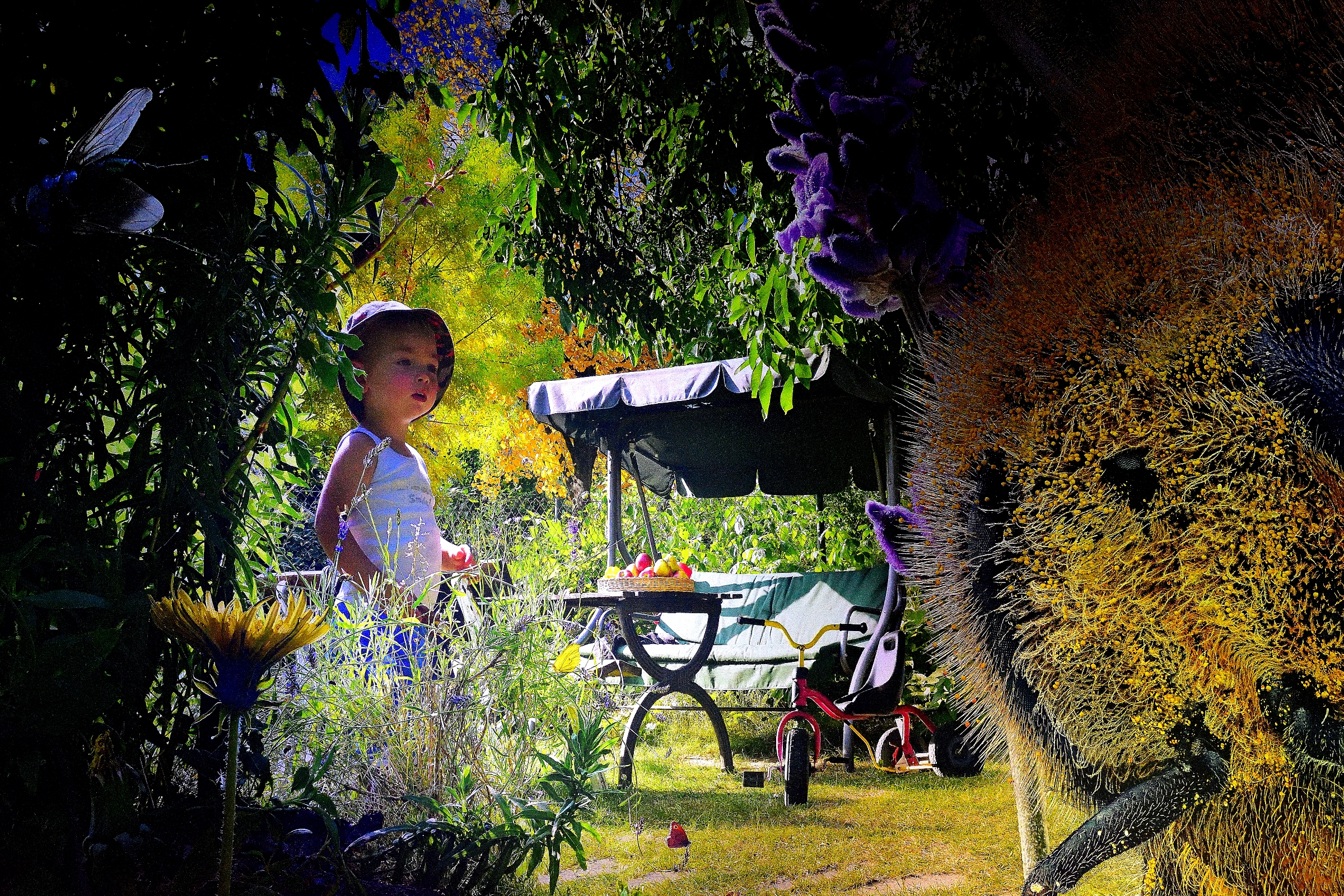 So gibt es z.B. eine 25 Meter große Biene, die dabei ist, eine Kamillenblüte zu bestäuben oder eine Katze die erkennbar auf der Jagd ist und vorsichtig mit großen Augen durch das Gras schleicht.