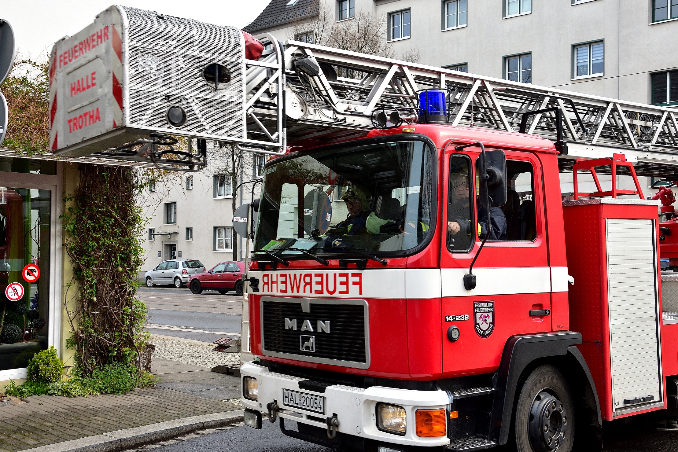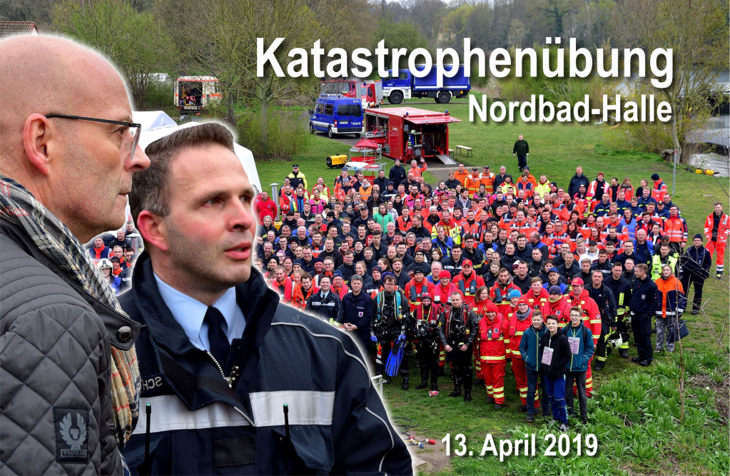 Es ist gegen 09:30 Uhr am Sonnabend den 13. April im Stadtteil Trotha vor dem Haupteingang des Nordbades. Wer die Informationen im Vorfeld der Katastrophenübung nicht mitbekommen hat, wird sich gewundert haben, wie viele Fahrzeuge sich da mit hohem Tempo in die Einfahrt des Bades bewegen. Feuerwehr, Rettungsdienste, Polizeifahrzeuge mit Motorbooten im Schlepptau und andere an der Übung beteiligte bewegen sich zum Einsatzort. Um einen reibungslosen Ablauf der Übung zu gewährleisten, hatte man die Zufahrt und den Parkplatz vor dem Bad an diesem Tag zwischen 07:00 und 15:00 Uhr für den Verkehr gesperrt.