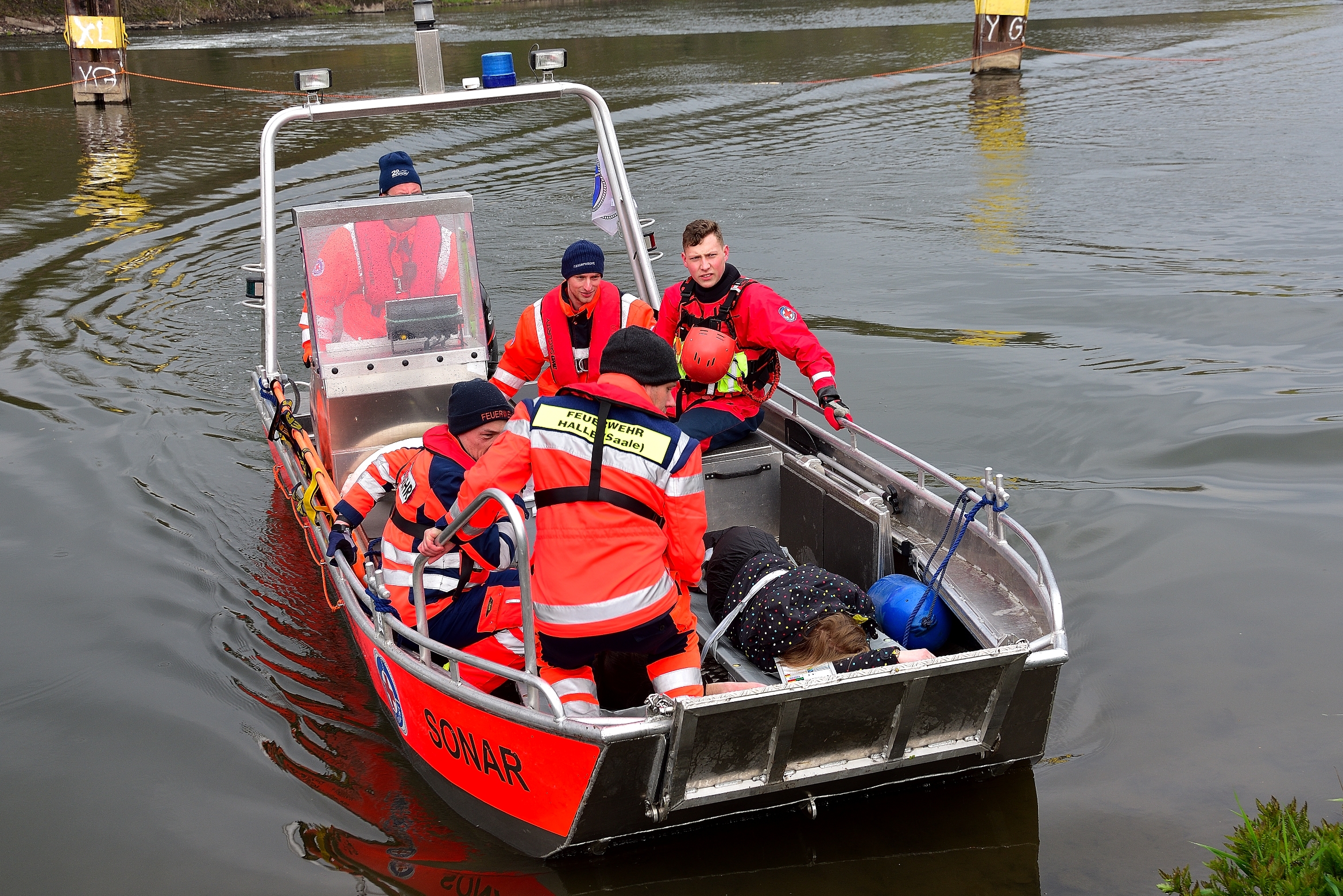 Die Rettungskräfte handeln schnell und besonnen, Verletzte werden erstversorgt und nach ärztlicher Beurteilung einer speziellen Behandlung zugeführt. Selbst vom gegenüberliegen Saaleufer im Forstwerder werden Verletzte geborgen und über die Saale mit Einsatzkräften der DRK Wasserwacht zum Behandlungsplatz verbracht. Zusätzlich sind Taucher eingesetzt, die das Flussufer nach möglichen Verletzten absuchen.