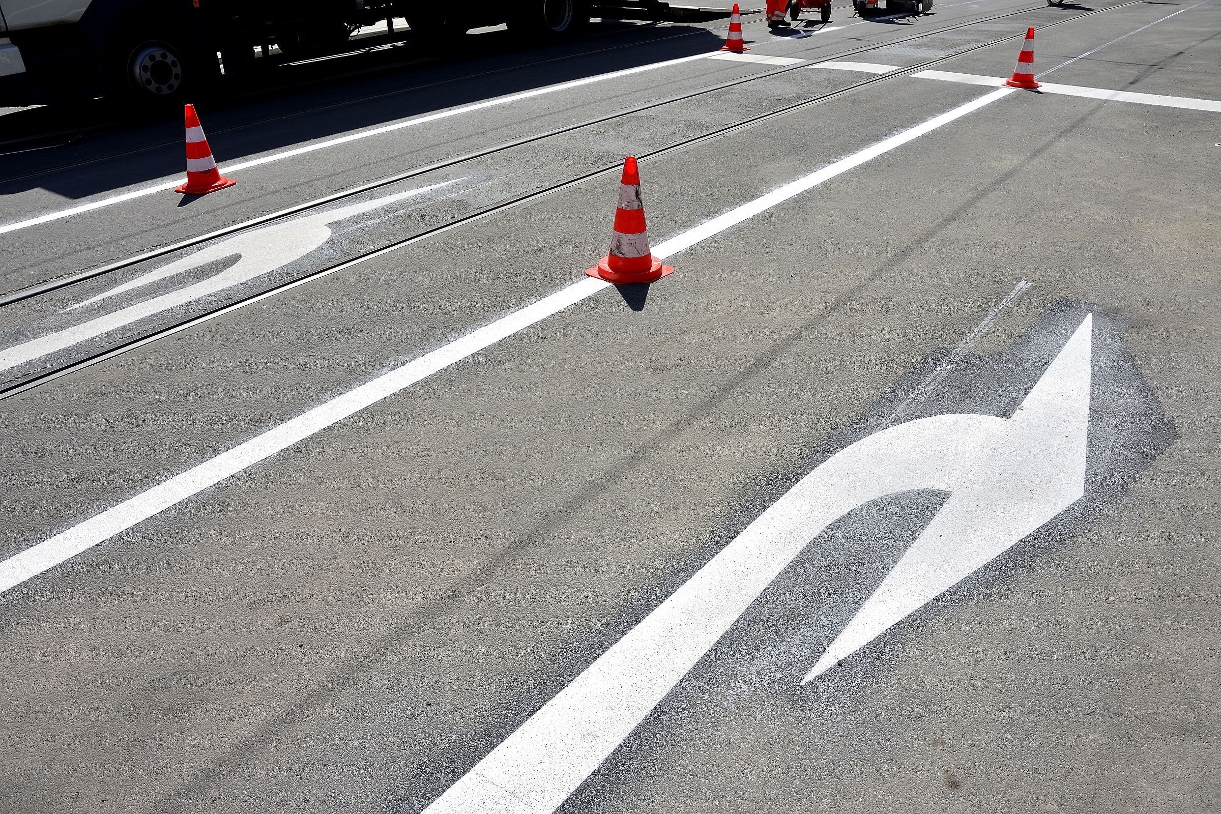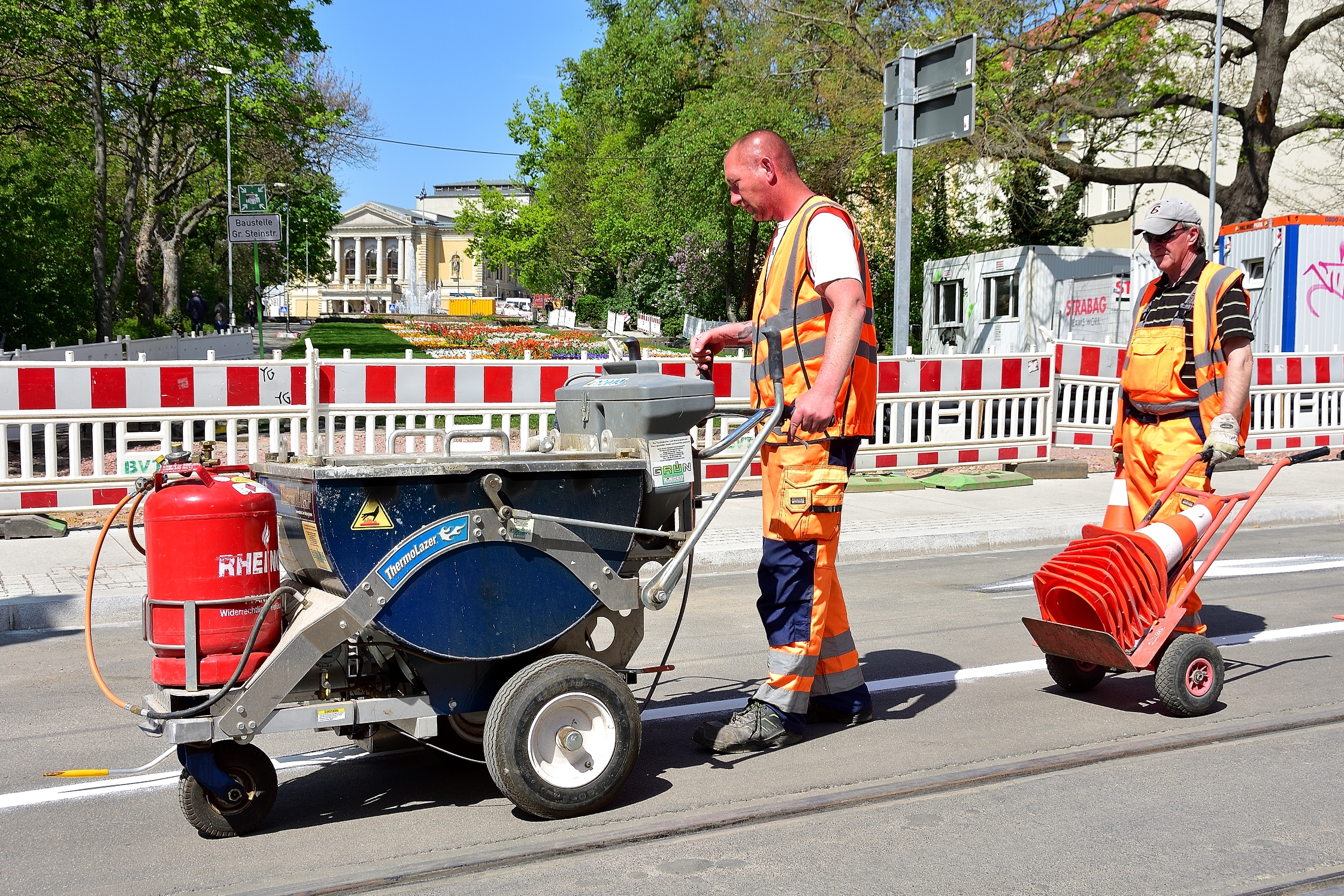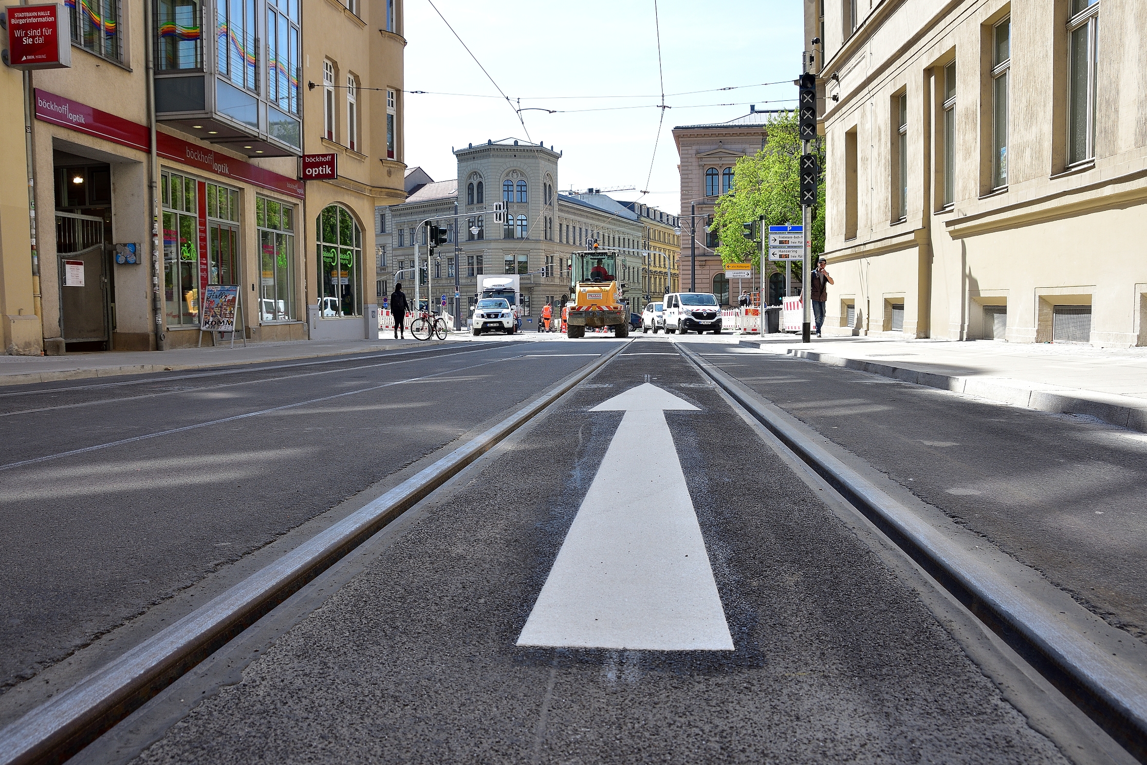 Die Arbeiten an der Großen Steinstraße sind bis dahin abgeschlossen. Gestern wurden auf der Fahrbahn vor der Post bereits die Markierungen aufgebracht und die Ampeln haben auch schon die ersten Probeläufe hinter sich.