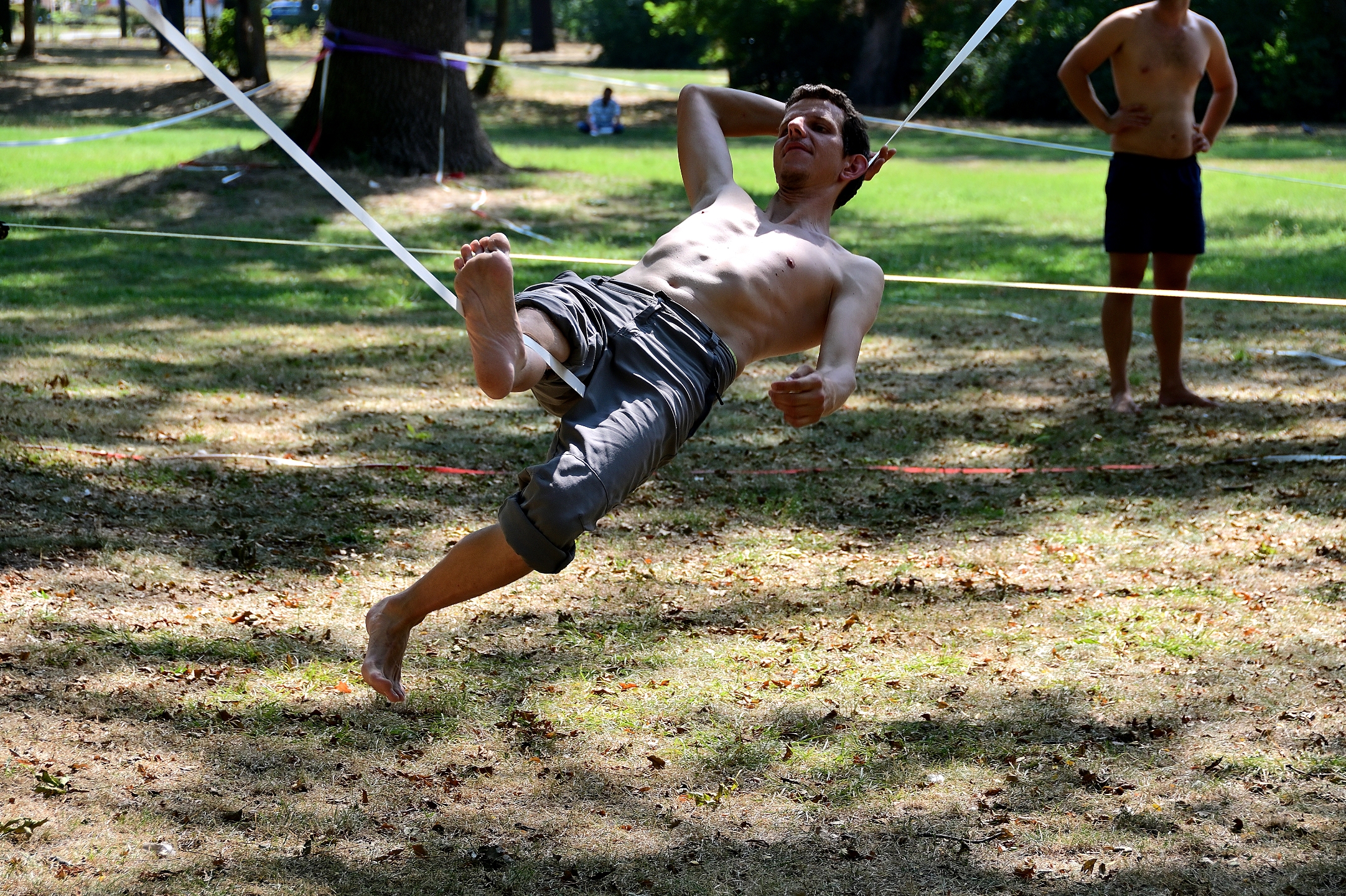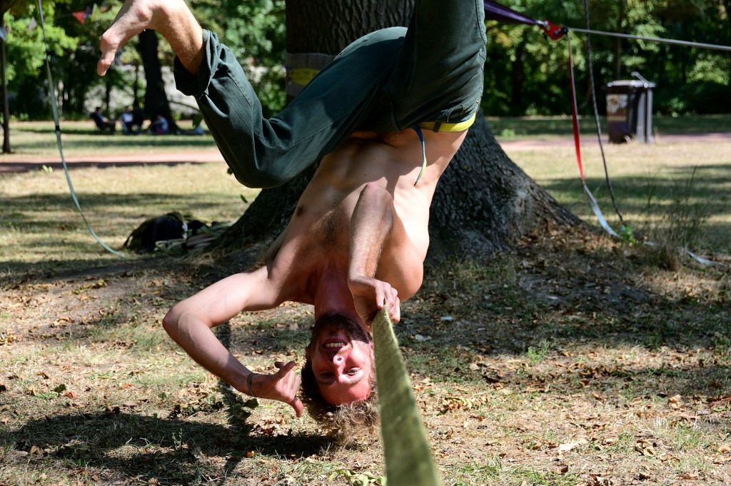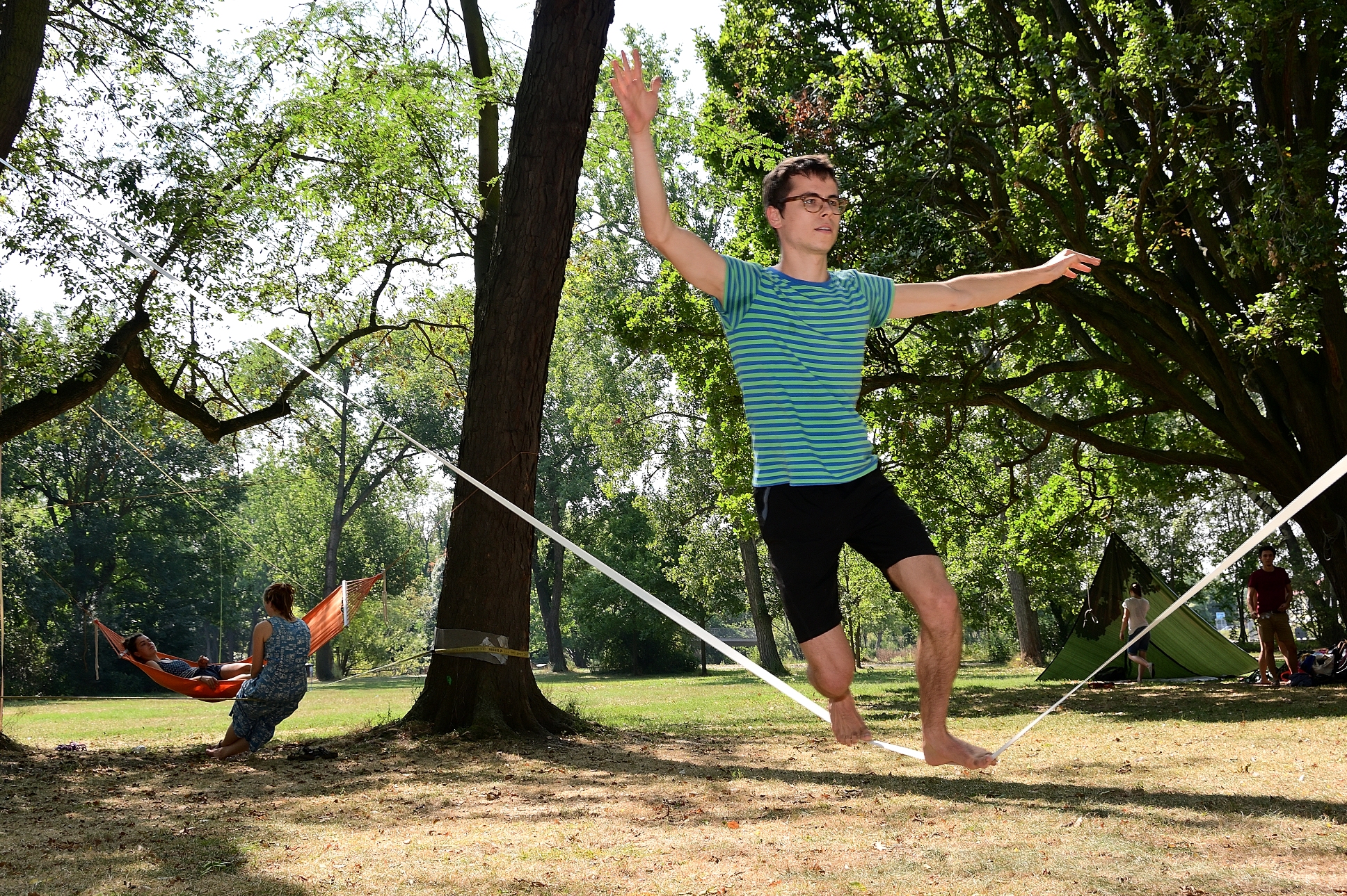 Am Sonnabend war es wieder soweit. Auf der Würfelwiese am Ufer der Saale wurden die Slacklines gespannt. Slackline ist Englisch und bedeutet übersetzt „locker gespanntes Band“. Locker sind zwar die Protagonisten des Slackliner Halle, aber die Bänder werden zwischen den Bäumen sicher gespannt, verankert und fest verzurrt. Die notwendige Sorgfalt beim Aufbau darf man dabei nicht außer Acht lassen, denn nicht nur die Anhänger der Szene wollen sich ausprobieren. Es sind auch Anfänger, die sich spontan vom Mitmach-Angebot inspirieren lassen.