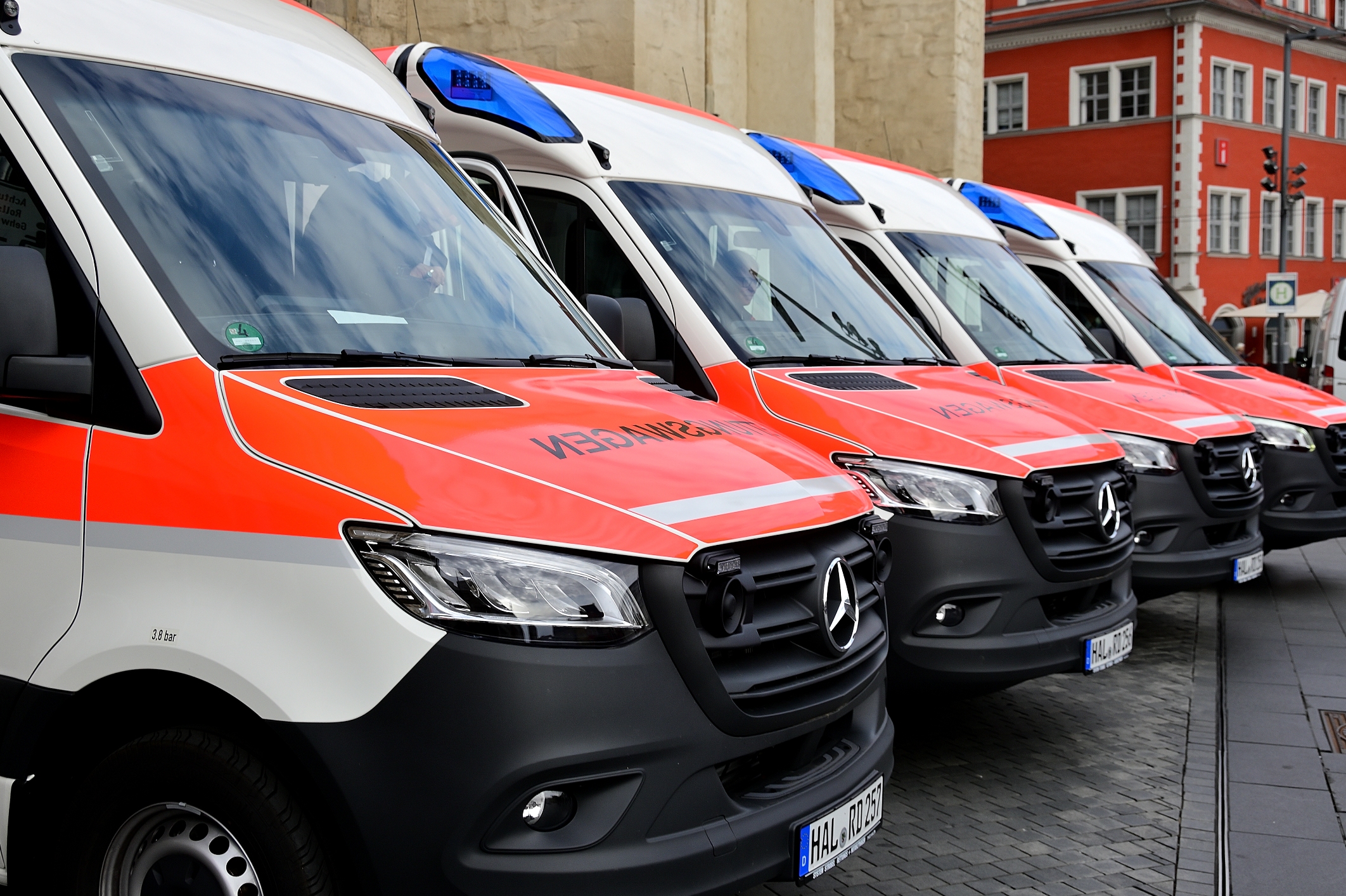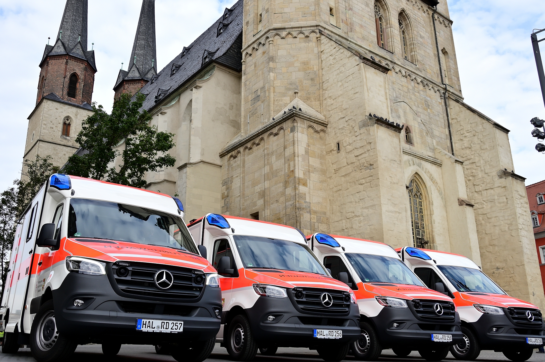 Vor der Übung übergab der Oberbürgermeister der Stadt Halle, Dr. Bernd Wiegand 4 neue Rettungsfahrzeuge an die Hilfsorganisationen.