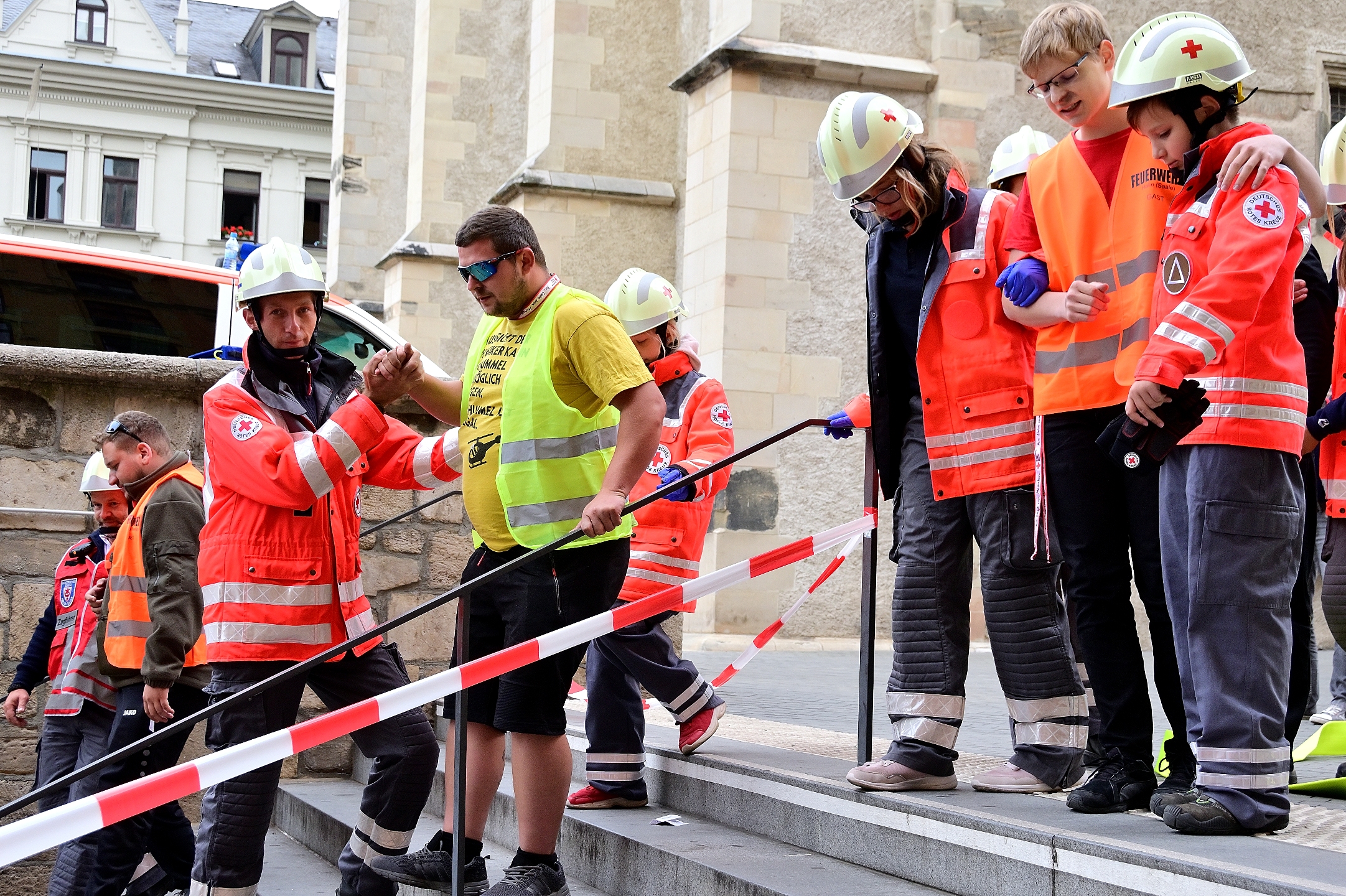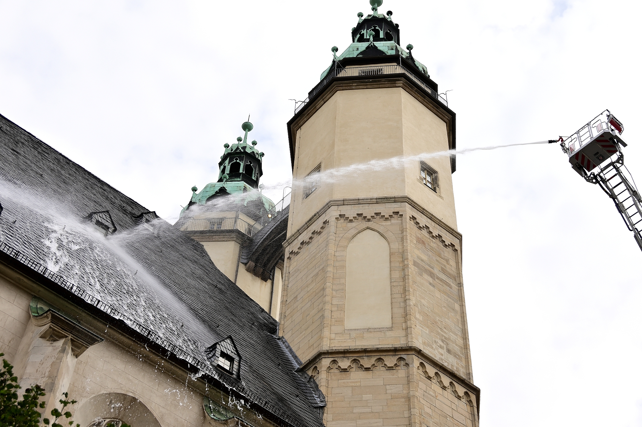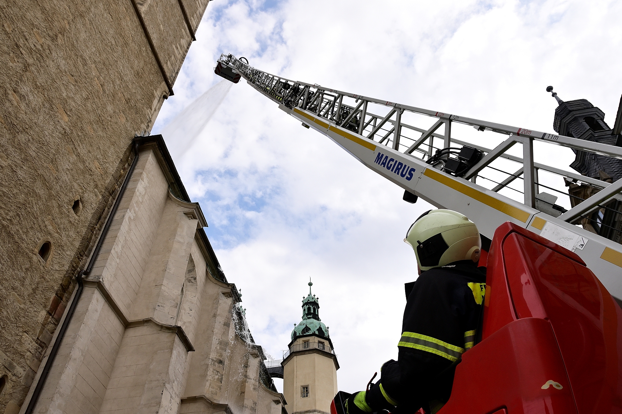 Aus der Marktkirche wurden verletzte Menschen geborgen und anschließend medizinisch versorgt. Gleichzeit erfolgte die Brandbekämpfung des Kirchendaches durch die Feuerwehr Halle, dabei wurden die Drehleitern maximal ausgefahren. Die Wasserzufuhr über auf der Drehleiter angebrachte Druckschläuche. Für die zahlreichen Zuschauer war es nicht nur interessant, es ist auch beruhigend zu wissen, dass die Stadt Halle auf mögliche Katastrophen gut vorbereitet ist.