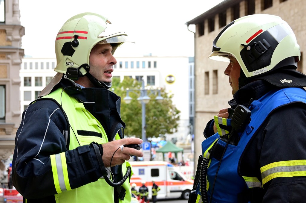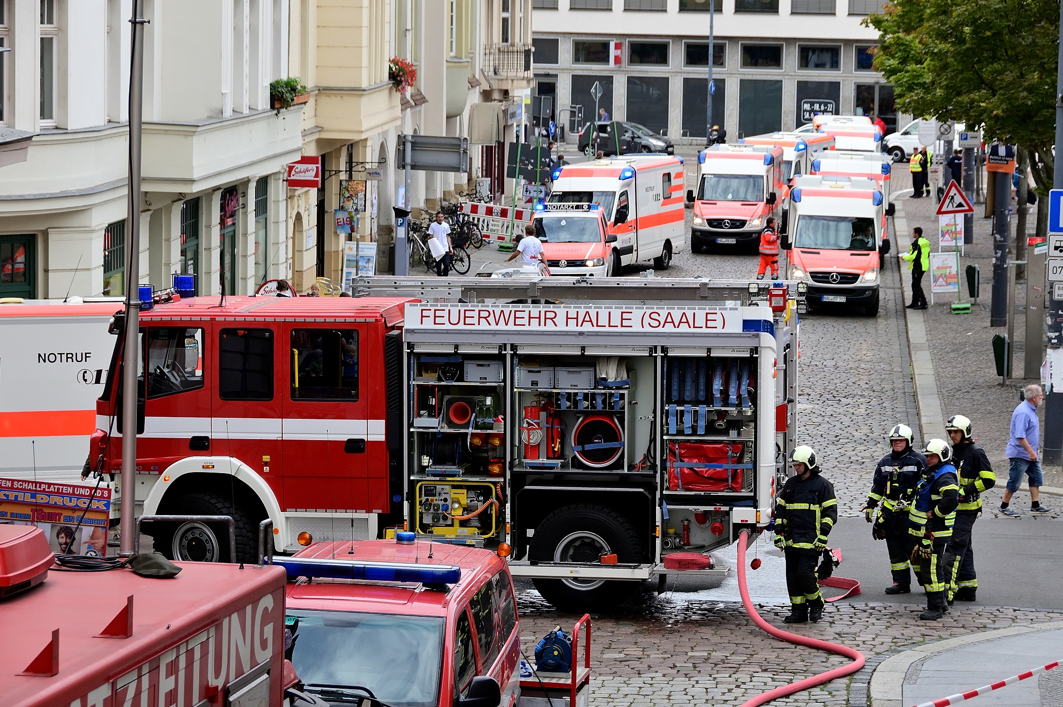 Mehr als 80 Rettungskräfte von Rettungsdienst, Katastrophenschutz, Polizei und der Feuerwehr Halle trainierten am Sonnabend ab 09:30 Uhr im Bereich des Marktes, Hallmarktes und der Marktkirche.