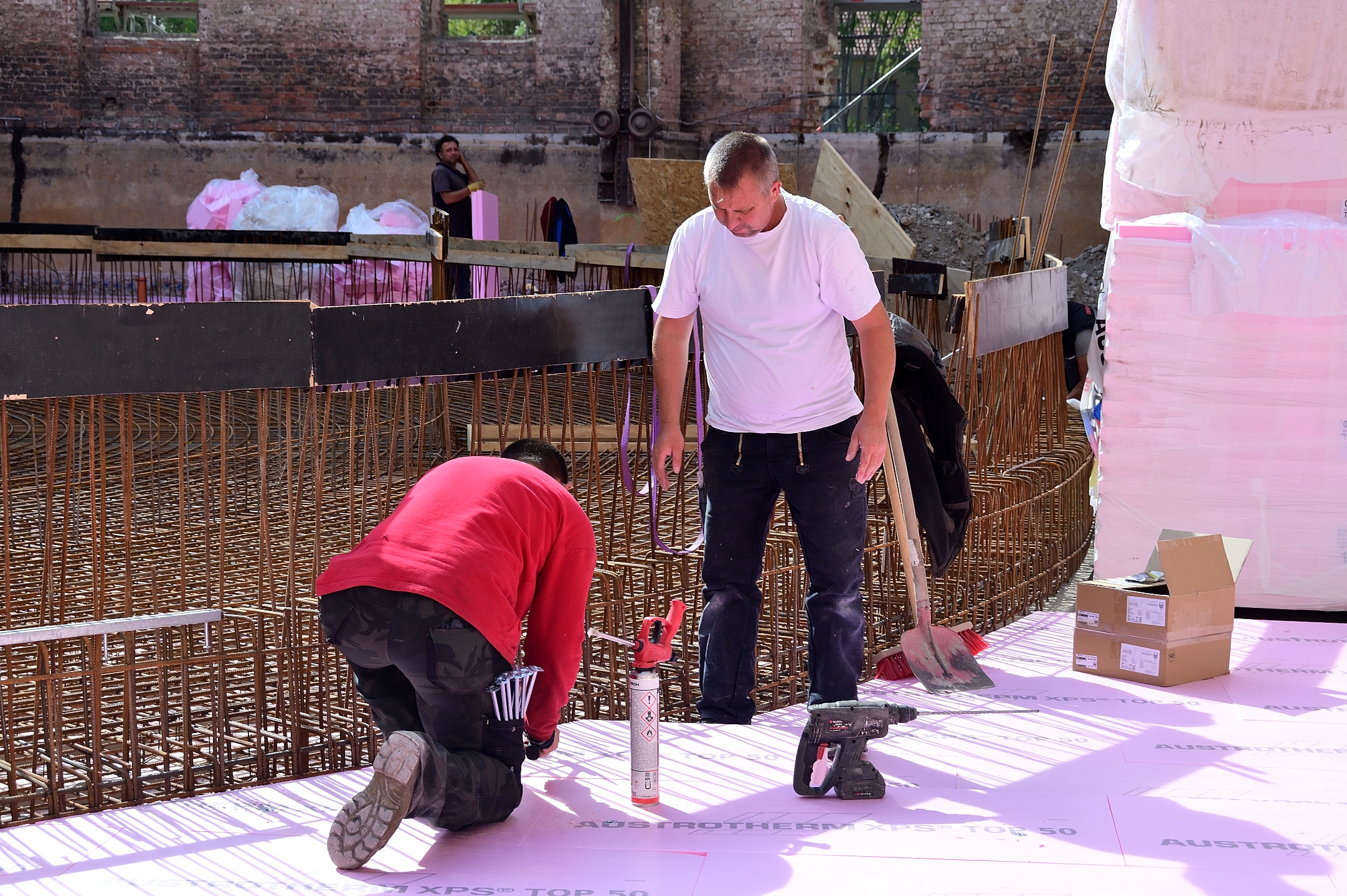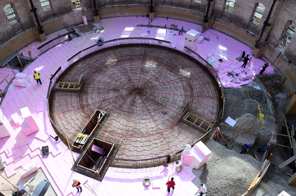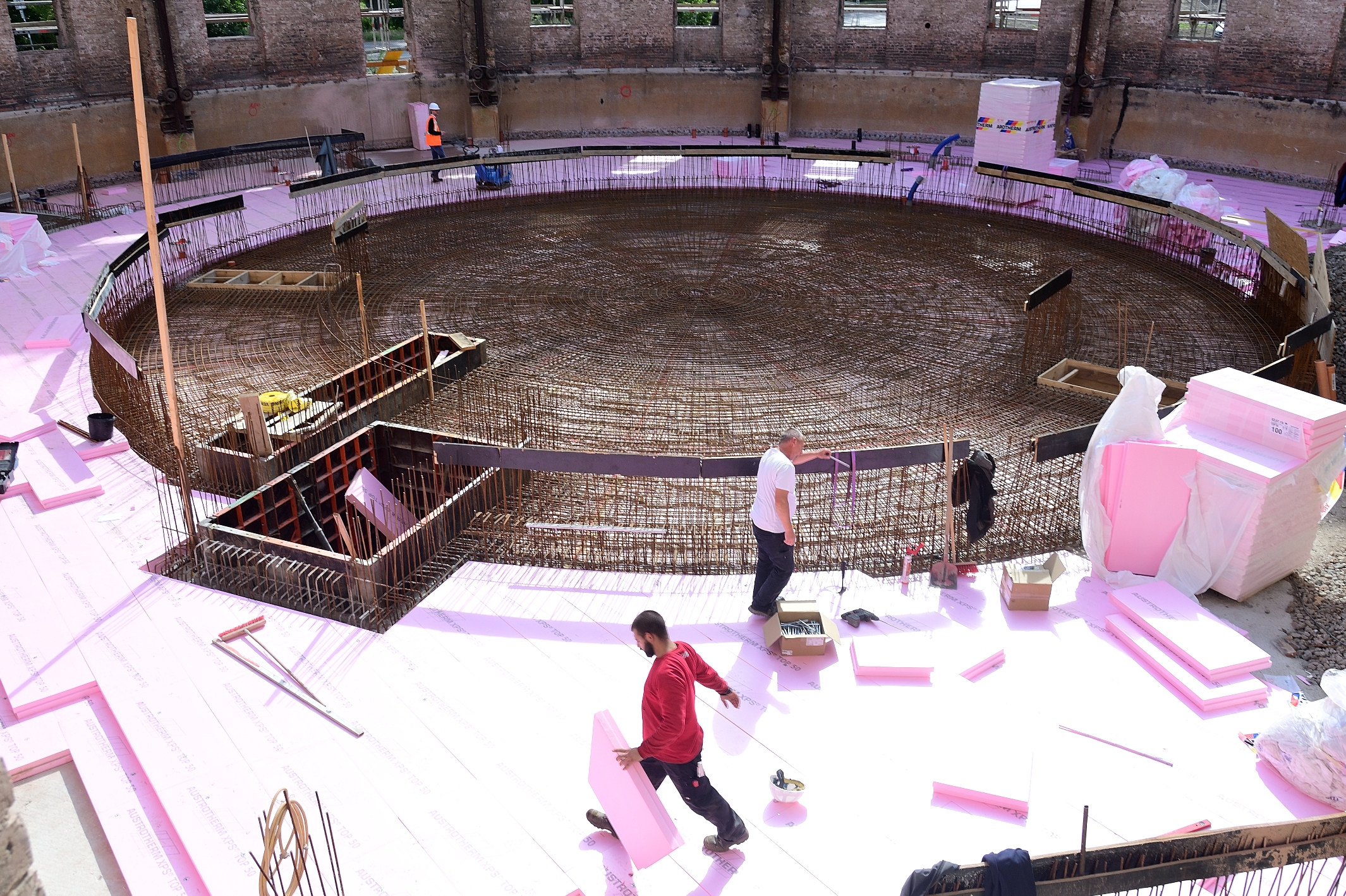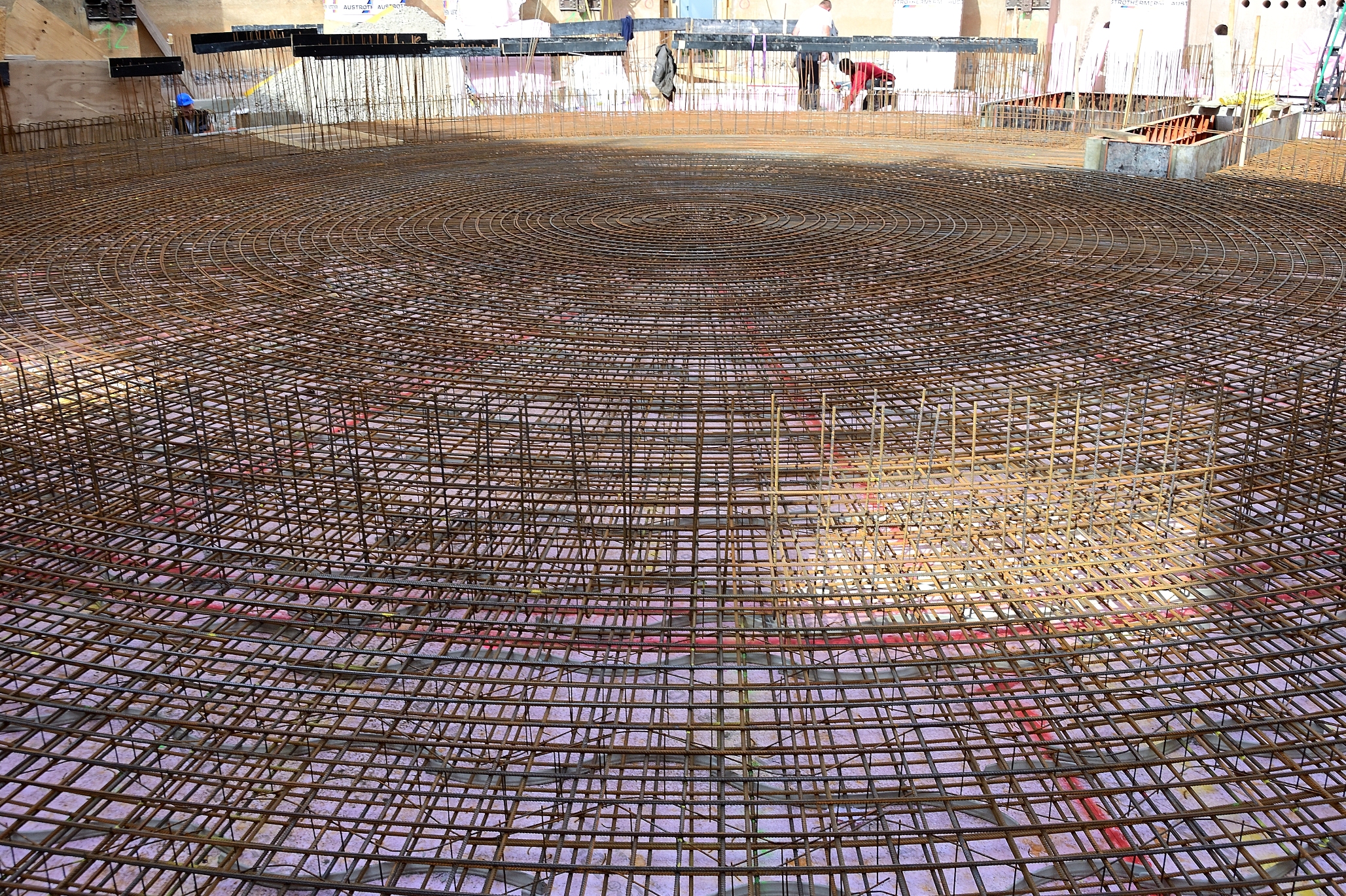 Am 24. September war auf dem benachbarten Bauplatz Richtfest für die Sporthalle. So schnell kann es auf der Baustelle für das neue Planetarium nicht gehen. Von außen nicht sichtbar sind die Vorbereitungen für den Guss einer massiven Betonplatte fast abgeschlossen. Da wird isoliert und abgedichtet, damit alles in einem Arbeitsgang erledigt werden kann. Die Grundplatte wird einiges an Gewicht zu tragen haben, deshalb das dichte ringförmige Eisengeflecht, das in Kooperation mit dem Beton alles zusammenhalten wird. Diese Ebene wird etwas höher liegen als die nächste zu vermutende Hochwassermarke.
