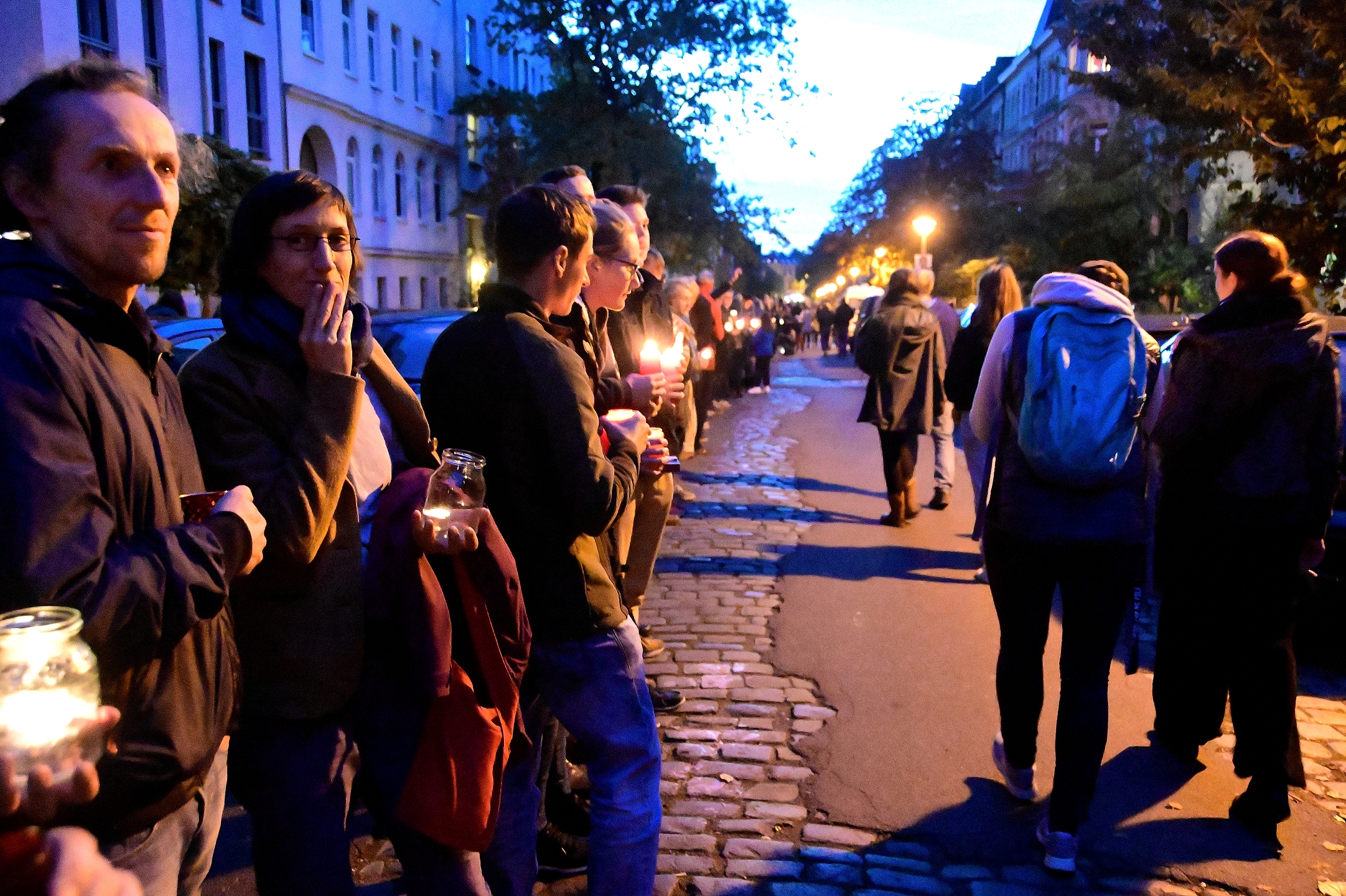 Mehr als 1.000 Menschen fanden sich gegen 18:00 Uhr vor der Synagoge ein, um gemeinsam mit den Angehörigen der jüdischen Gemeinde zu trauern. Die vielen Trauernden bildeten gleichermaßen eine menschliche Schutzmauer vor der Synagoge. Sie legten Blumen nieder, entzündeten Lichter und nahmen am Gebet zum Sabbat teil.