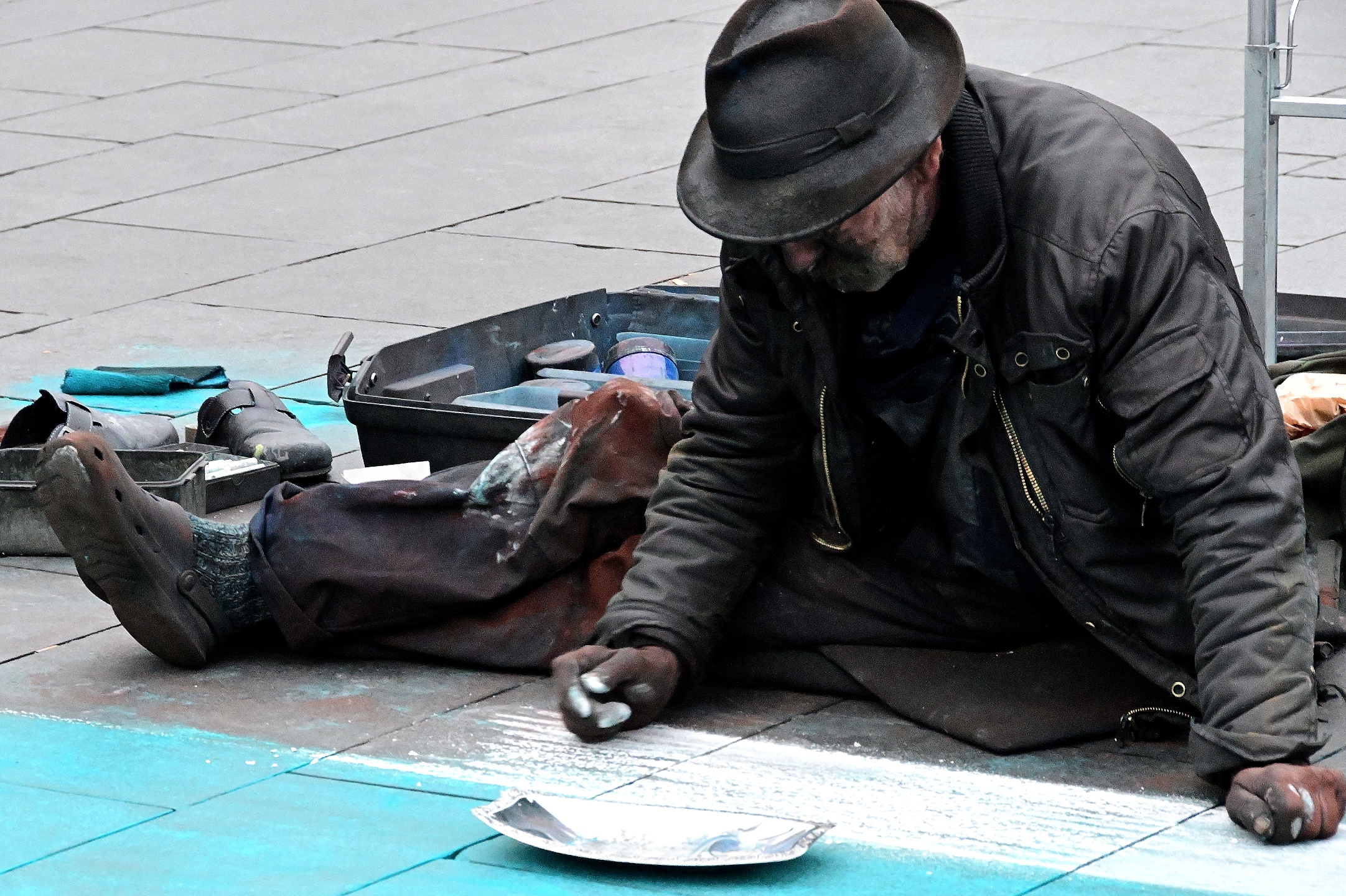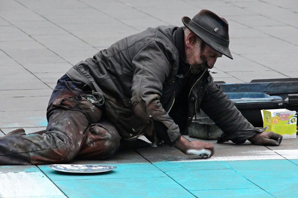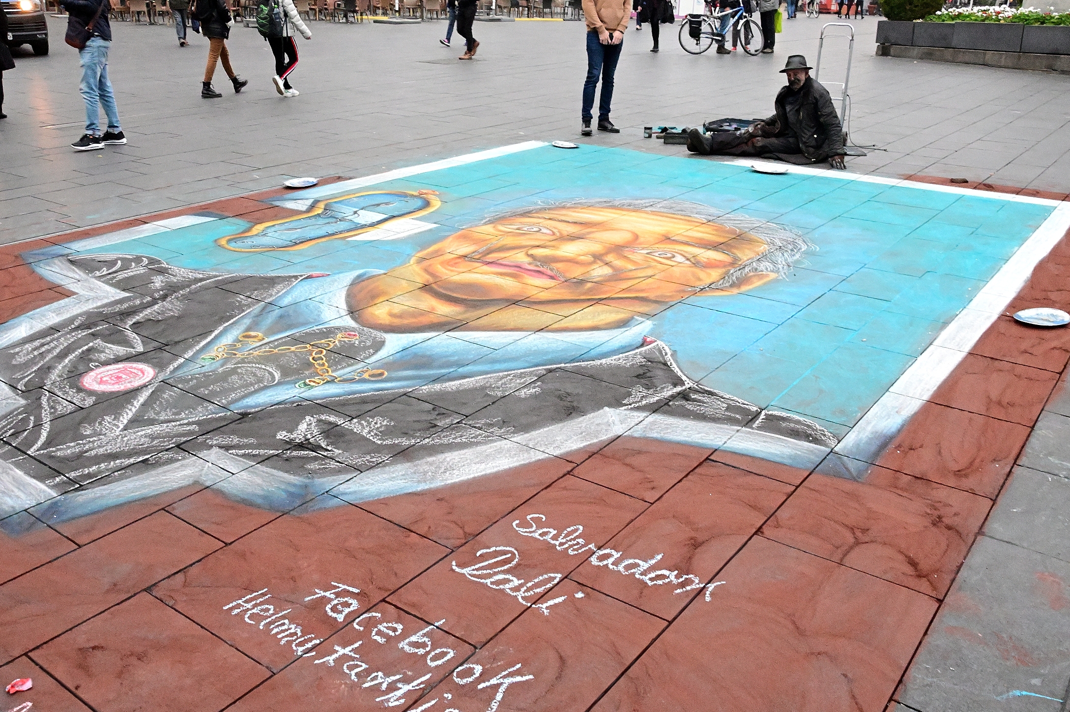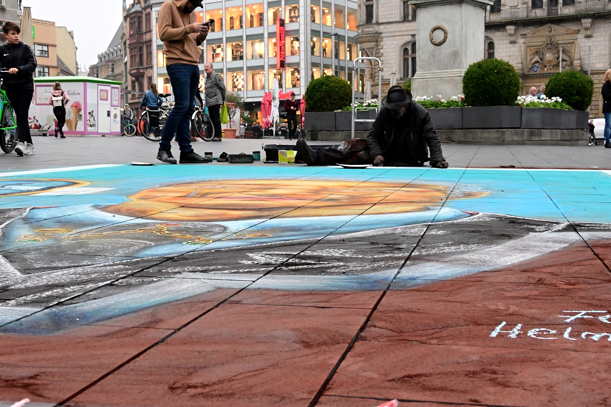 Es ist nicht sein erstes Kunstwerk, welches er auf dem Markt von Halle erschafft. Helmut Artiste, aus Groß Flöthe bei Niedersachsen [www.facebook.com/helmut.artiste], sucht sich dazu immer die schönsten und geeignetsten Plätze aus. Denn seine Kunstwerke, die er mit Kreiden aufträgt sind nicht nur ziemlich großflächig, sie haben auch kein langes Leben. Entweder der Regen wischt sie einfach weg oder die Menschen, die den Markt überqueren tragen sie mit ihrem Schuhwerk ab. Seine Werke sind also vergänglich, da braucht man als Künstler ein gehöriges Maß an Selbstbewusstsein, um sich immer wieder zu motivieren.