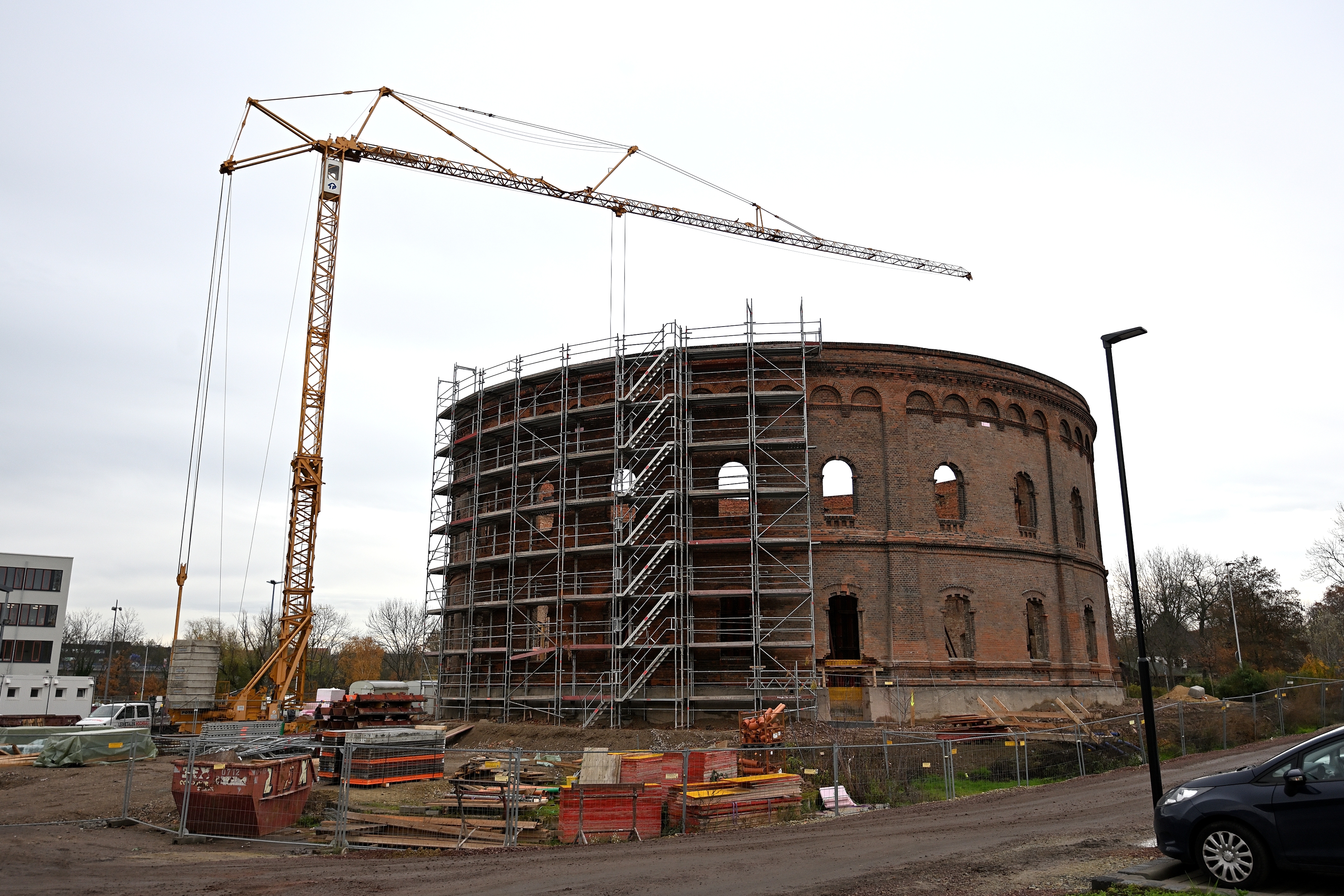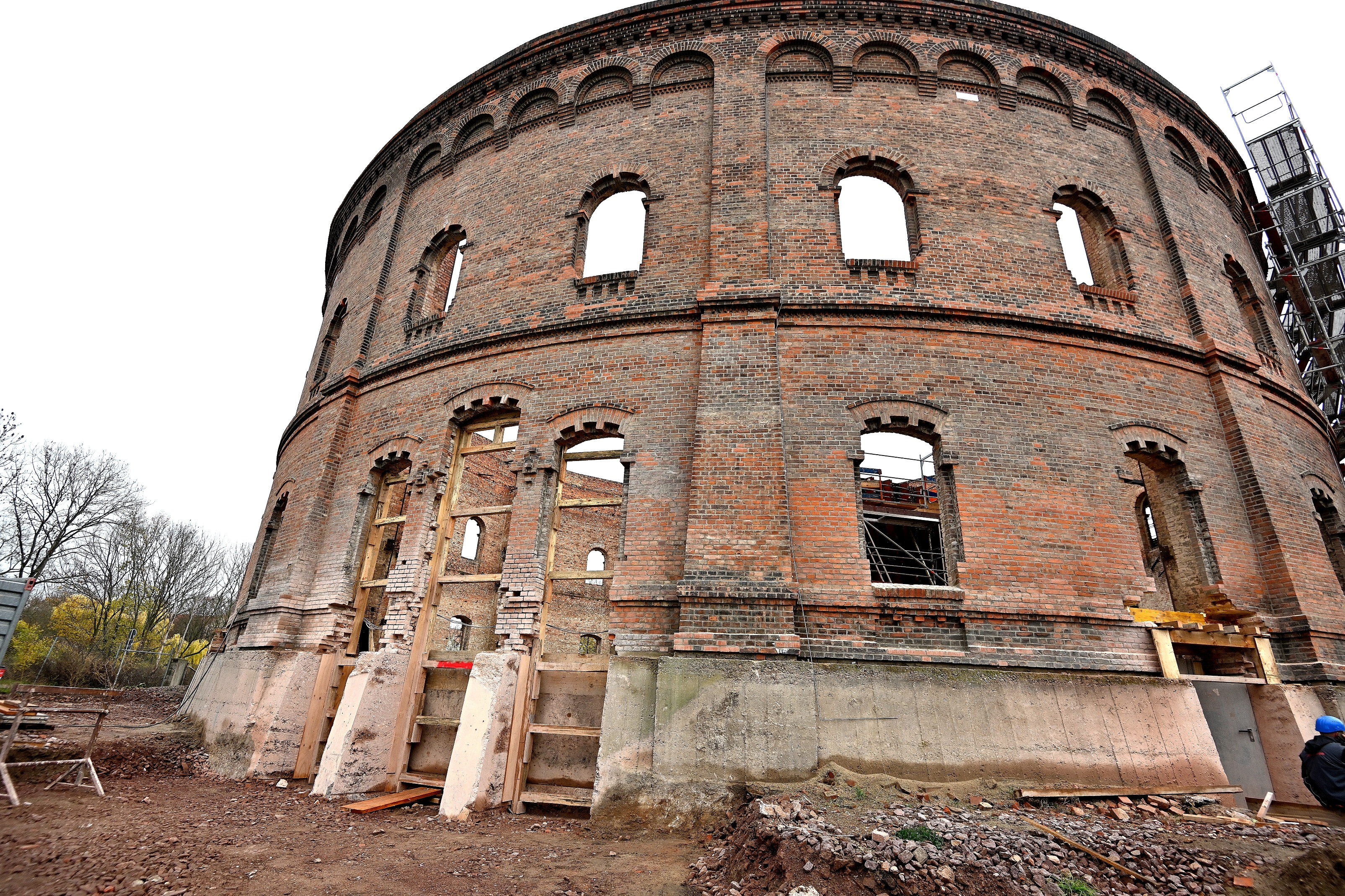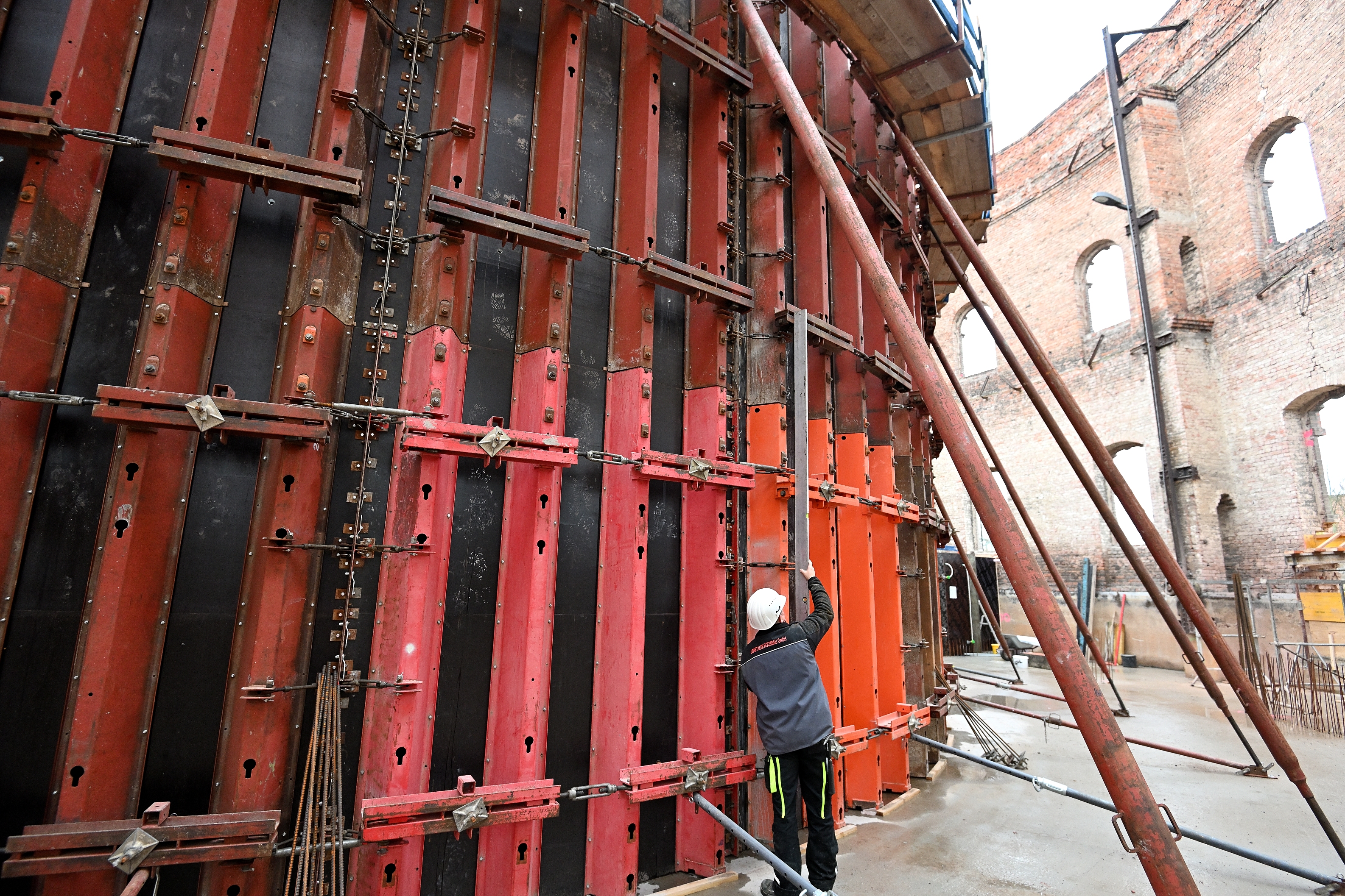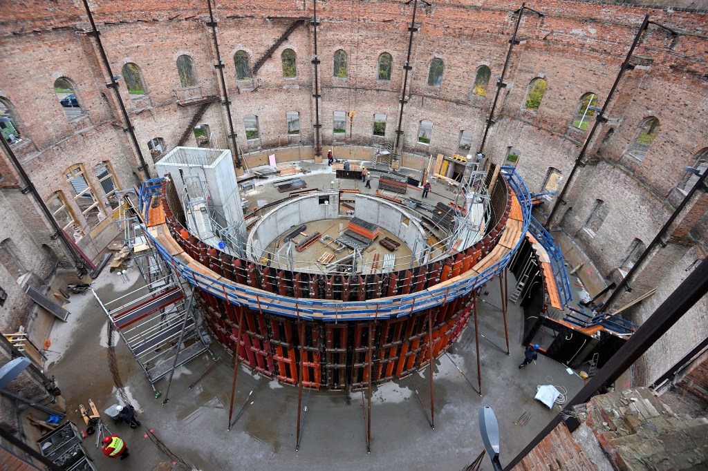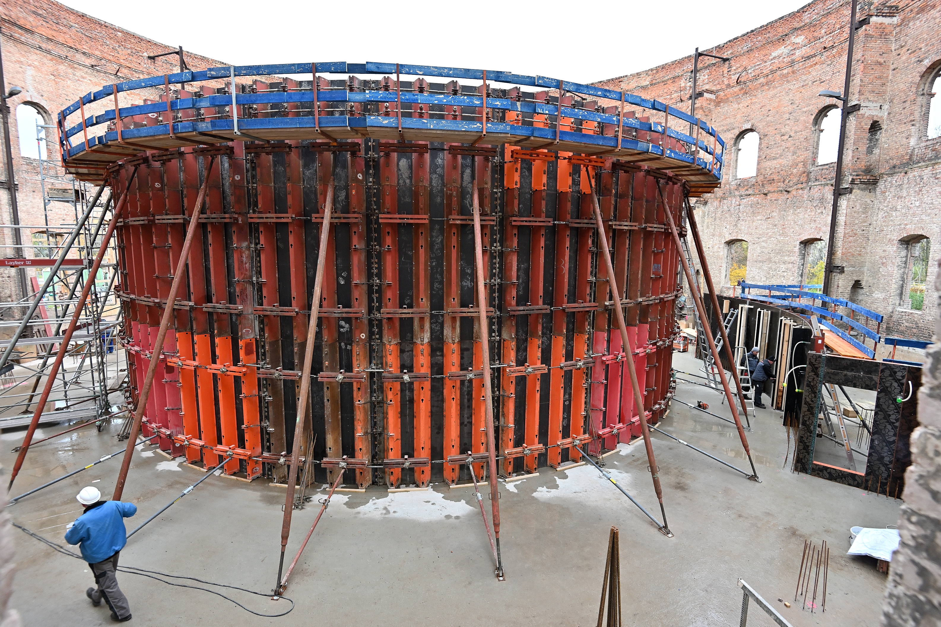 Im Inneren des Gasometers wächst der Betonkern langsam in die Höhe, während die alte Außenhülle weitgehend erhalten bleibt. Große Schalungselemente werden aufgebaut, die auf den Millimeter genau ausgerichtet sind. Immerhin sollen darauf noch einmal ca. 10 Meter Betonwand aufgesetzt werden, um auf die Bauhöhe von 17 Meter zu kommen, worauf dann die Kuppel aufgesetzt wird. In den Bauabläufen gibt es da einige Herausforderungen, die aber routiniert gelöst und abgearbeitet werden. So ein Planetarium zu bauen und dabei die alte Bausubstanz mit einzubeziehen, ist nicht alltäglich.