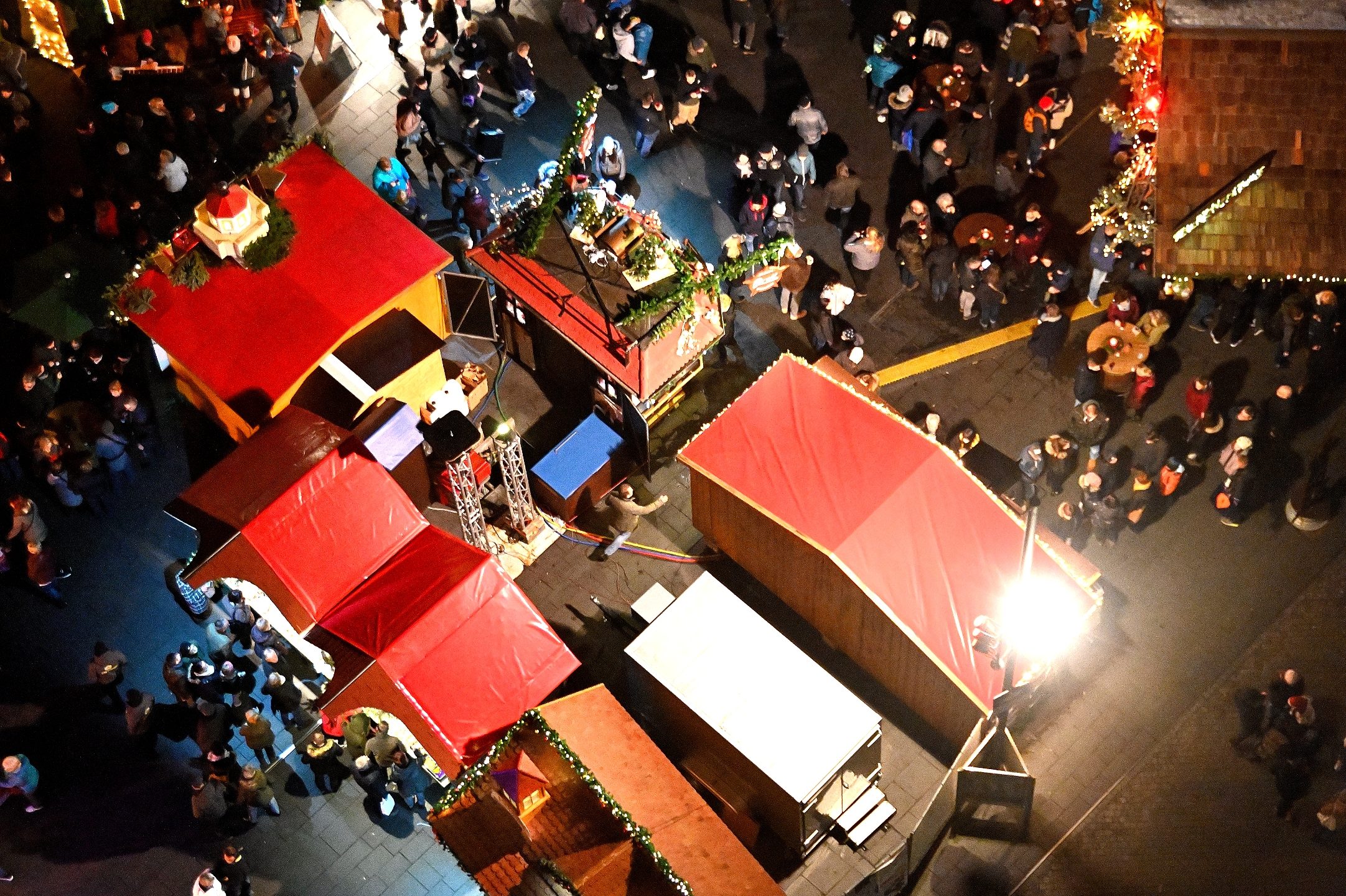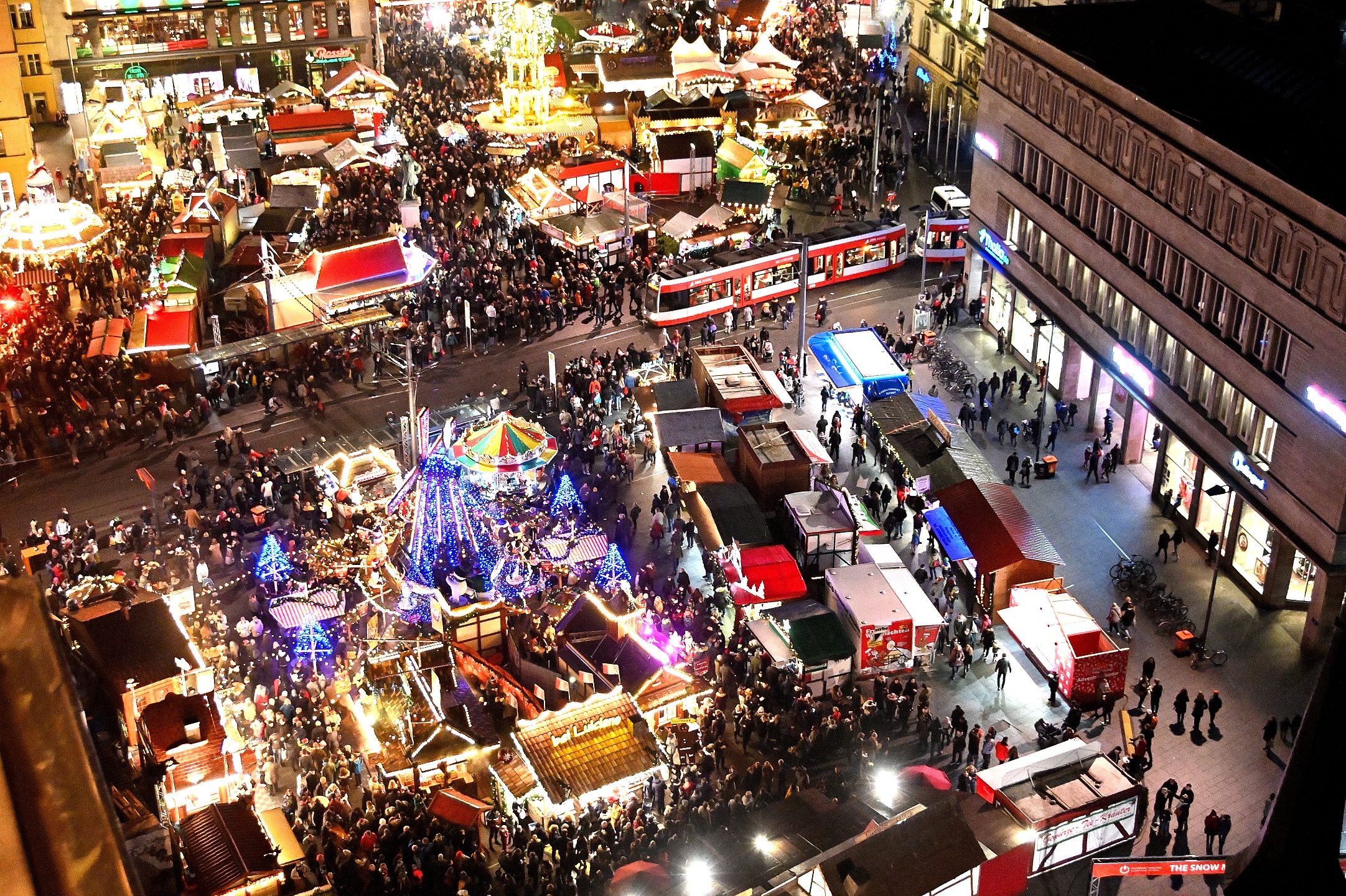 Und wer dann noch die Kondition aufbringt kann noch einmal 100 Meter weiter, über 80 Meter aufsteigen, aber zu Fuß und von den Hausmannstürmen den gesamten Weihnachtsmarkt in seiner farblichen Pracht überblicken.