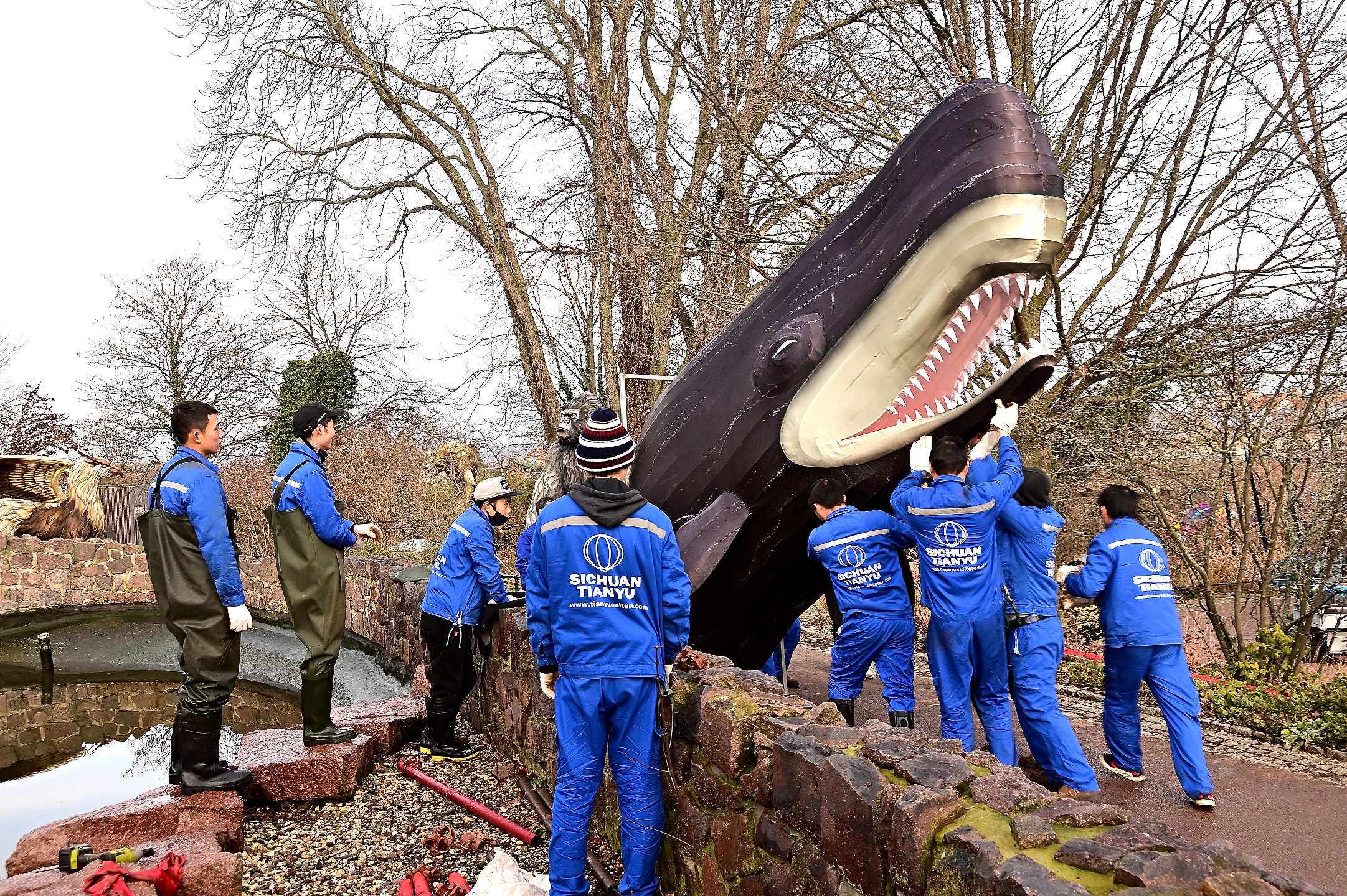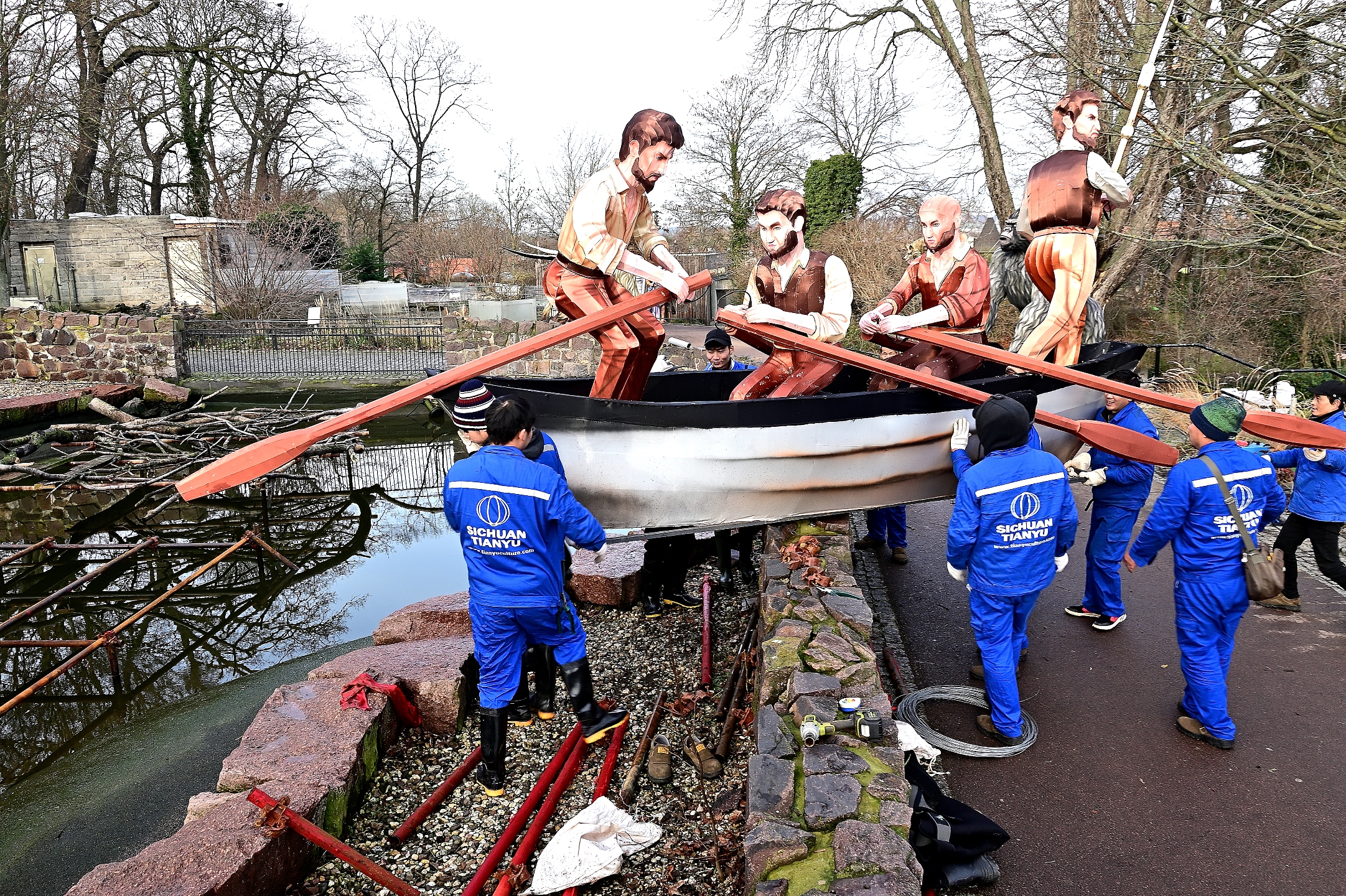 Es wird ihnen nicht gefallen haben, den Enten und sonstigen Wasservögeln im Zoo. Das tägliche Baden musste kurzfristig unterbrochen werden. Mitten im Teich ist gestern ein Wal und die zum Bild dazugehörigen Walfänger im Boot aufgebaut worden. Mit Wathosen und Gummistiefeln ausgerüstet und von außen konstant lautstark angefeuert, dauerte es nur eine Stunde, dann stand die Installation im Wasser.