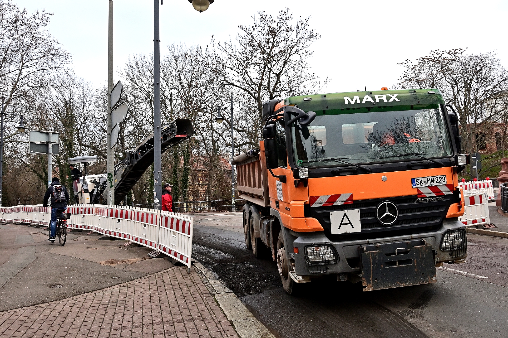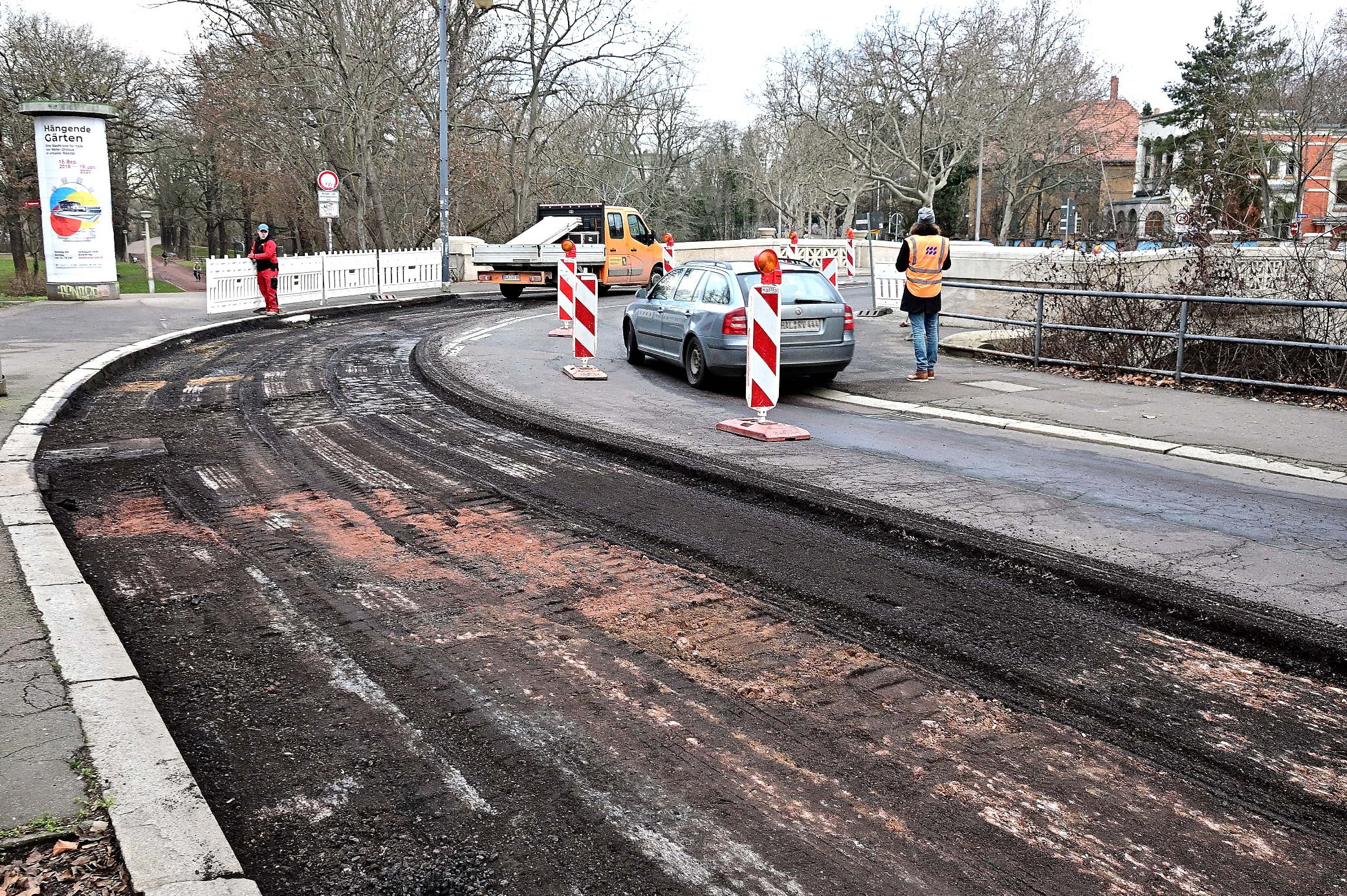 Drei Monate später als im April 2019 angekündigt, haben heute die Bauarbeiten am Robert-Franz-Ring begonnen. Einen Tag nach der Sperrung des Abschnitts sind die Baufirmen dabei, die alte Fahrbahndecke aus Bitumen aufzunehmen und den Bereich für die weiterführenden Arbeiten vorzubereiten.