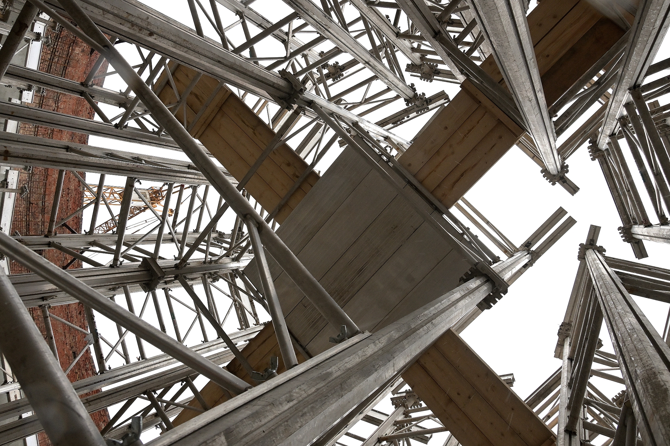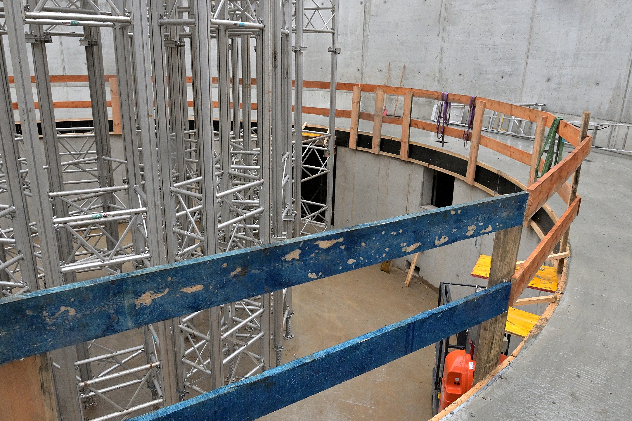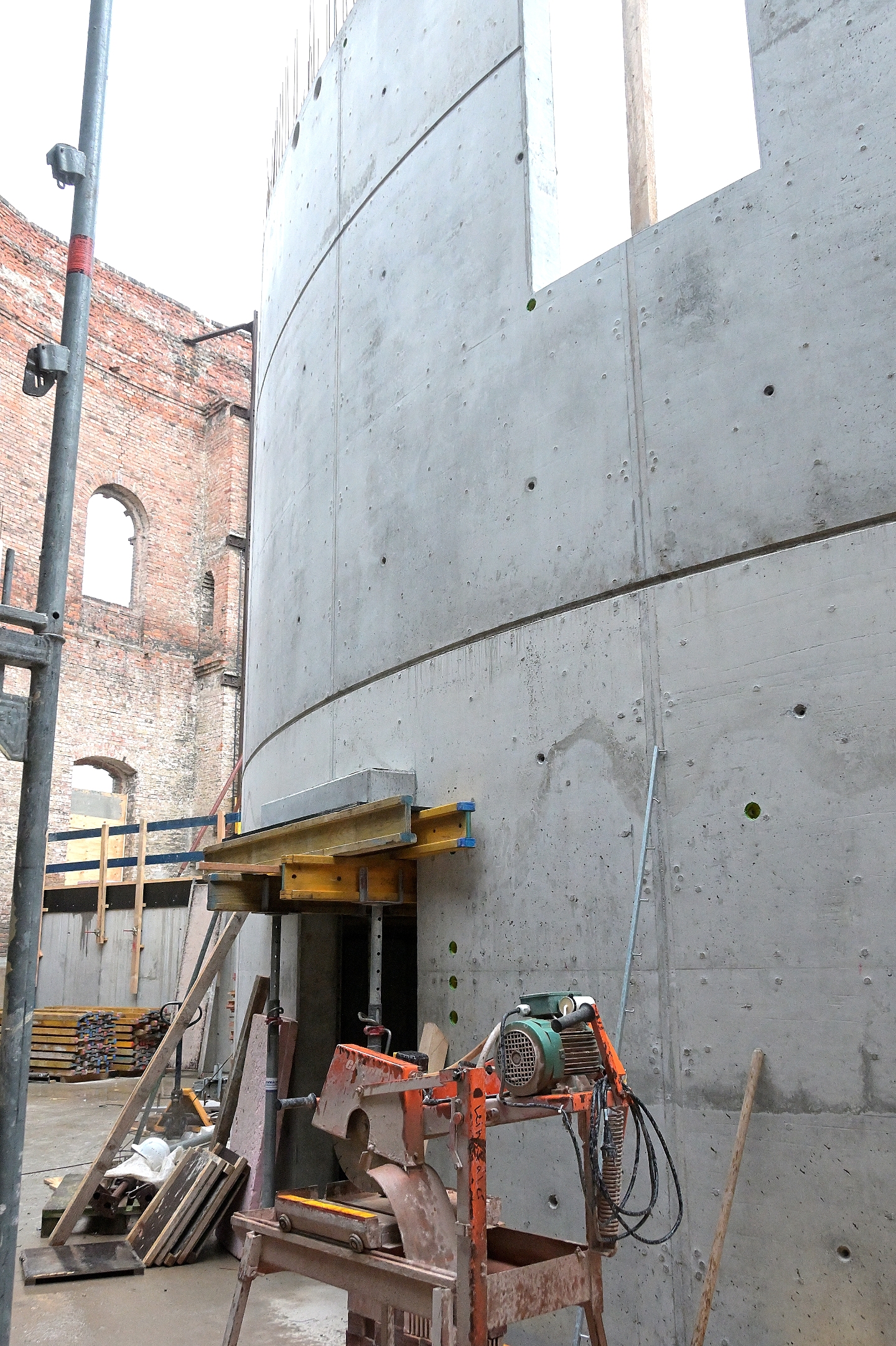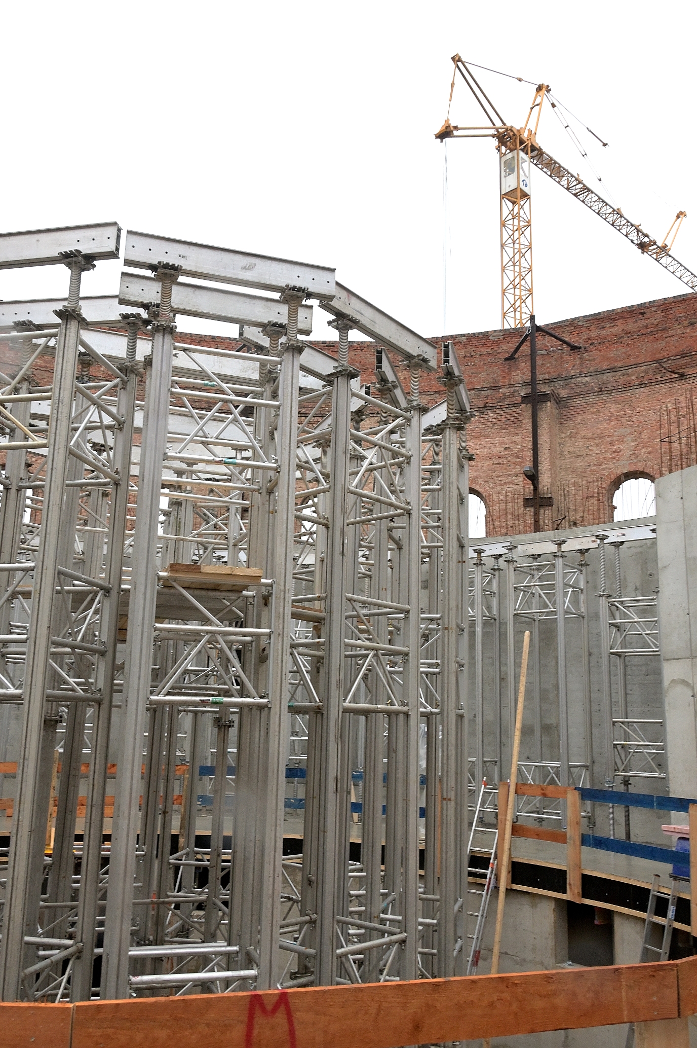 Seit Jahresbeginn sind die Baufortschritte im neuen Planetarium immer sichtbarer. Schalenartig wie eine Zwiebelhaut streben die Betonwände im Inneren des Gasometers nach oben zum Rand des alten Gebäudes. Erste Stützpfeiler aus Beton sind auch schon zu sehen. Sie stützen in der Folge die Zwischendecke zum oberen Teil des Planetariums. Das alte Industriedenkmal verändert sich von Monat zu Monat.