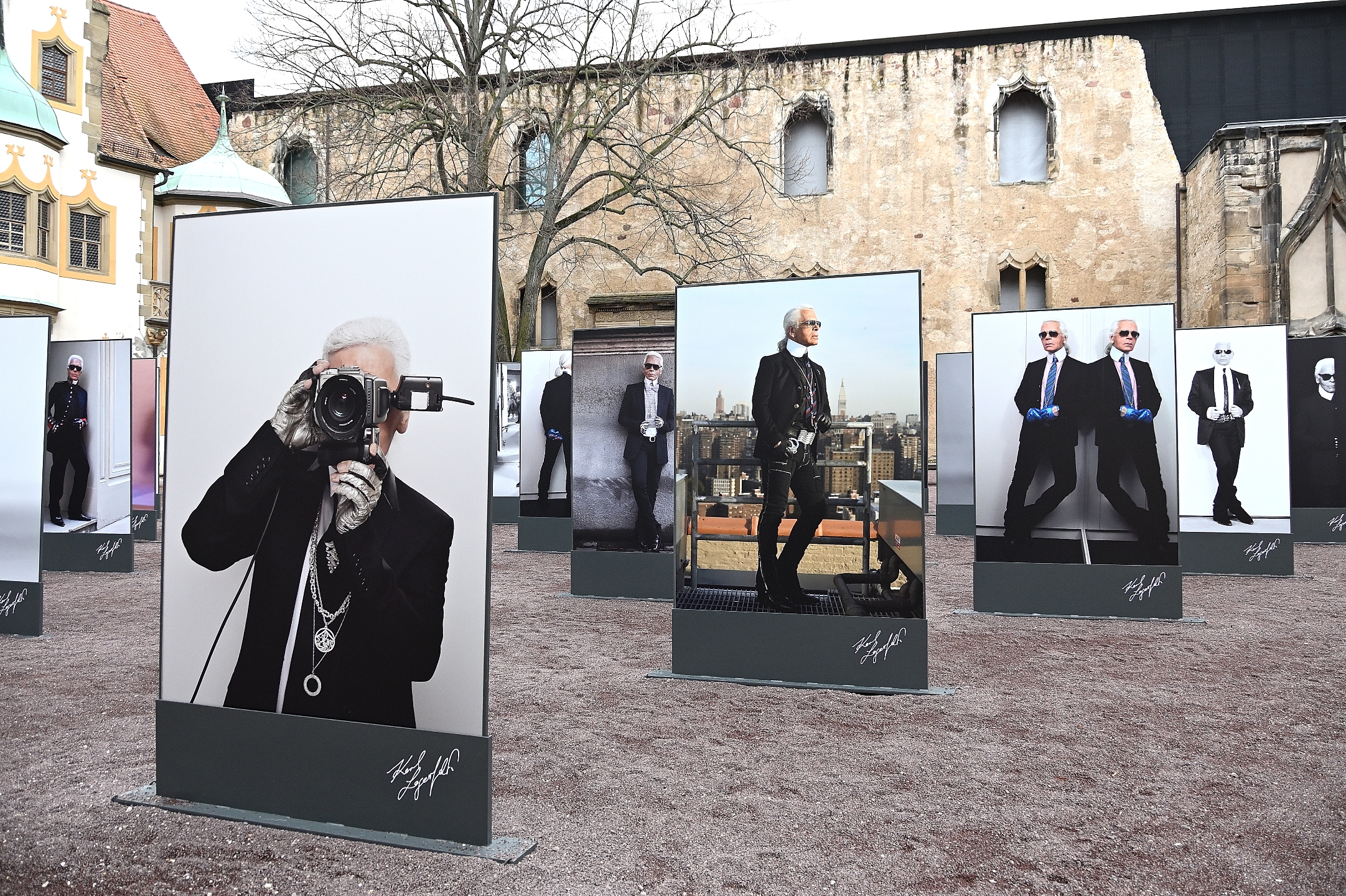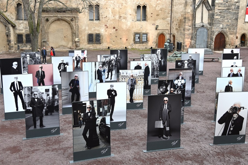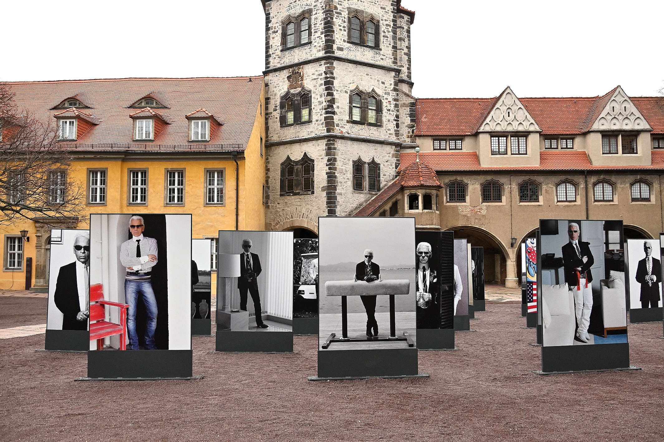 Die Kulisse im Hof der Moritzburg könnte ihm gefallen haben, denn er schien immer ein wenig aus der Zeit gefallen zu sein. Karl Lagerfeld, im vergangenen Jahr verstorben, hatte die noch die bevorstehende Ausstellung selbst geplant. Gleich 30mal ist er im Hof der Burg auf Großformatigen Bildwänden in unterschiedlichen Posen zu sehen. Das lässt keinen Zweifel, worum es in der Ausstellung geht. Es geht um Modedesign und Fotografie und einem Teil seines Lebenswerkes.