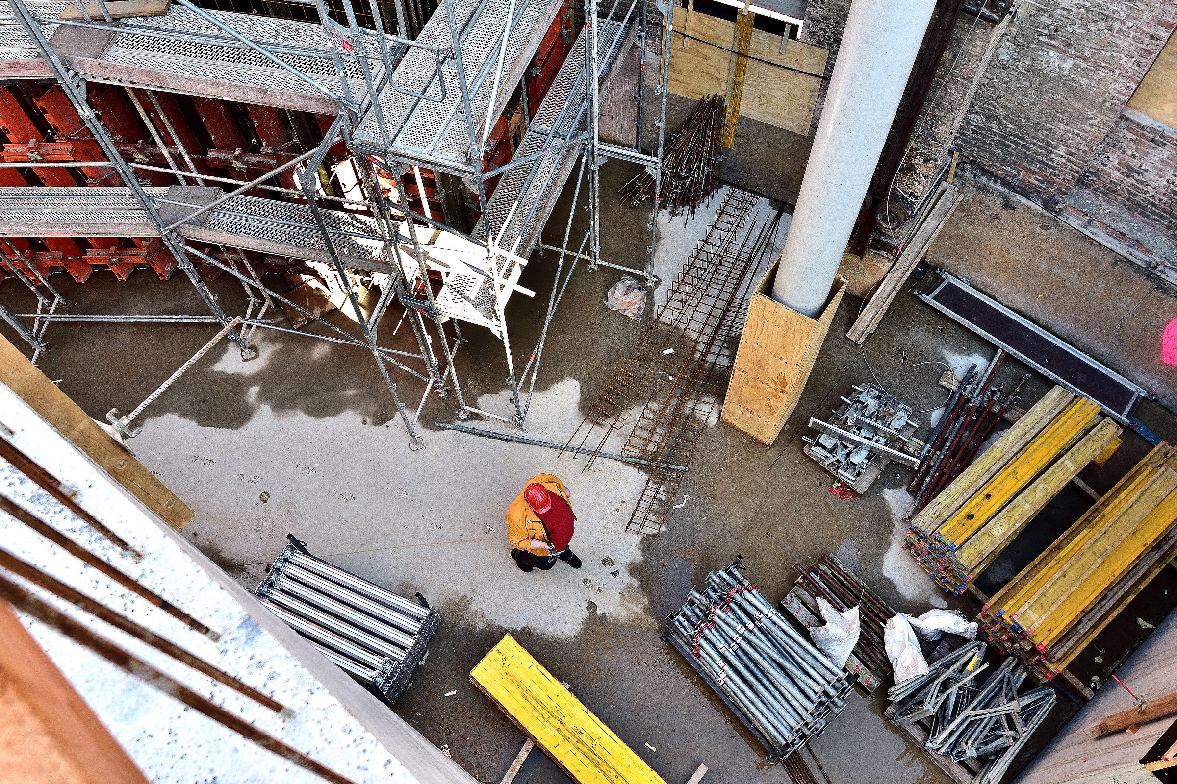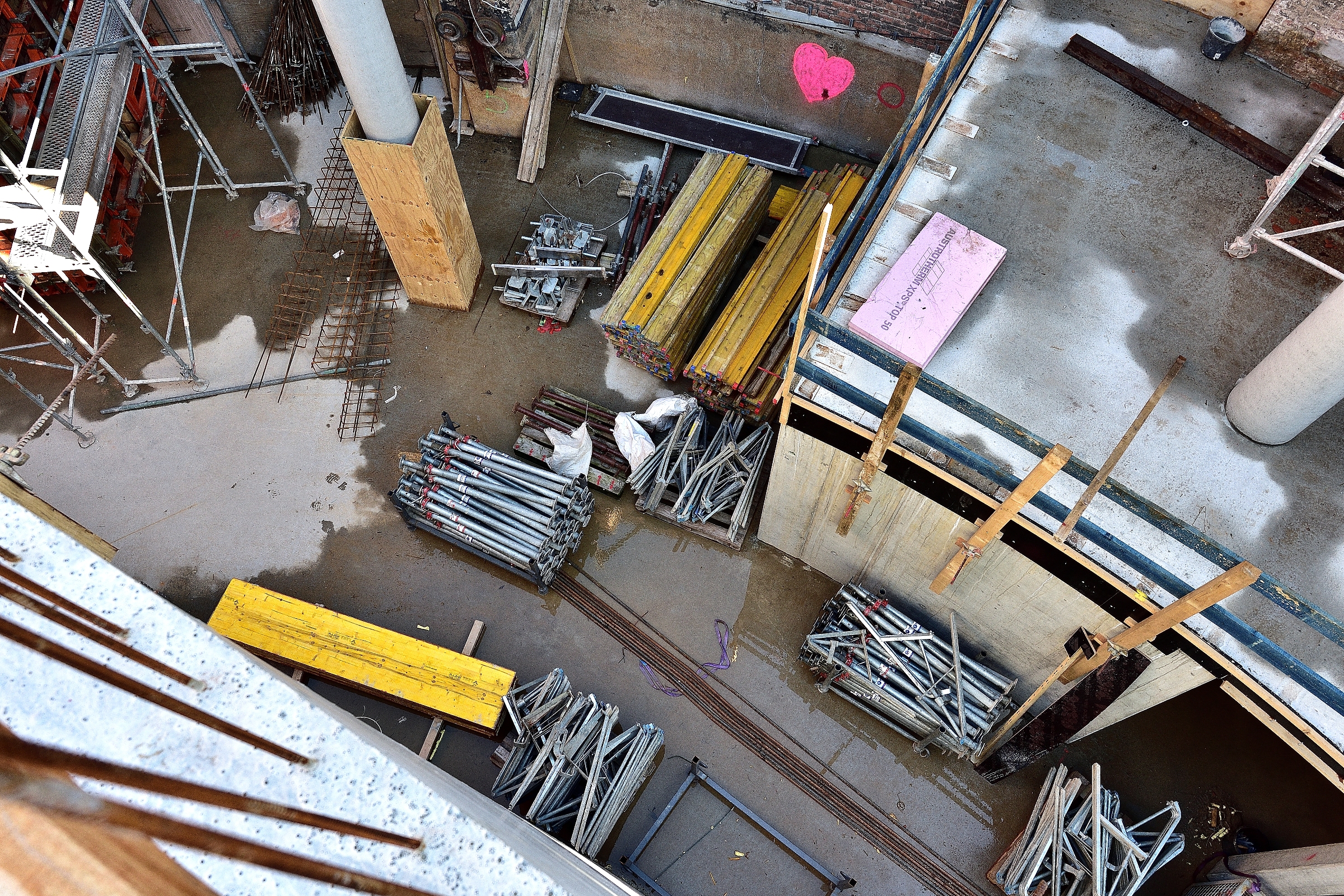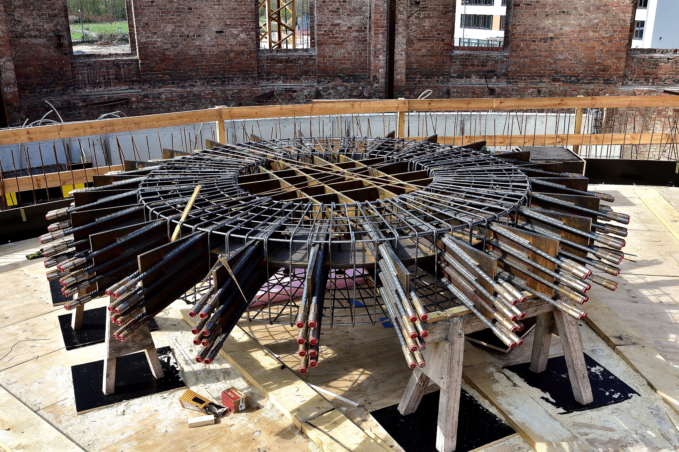 Seit Anfang März hat sich wiederum einiges getan auf der Baustelle im alten Gasometer. Von außen kaum sichtbar, verrichten die Bauleute im Inneren des Gasometers fleißig und ohne Pause ihre Arbeit. Kaum etwas kann man bei diesem Bauvorhaben mit anderen Baustellen vergleichen, weil alles ziemlich einmalig ist. Derzeit ist es ein Gewirr von Ständern und Schalungselementen. Während bis zur oberen Plattform alles eingerüstet wird, erfolgt gleichzeitig der Betonguß für die nach oben führenden spindelartigen Aufgänge. Auf der obersten Ebene ist schon das massive Kuppelteil aus Baustahl abgelegt, welches später die Spitze der Kuppel halten wird. In Höhe dieser Plattform wird in nächster Zeit eine Decke aus Beton gegossen.
