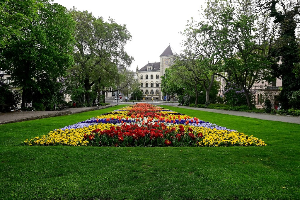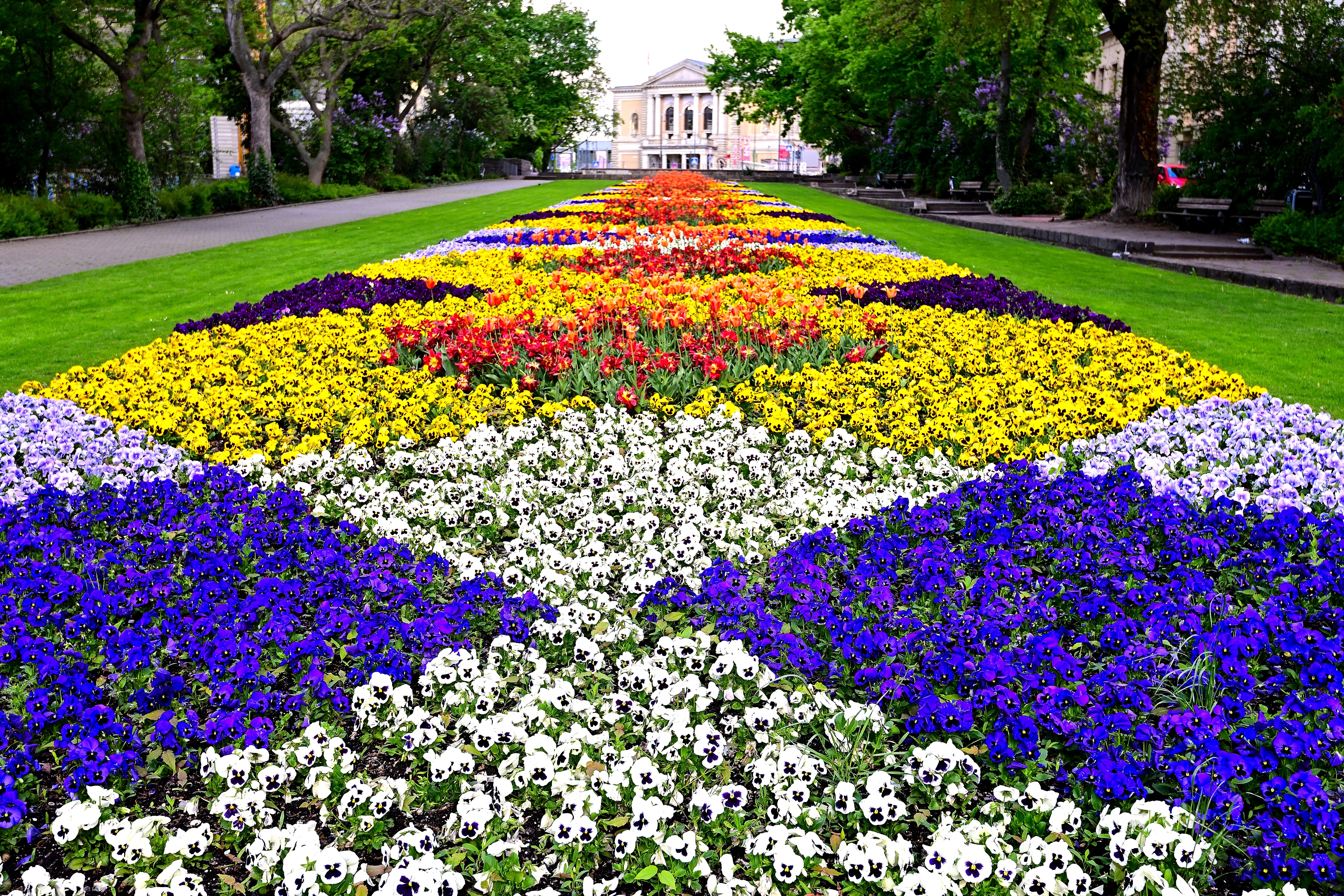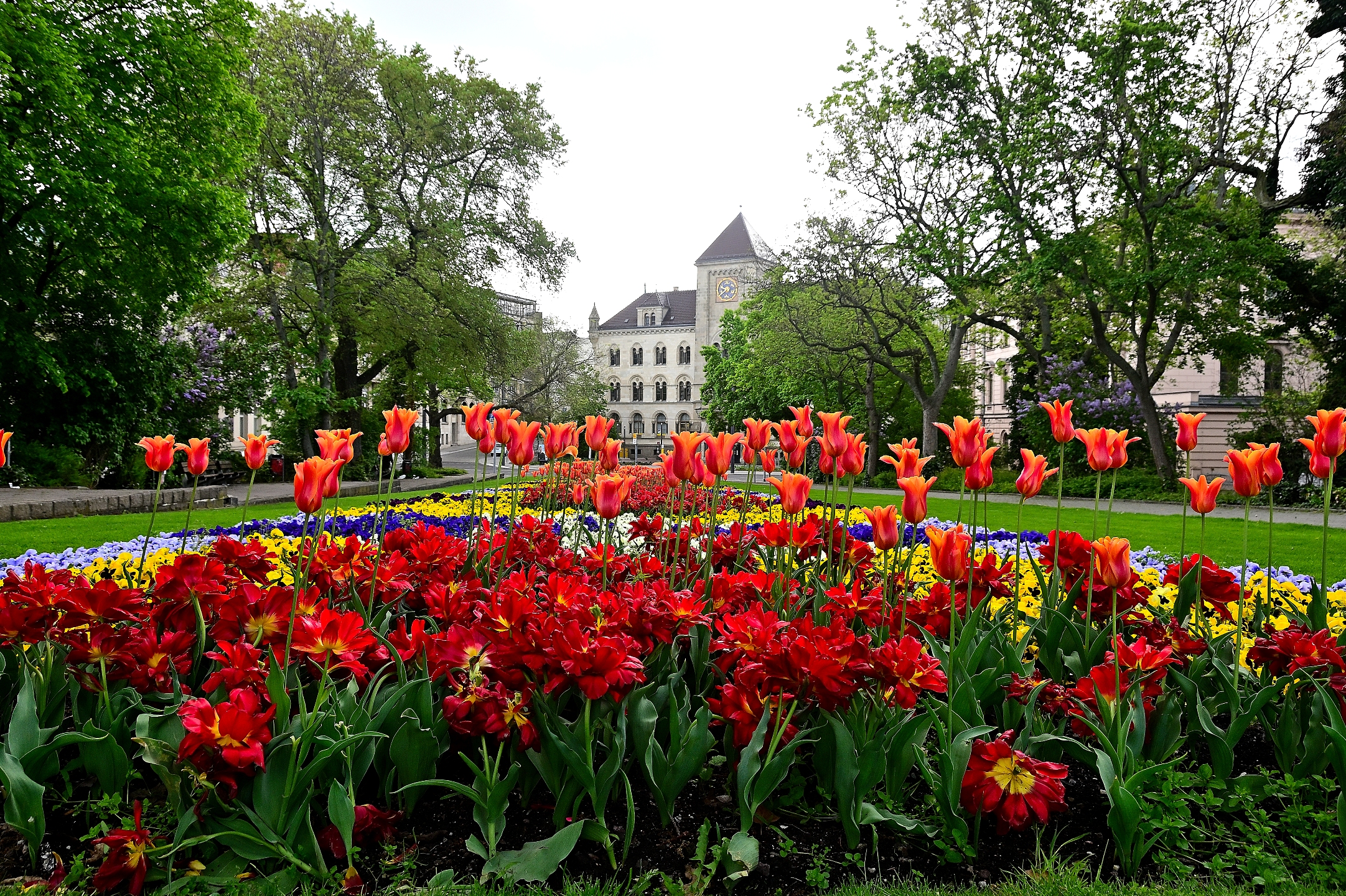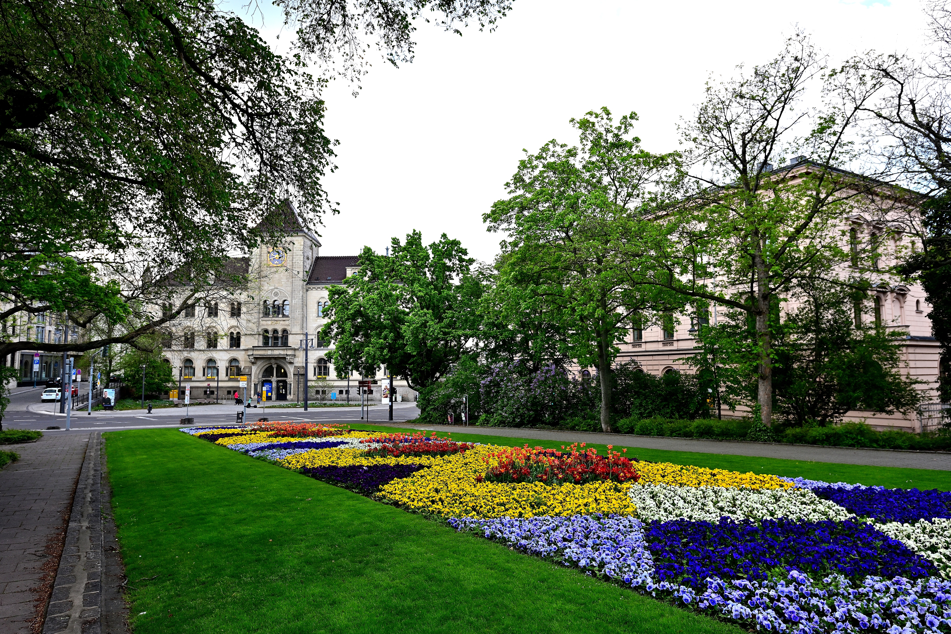 Einer der schönsten Plätze in Halle ist der Joliot-Curie-Platz mit seiner jährlich neu gestalteten Grünanlage zwischen der Hauptpost und der Oper.