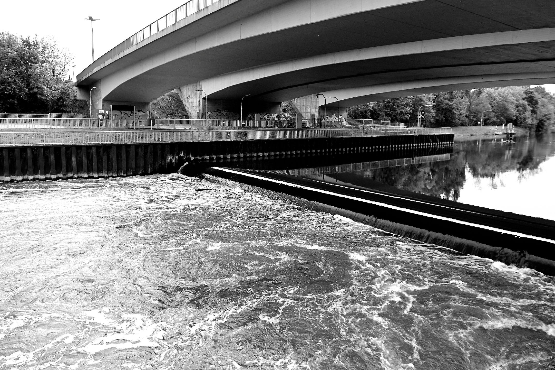 Die Hochstraße zwischen hallescher Altstadt und Neustadt ist wie eine Hauptverbindungsader und überquert in Höhe der Stadtschleuse die Saale. Fast genau über der Schleuse, gegenüber dem Multimediazentrum befindet sich die dreigeteilte mehrspurige Brücke.