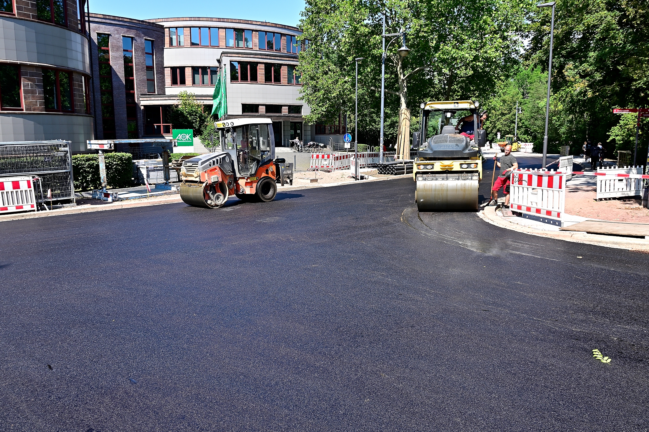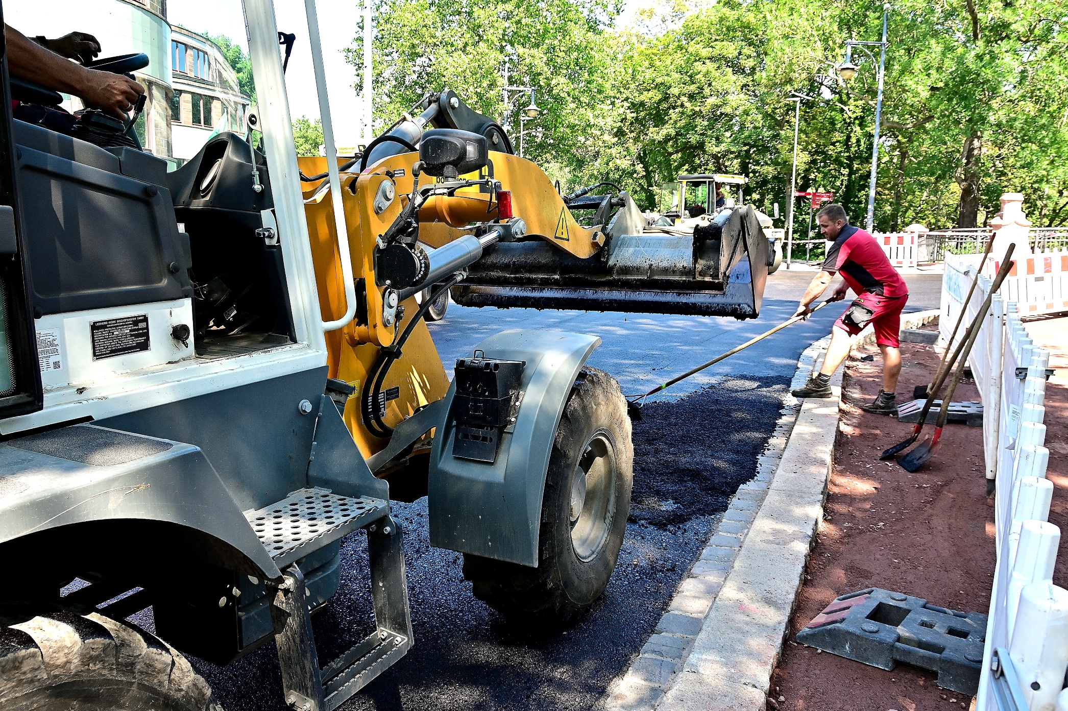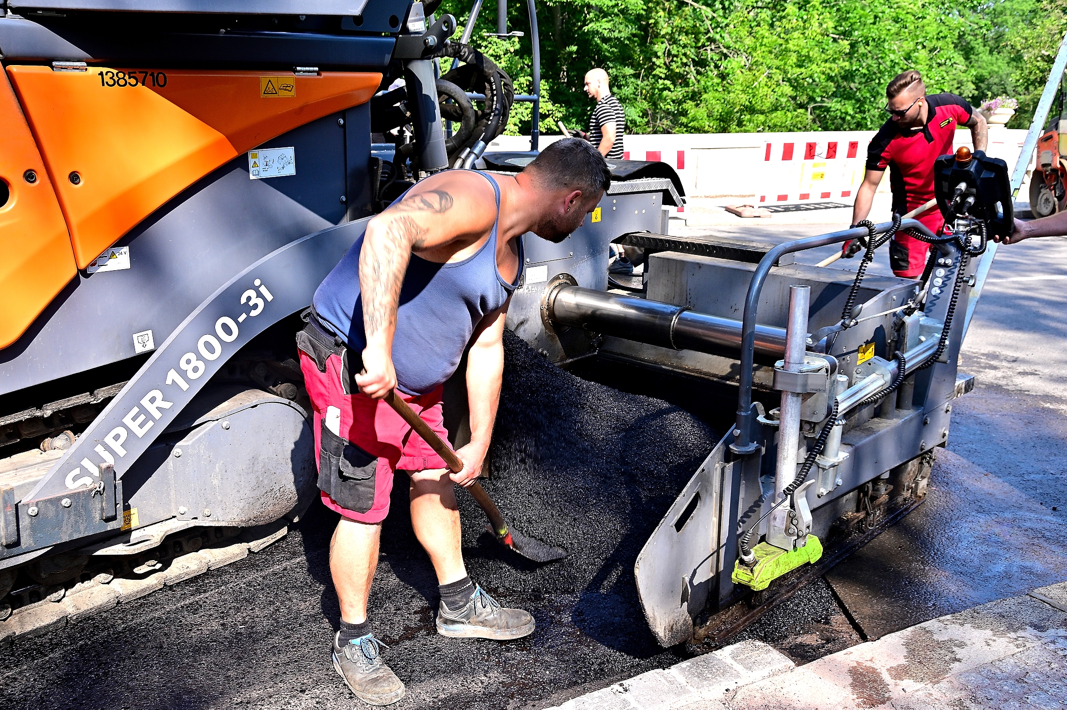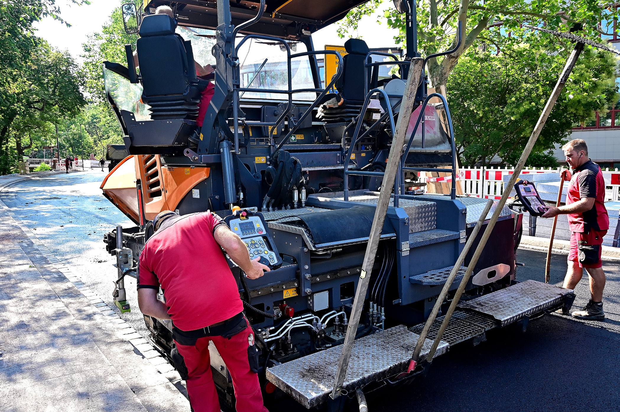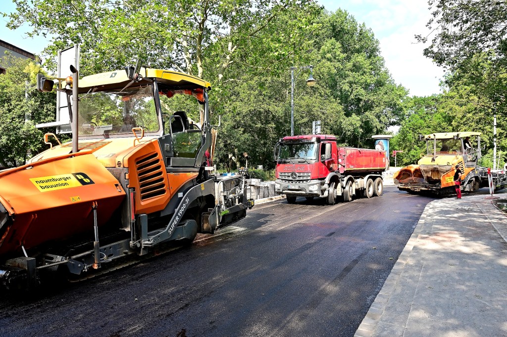 Mit frischen Kräften und der nötigen Großtechnik ging es heute im 1. Bauabschnitt auf dem Robert-Franz-Ring zur Sache. Baumaschinen der Naumburger Bauunion [https://www.naumburger-bauunion.de], die mit den Arbeiten betraut sind, haben ihre Großraumtechnik vom Typ „Super 1800-3 und 1900-3“ und weitere Spezialfahrzeuge in Stellung gebracht. Gegen 09:00 Uhr wurde die erste Ladung Bitumen von der Firma Papenburg aus Halle angeliefert. Die „Straßenfertiger“ wurden permanent und ohne Unterbrechung mit Bitumen befüllt. Schon nach ca. 3 Stunden war der Straßenbelag in einem Arbeitsgang zwischen der Pfälzer Brücke und Burgbrücke fertig und der Einbau der Fahrbahnoberfläche abgeschlossen. Der Untergrund wurde vorher mit Haftkleber eingestrichen, denn zwischen der bereits fertiggestellten Fahrbahn und der finalen Abdeckung muss ein guter Verbund hergestellt werden. Die Einbautemperatur von 170 Grad Celsius verbindet die Fläche unlösbar und verhindert auch das Eindringen von Wasser. Einige Feinarbeiten müssen dennoch mit Schaufel und Besen erledigt werden, bevor die Walzen im Abschluss alles schön glätten und zum Schluss noch Splitt einwalzen.