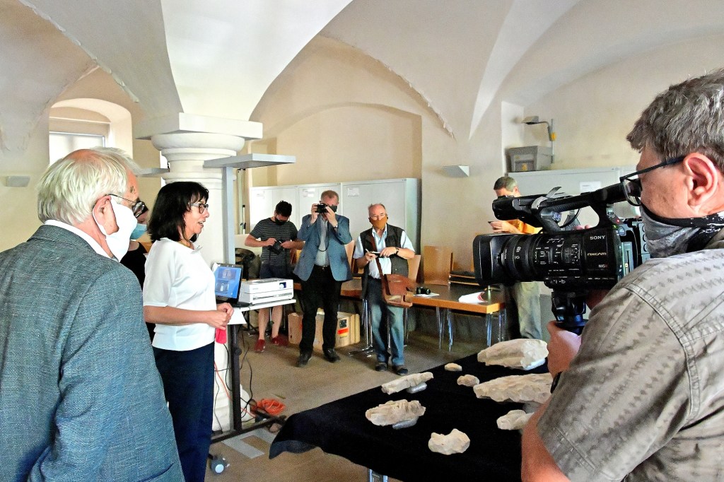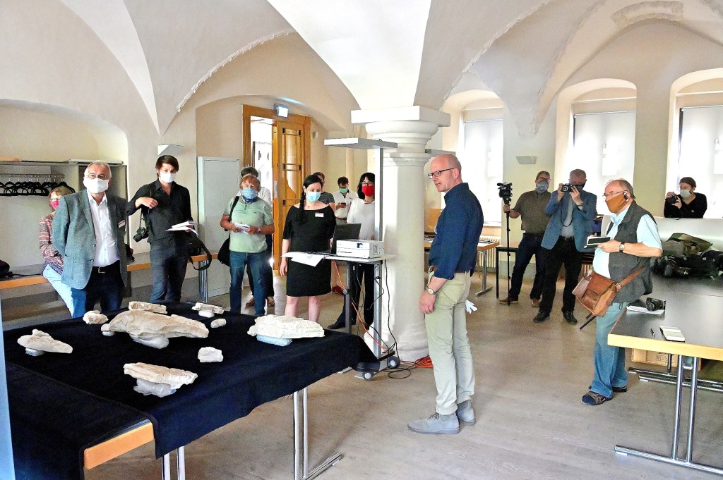 Nur wenige Kilometer von Halle entfernt, im Landkreis Mansfeld Südharz, konnten bei Aufgrabungen im 19. Jahrhundert sowie in den 1970er und 1990er Jahren, auf dem Gelände der ehemaligen Klosterkirche in Gerbstedt mehr als 400 Stuckfragmente aus dem Hochmittelalter geborgen werden. Die Kirche des im Jahr 985 gegründeten Klosters wurde im 16. Jahrhundert aufgegeben und war bereits 1650 eingestürzt. Mit Beginn des 19. Jahrhunderts war von ihr nichts mehr zu sehen. Vermutlich diente sie als eine der Grablegen der Wettiner. Heute ist sie weitgehend überbaut, deshalb konnten nur kleine Teile des Areals ausgegraben werden. Eine Auswahl der Artefakte wurde heute im Rahmen einer Presseinformation durch Vertreter des Landesamtes für Denkmalpflege und Archäologie Sachsen-Anhalt gezeigt und erläutert. Darunter sind Fragmente eines Schreitenden, der Kopfe eines jungen Mannes oder Engels bzw. einer Drachenfigur, das Fragment einer Löwenfigur und einer Bettdarstellung, ein Teil eines Frieses mit Vögeln und Ranken sowie der Teil eines Frieses mit Akanthuszier. Die Fragmente stammen vermutlich aus dem ersten Viertel des 12. Jahrhunderts, zeigen ornamentale und figürliche Darstellungen unterschiedlicher Dimension und von hoher Qualität. Sie bestehen aus mehrlagig auf das Mauerwerk aufgetragenem Hochbrandgips, aus denen dann die Motive von Hand ausgeschnitten wurden. Wenig übriggebliebene Farbreste lassen den Schluss zu, dass die Reliefs und Skulpturen zumindest teilweise bemalt waren. Unterstützt wird die Konservierung, öffentliche Präsentation und Publikation der umfangreichen Funde durch die Ernst von Siemens Kunststiftung. Die Restaurierung aller Artefakte soll nach Aussagen des Landesamtes bis zum Jahr 2021 abgeschlossen sein und eine repräsentative Auswahl Teil des neuen Abschnittes der Dauerausstellung des Landesmuseums für Vorgeschichte in Halle (Saale) werden. Reste der Klosteranlage, insbesondere unterirdische Gänge, sind im Museums- und Bürgerhaus in Gerbstedt zu sehen.