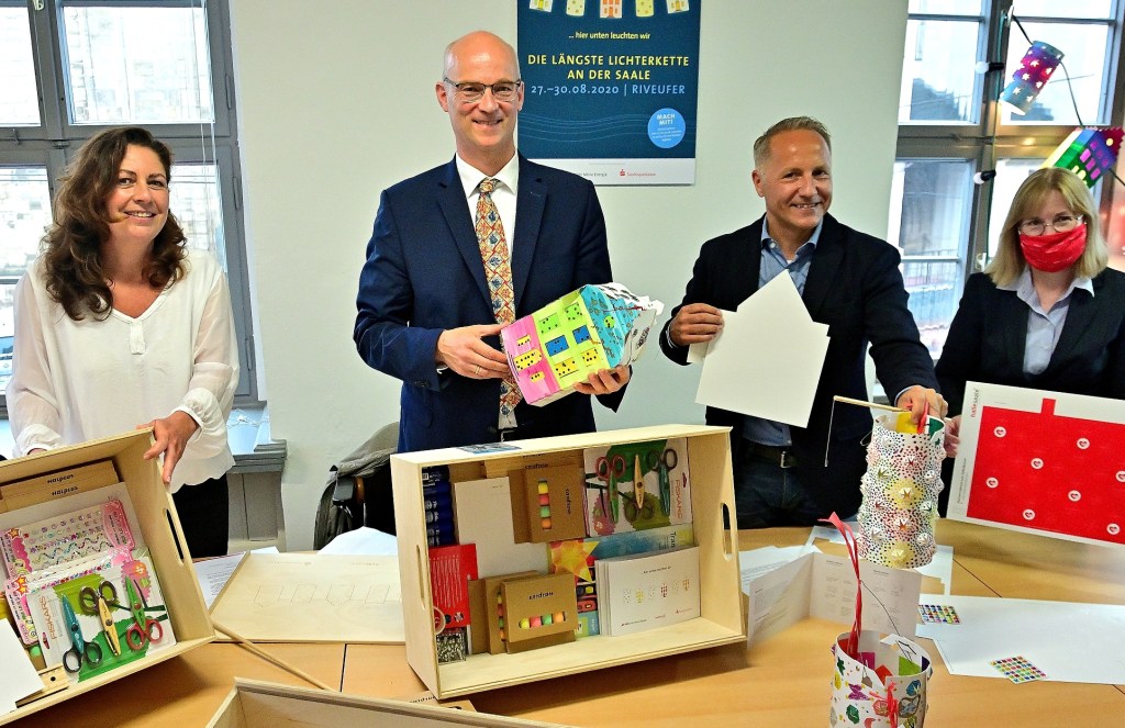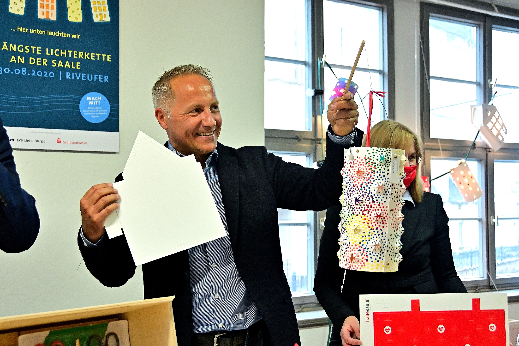 Mehr als 3.900 Kinder aus 60 halleschen Kindertagesstätten und Horten sollen sich an der Aktion der Stadt Halle, unterstützt von den Stadtwerken Halle und der Saalesparkasse beteiligen. Ziel ist es, die längste Lichterkette an der Saale zu gestalten. Dazu wurden eigens 100 Laternenbastel-Kisten mit jeweils 50 Bastelbögen für Häuser- und Straßenlaternen gepackt. Alles was zum basteln benötigt wird, ist darin enthalten, Schere, Malstifte, Klebestift, Bastelanleitung und sonstige Accessoires. Die Idee wurde entwickelt, weil in diesem Jahr einige Veranstaltungen auf Grund der CORONA-Regeln nicht wie gewohnt und geplant durchgeführt werden können. So auch das Laternenfest auf der Peißnitz. Daraus ist die Laternenaktion entstanden. Mit der Aktion soll auch die Attraktivität der Saale mit ihrer Flaniermeile am Riveufer mehr in den Vordergrund gerückt werden und einen Ausblick auf das Laternenfest 2022 geben.