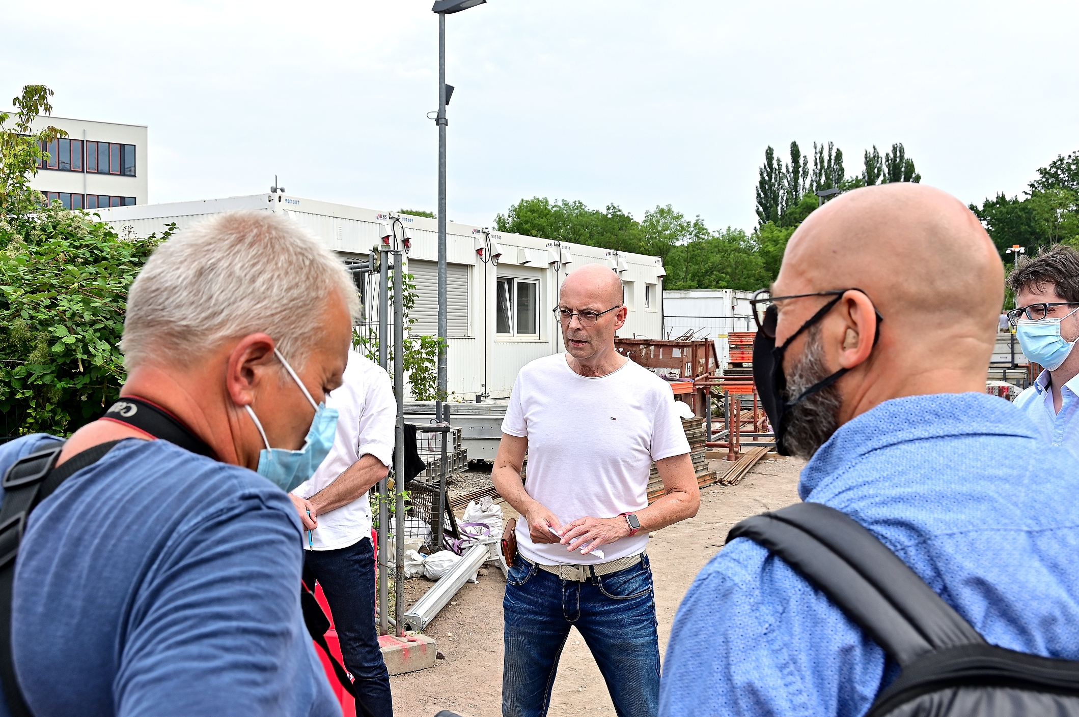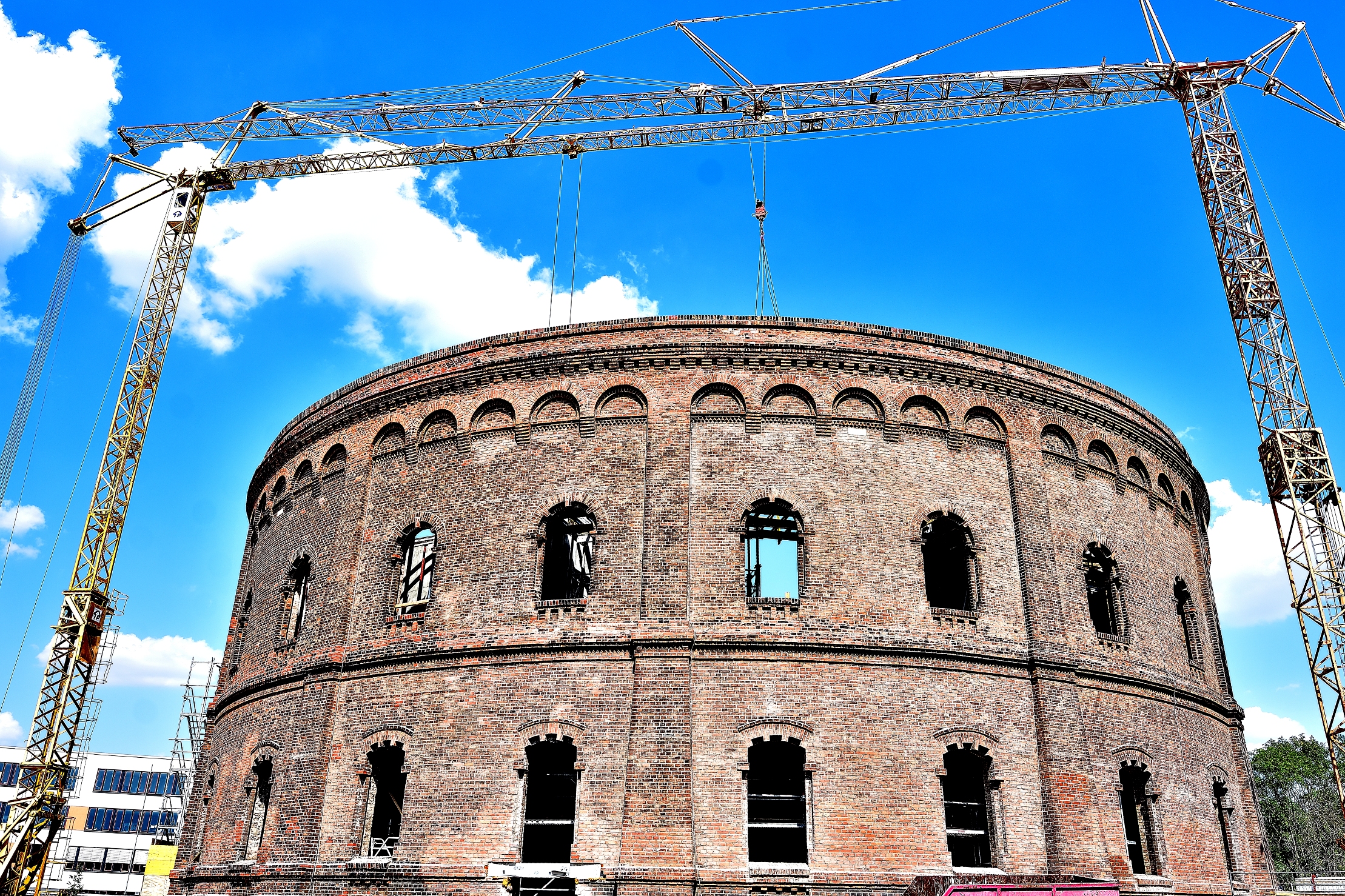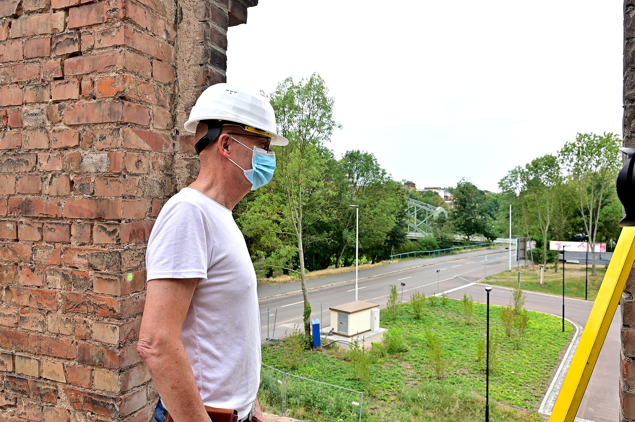 Zu einer Baustellenbegehung im alten Gasometer auf dem Holzplatz hatte gestern der Oberbürgermeister der Stadt Halle, Dr. Bernd Wiegand eingeladen. Von außen nur schwer einzusehen, entsteht im Innenraum der historischen Bausubstanz das nach Angaben von Dirk Schlesier, Leiter des halleschen Planetariums, das größte Planetarium von Sachsen-Anhalt. Das 1889 bis 1891 errichtete Gebäude wurde bis 1972, dem Datum seiner Außerdienststellung, als Gaswerk genutzt. Seit 2019 wird nun im Innenraum gebaut. Die Herausforderung so Objektplaner Christoph Mumm, ist die runde Schalung ohne Ecken und Kanten, die sich bis zum oberen Rand des Gasometers erstreckt und etwas scherzhaft von ihm angemerkt, „Gerade kann jeder – rund kann fast keiner“. Der Beton muss außerdem äußerst präzise verbaut werden, denn es soll „Sichtbeton“ sein, das heißt, die Flächen werden nach Fertigstellung weder verputzt noch verblendet.