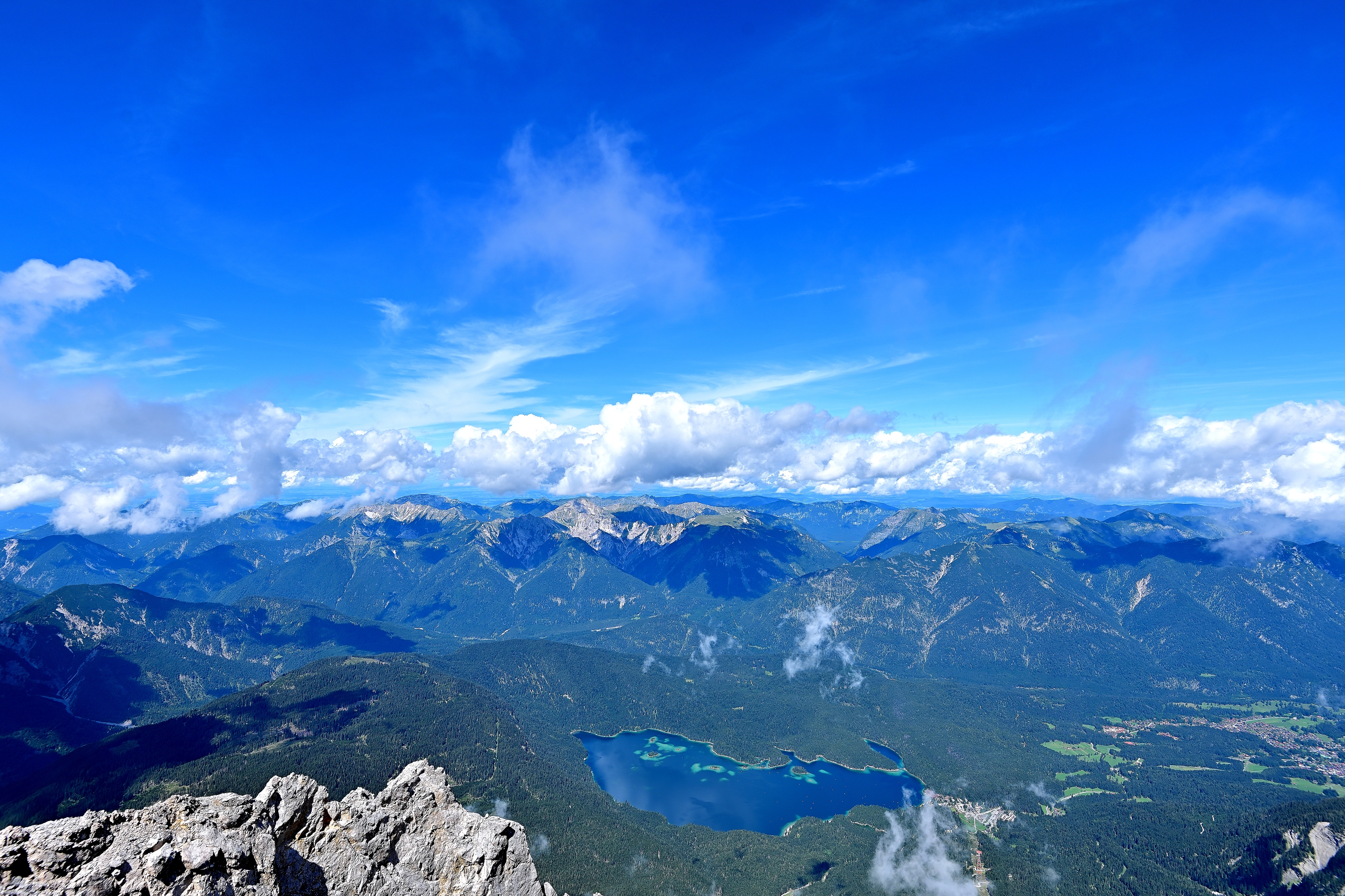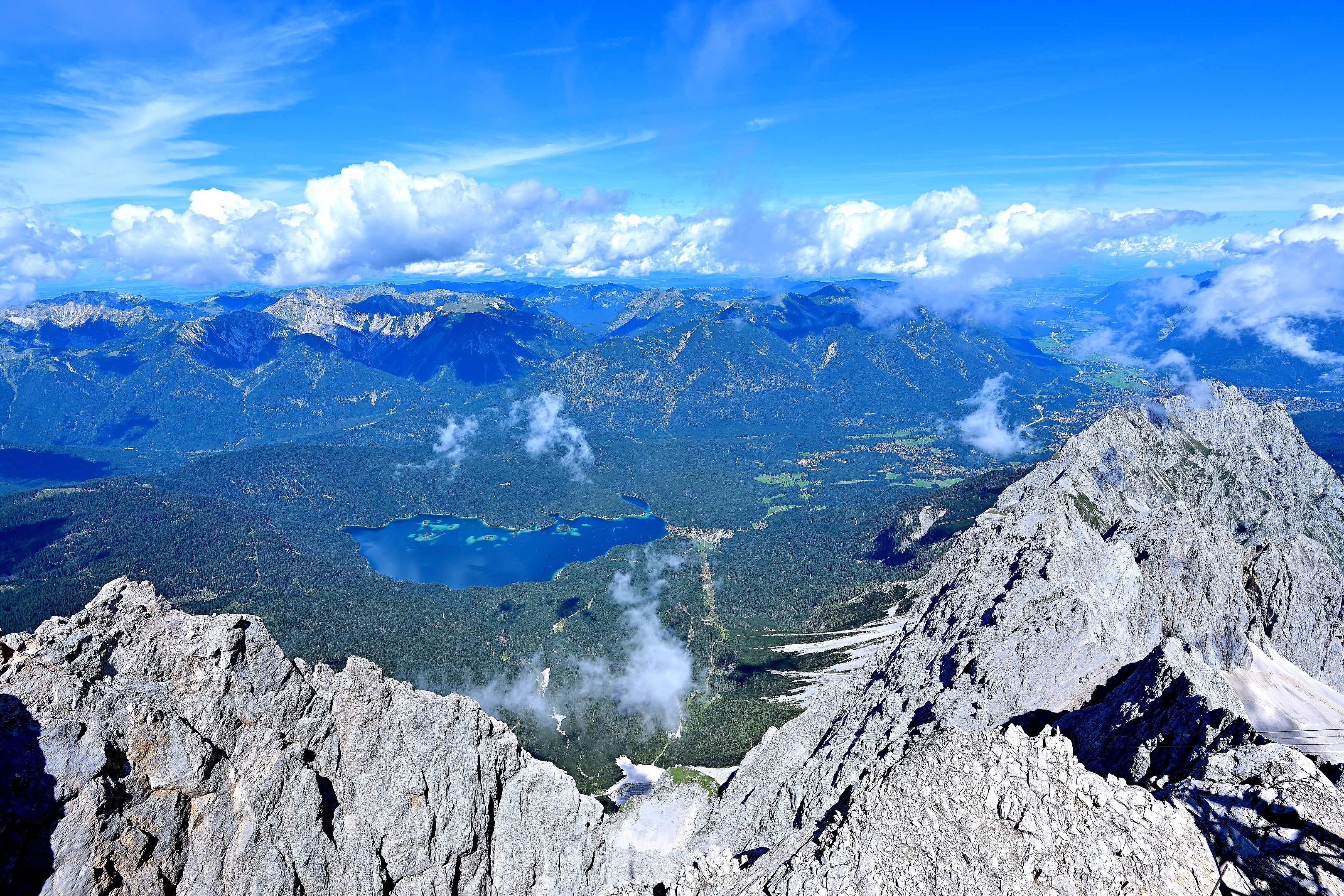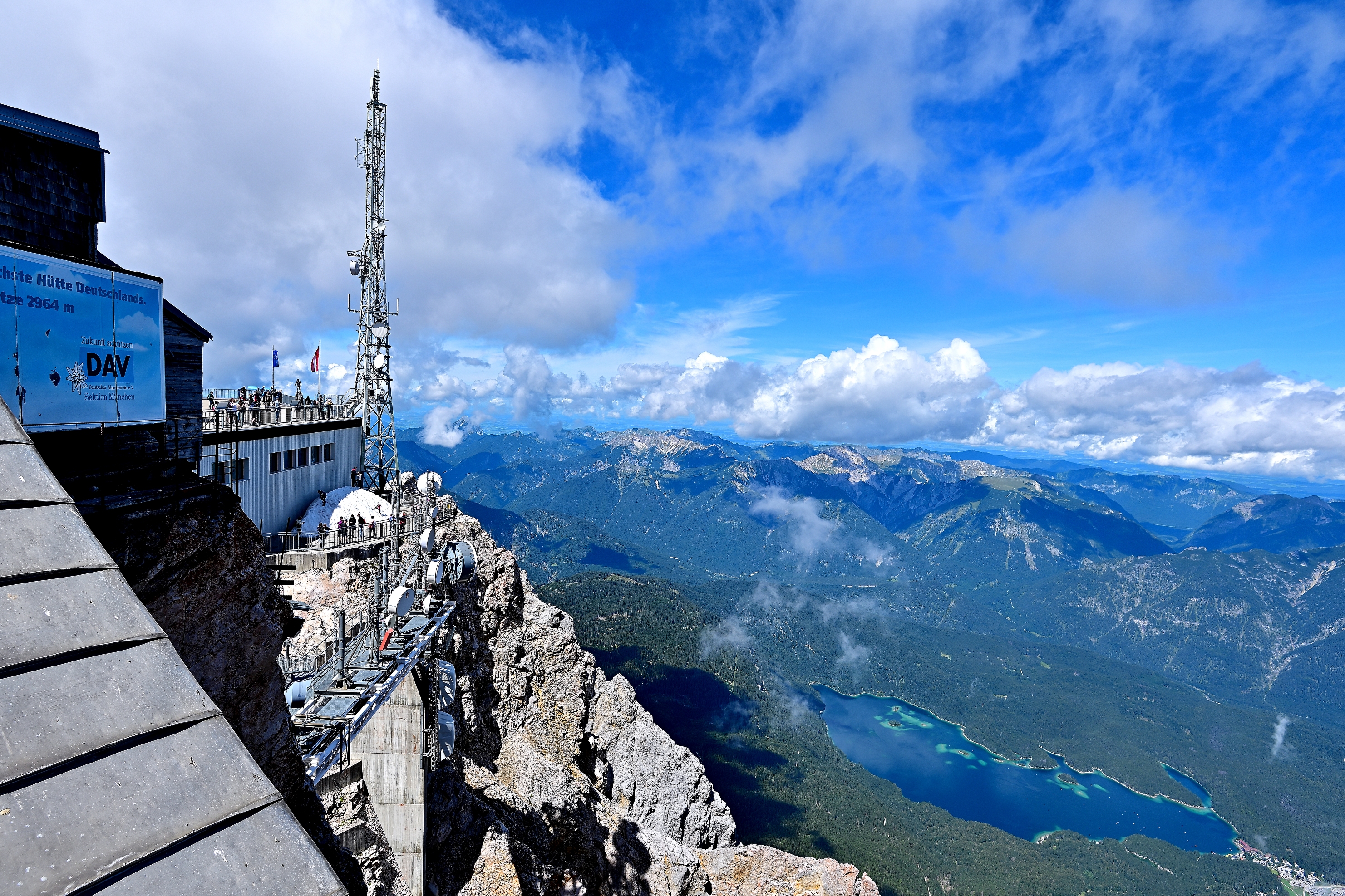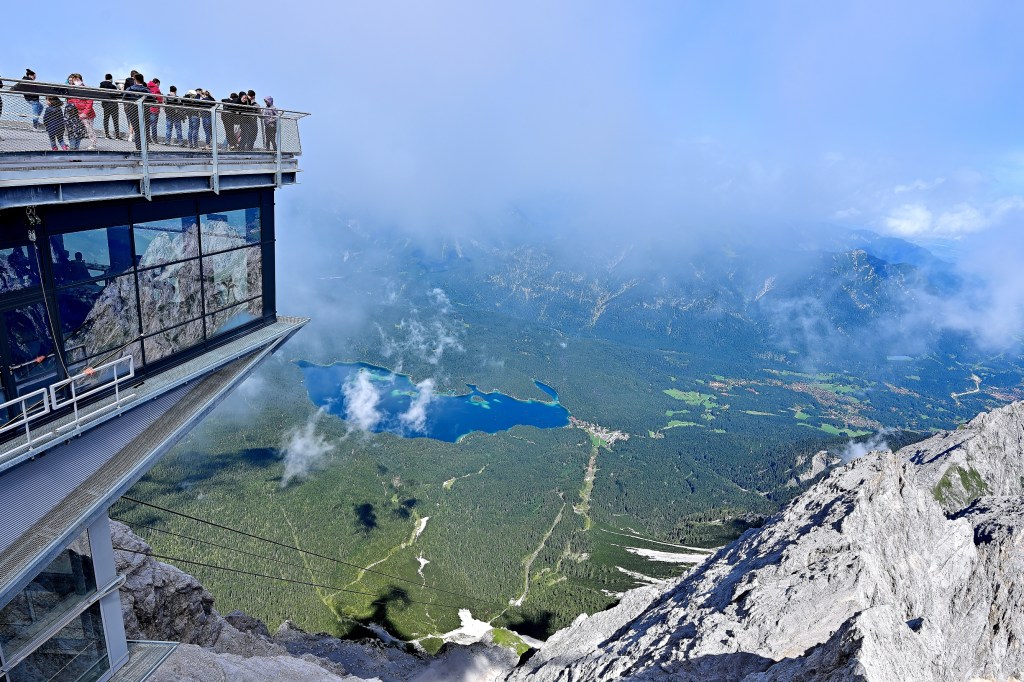 Unglaubliches Glück mit dem Wetter muss man schon haben. Obwohl auf dem Gletscher, unterhalb der Zugspitze die Temperaturen mindestens 10 Grad weniger als unten im Tal sind, kann die Sonne kräftig auf der Haut brennen. Wichtiger ist aber, dass es keinen Nebel oder Regen gibt und damit die Sicht weit ins Land möglich ist. Auf 2.962 Meter Höhe gibt es da einen grandiosen Ausblick, nicht jedermanns Sache. Nicht wenige wagen dennoch den nicht ungefährlichen Übergang zum goldenen Gipfelkreuz. Nach den umfangreichen Umbauten der letzten Jahre ist der Platz enorm gewachsen, die Preise auch.