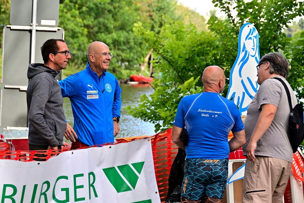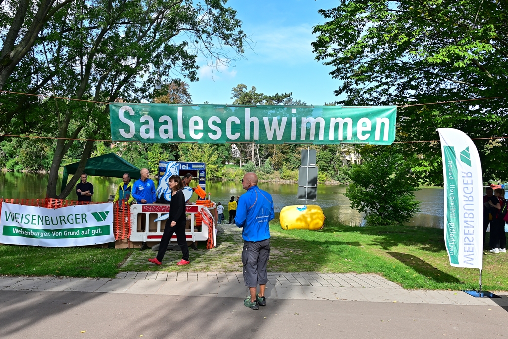 Wegen CORONA verschoben von Juni auf den heutigen Sonntag und nach hartnäckigen Verhandlungen und der Vorlage eines strengen Konzeptes durch Klaus-Dieter Gerlang vom Saaleschwimmer-Verein, findet heute das 14. Saaleschwimmen statt. Obwohl es noch einmal ein schöner sonniger Tag ist, merkt man an Temperaturen, es ist Herbst. Die Wassertemperatur von 18°Celsius ist fast identisch mit der Lufttemperatur. Das kostet schon Überwindung von den teilnehmenden Schwimmern, die es sich wagen ins Wasser zu steigen. Für das „Kleine“ Saaleschwimmen haben sich 50 Teilnehmer gemeldet und für das „Große“ mehr als 300. Startpunkte sind entweder unterhalb der Burg Giebichenstein bzw. am Saalestrand an der Ziegelwiese. Am Ufer in Höhe der Emil-Eichhorn-Straße ist in diesem Jahr das Ziel für die Schwimmer.
