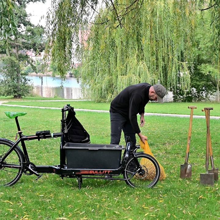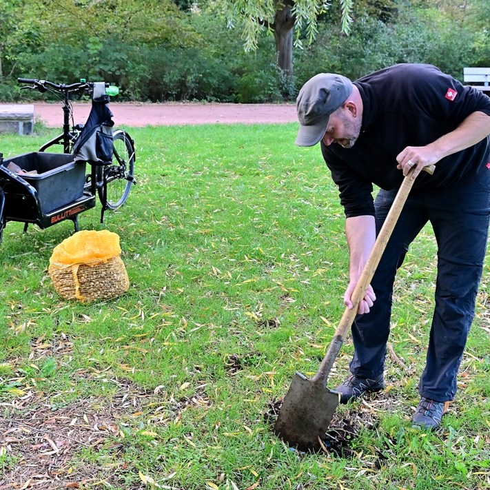 Im Jahr 2014 wurde die Aktion „Halle blüht auf!“ erstmalig durchgeführt. Seitdem werden jährlich um die gleiche Zeit an verschiedenen Stellen in der Stadt Blumenzwiebeln gesteckt. Initiator ist der Landtagsabgeordnete und Mitglied des Stadtrates von Halle für die Grünen, Wolfgang Aldag. Er hat sich das Ziel gestellt, 1 Million Blumen im Stadtgebiet von Halle zu pflanzen. Interessierte Bürgerinnen und Bürger können sich daran beteiligen. An diesem Sonnabend und Feiertag ist er auf der Grünfläche am Eichendorff-Denkmal schon ab 10:00 Uhr mit Spaten und guter Laune bei der Arbeit. Heute sollen 6.000 Krokuspflanzen in die Erde gesteckt werden. Mit seinem Lastenfahrrad angeliefert, ohne große Vorbereitung, geht es zur Sache. Die Aktion ist mit dem Grünflächenamt abgesprochen.