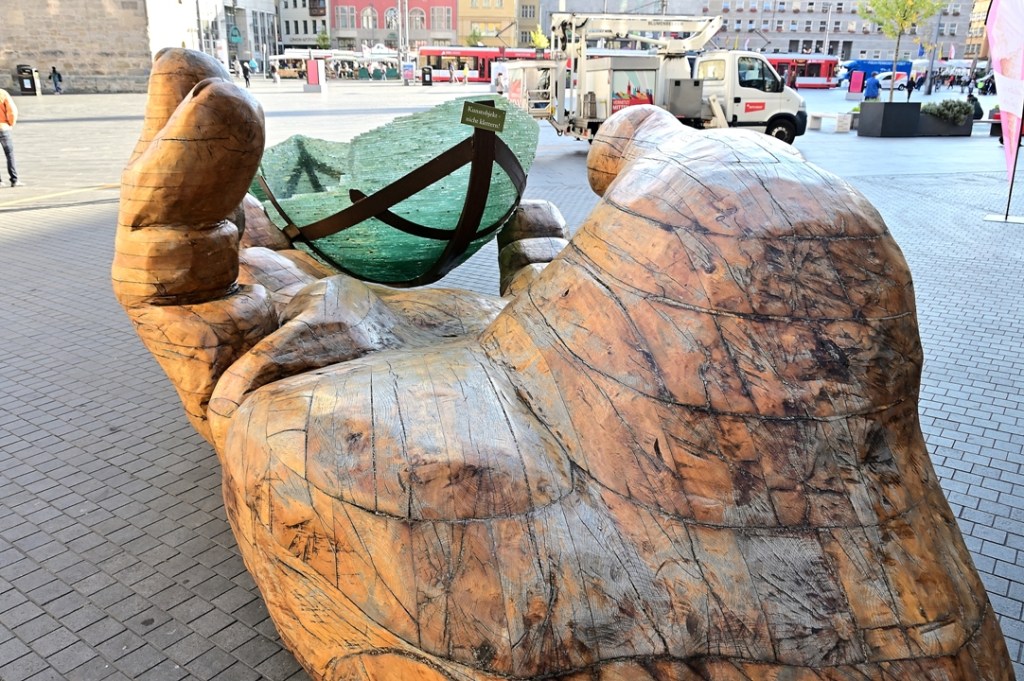 Seit Dienstag steht sie auf dem Marktplatz von Halle, die Arche aus Glas und eine riesige Hand aus Holz. Beides zusammen ergibt ein Kunstwerk des Holzkünstlers Christian Schmidt. Nach Aussagen des Initiators des Projektes, Rainer Helms, versinnbildlicht das Kunstwerk ein Symbol der göttlichen Schöpfung. Die aus der Hand gleitende Arche aus Glas stellt gleichsam die Zerbrechlichkeit der Natur dar. Die große hölzerne Hand steht für die Menschheit, der die Arche symbolisch aus der Hand gleitet.