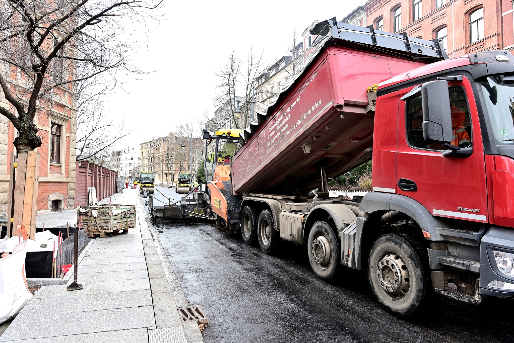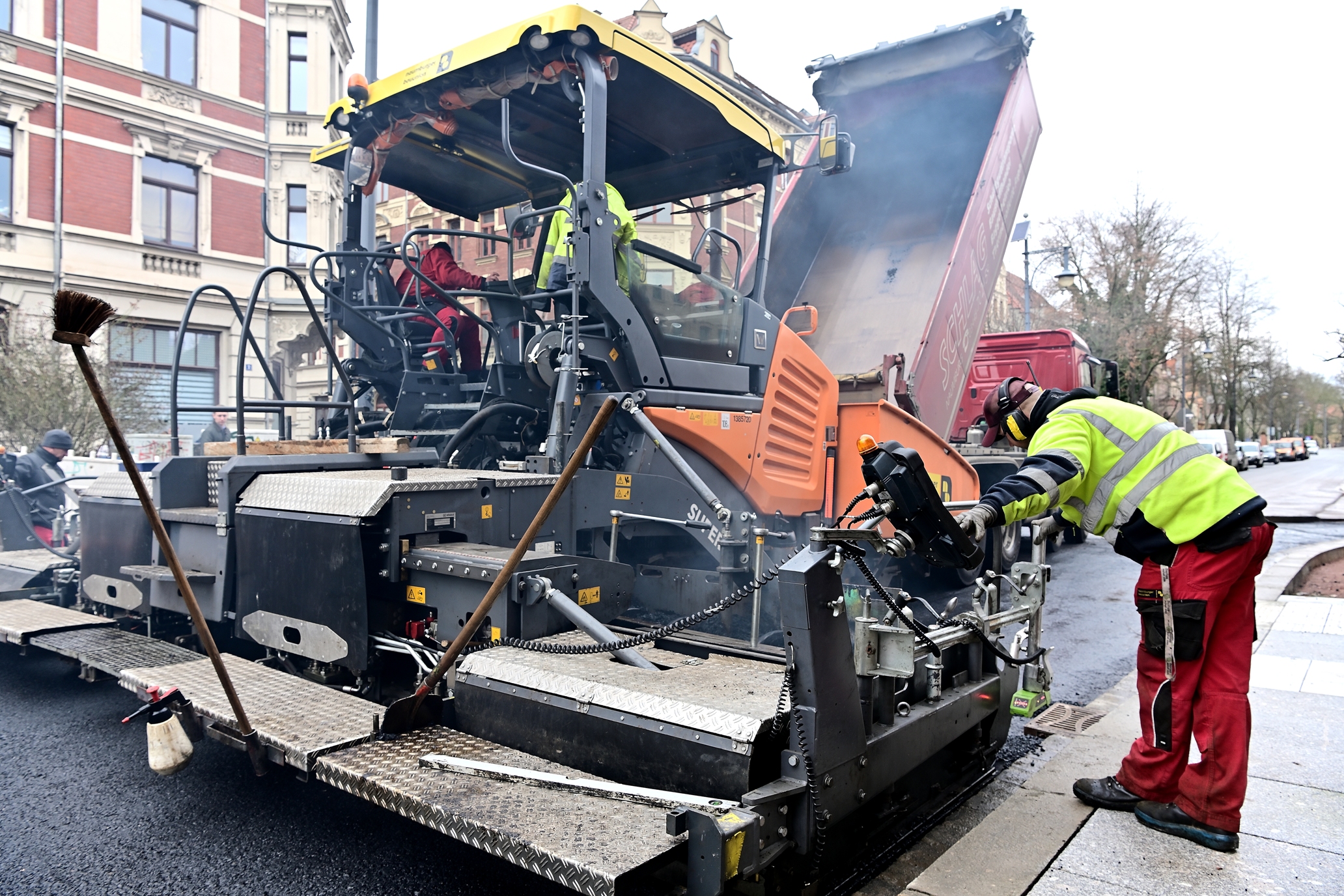 Es hat nur wenige Stunden heute gedauert und die Fahrbahndecke war auf die Gesamtfläche des Straßenabschnittes aufgebracht. Dazu wurden Spezialmaschinen der Firma Bauunion Naumburg vom Typ „Straßenfertiger – Super 1900-3i“ eingesetzt. Die Maschine kann auf der gesamten Fahrbahnbreite das durch Transportfahrzeuge angelieferte Bitumen in kürzester Zeit verbauen. Dampfwalzen erledigen die Restarbeit, indem sie den noch warmen Straßenbelag verdichten. Das ist allerdings noch nicht das finale Produkt. Etwa 1-2 Zentimeter bis zur geplanten Ebene sind noch frei. Der endgültige Straßenbelag wird dann aufgetragen, wenn links und rechts die Fußwege saniert sind. Während die Straßenseite zur Saale hin mit dem Metallgeländer fast fertig ist, muss der Fußweg auf der Häuserseite noch einschließlich der Tiefbauarbeiten erneuert werden.