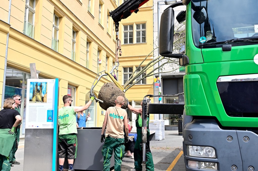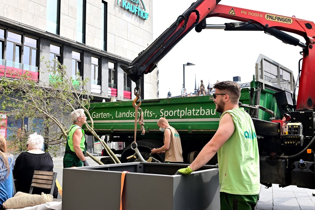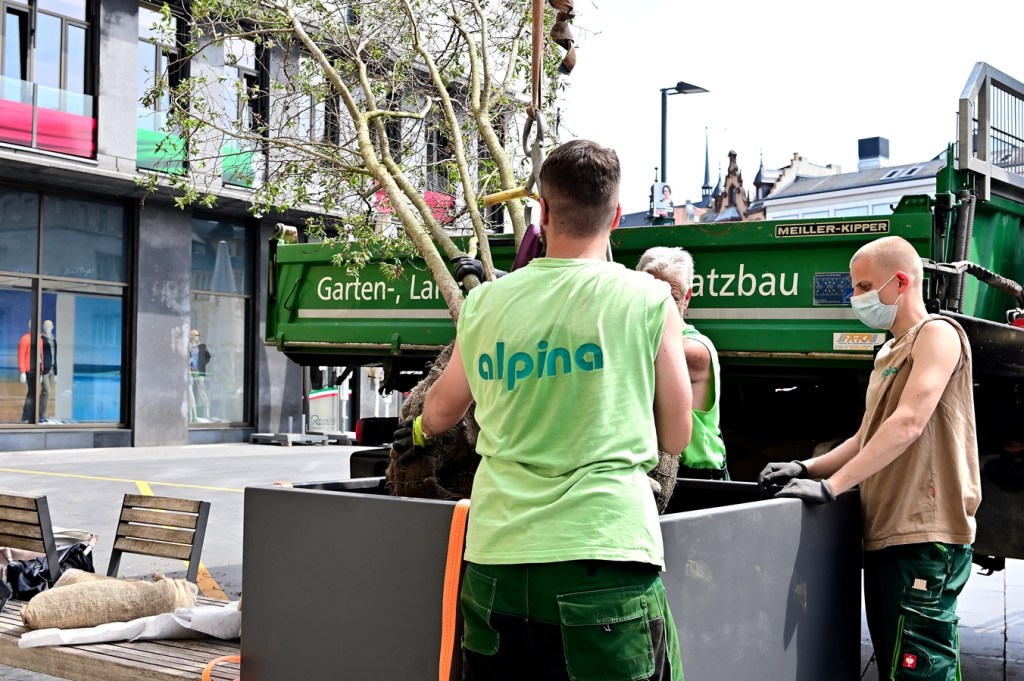 Die Pflanzkübel sind etwas größer, als die auf dem heimischen Balkon. Deshalb muss auch extra dazu ein Kran aufgefahren werden und kräftige Mitarbeiter von der Firma alpina [https://www.alpina-ag.de/home] müssen ordentlich zupacken, um die bereits vorgezogenen Pflanzen ordnungsgemäß in die Kübel einzubringen. Wie angekündigt, wird derzeit der Marktplatz mit Grünpflanzen aufgehübscht.