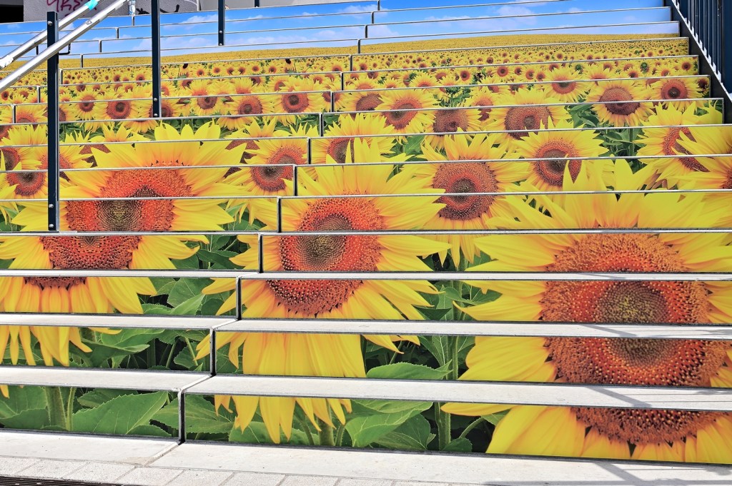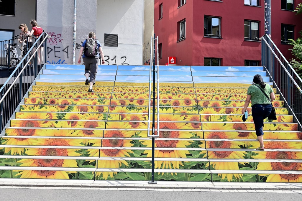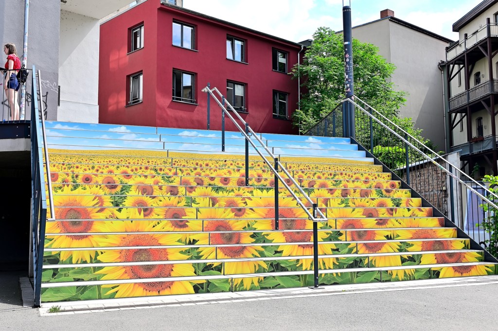 Unlängst wurde die Treppe zwischen Hallmarkt und Markt als Blickfang gestaltet. Im Auftrag der Stadtwerke hatte das Team von „MachArt“ die Treppenstufen mit Blumen und Schmetterlingen verschönert. Ab heute ist nun ein weiteres Gestaltungswerk dazugekommen. Die Treppe vom Steintor-Campus zum Steintor wurde bunt und sommerlich verziert. Zu sehen ist ein großes Sonnenblumenfeld und blauer Himmel. Ein weiterer Hingucker in der Stadt. Bleibt abzuwarten, welche Treppe als nächstes ein neues Outfit und mit welchem Motiv erhält.