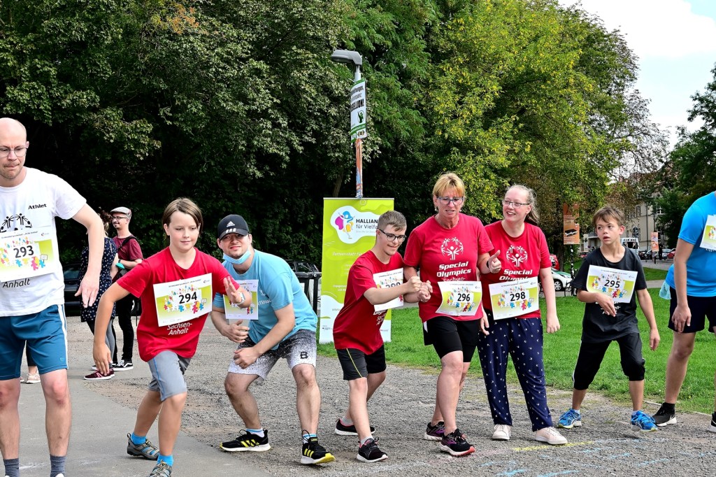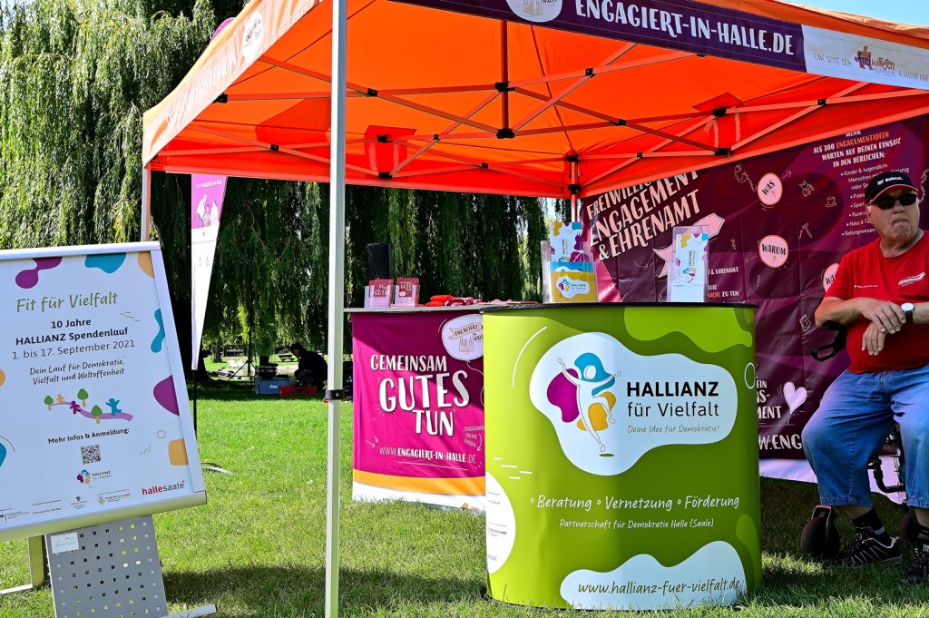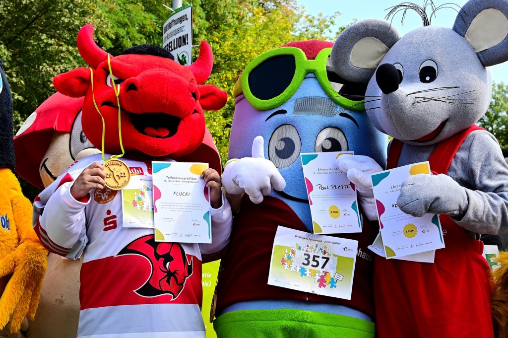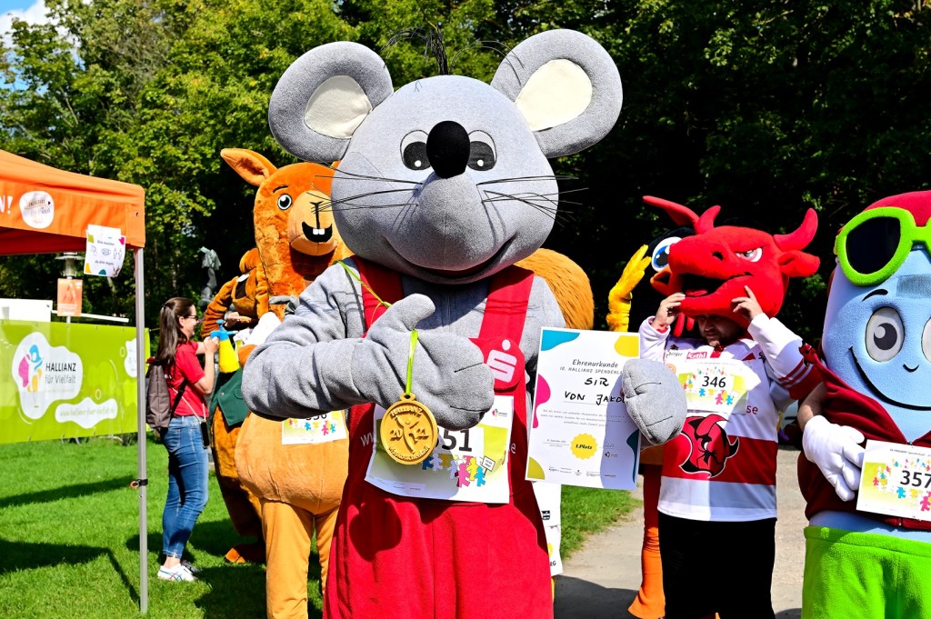 Am diesjährigen 10. Lauf, diesmal an der Fontäne auf der Peißnitz sind 17 Maskottchen von Unternehmen, Institutionen und Sportvereinen für den guten Zweck um die Wette gelaufen. Sie setzen damit wiederum ein buntes Zeichen für Demokratie und Vielfalt. Mit der Teilnahme im Rahmen des HALLIANZ Spendenlaufs „Fit für Vielfalt“ [www.hallianz-fuer-vielfalt.de] unterstützen die Maskottchen lokale Projekte zur Stärkung eines friedlichen Miteinanders in unserer Stadt. Mit den Spenden konnten in letzten Jahren eine Vielzahl von Projekten umgesetzt werden.