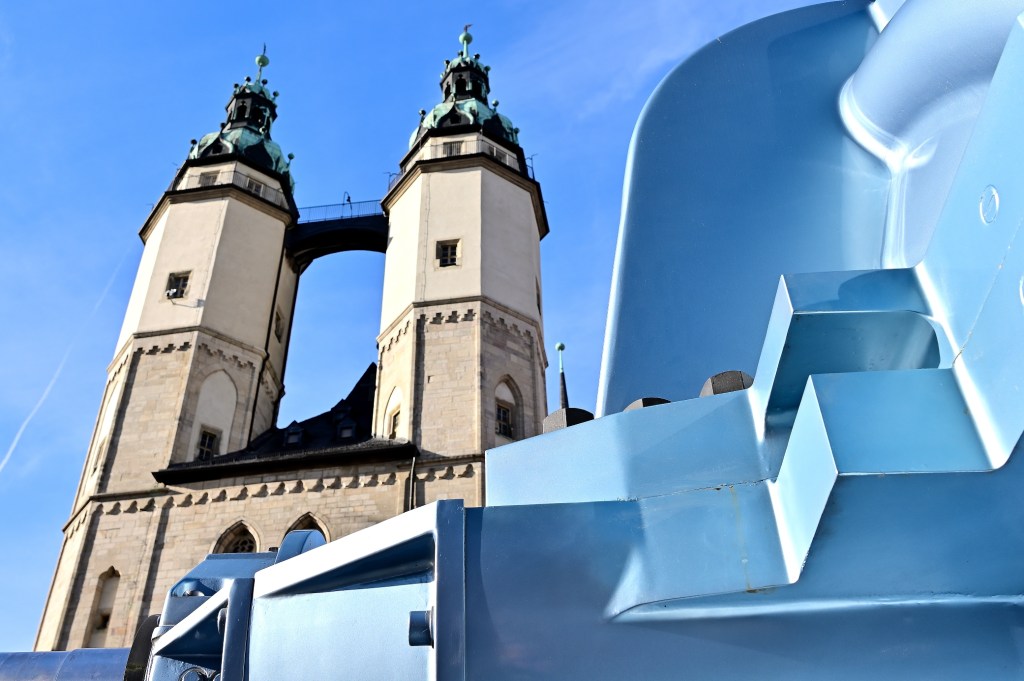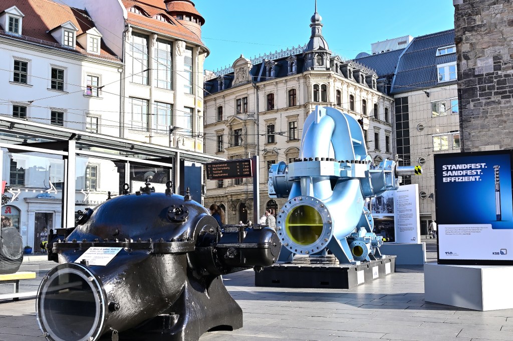 Aus Anlass des 150-jährigen Firmenjubiläums zeigt der internationale Pumpen- und Armaturenhersteller auf dem Marktplatz von Halle einige seiner „Produkte“.