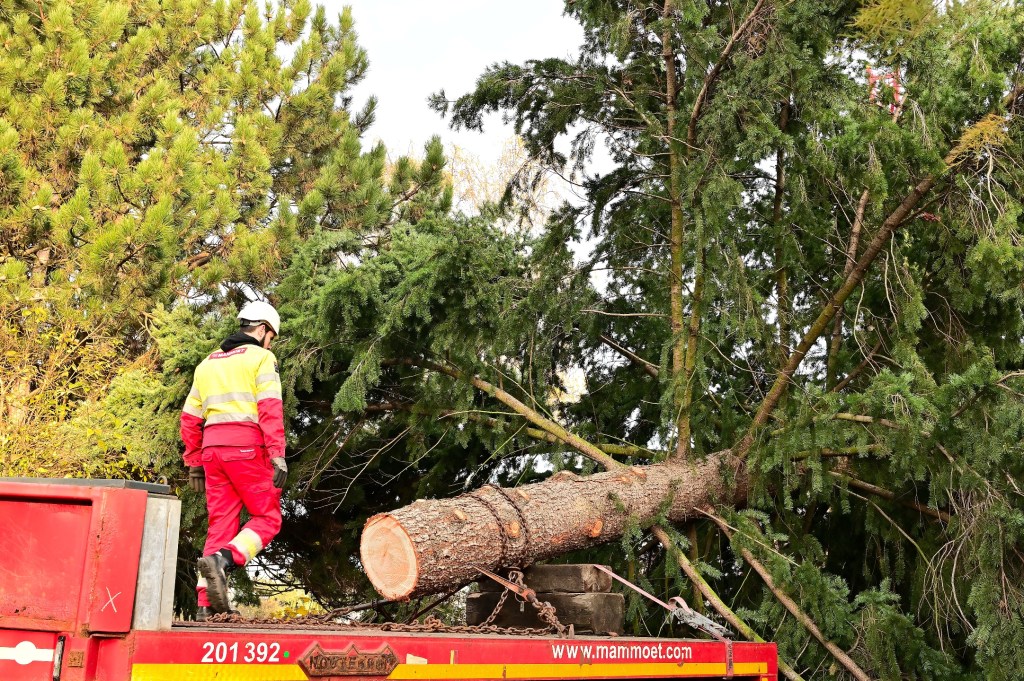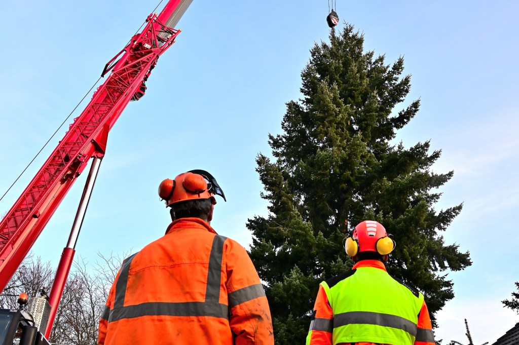 Da musste mit dem Tieflader und Kran gekonnt rangiert werden, um auf dem engen Raum die Weihnachtstanne in die vorbereitete Vertiefung einzubringen und sturmsicher zu befestigen.