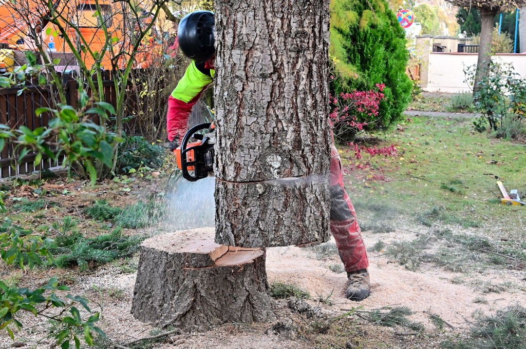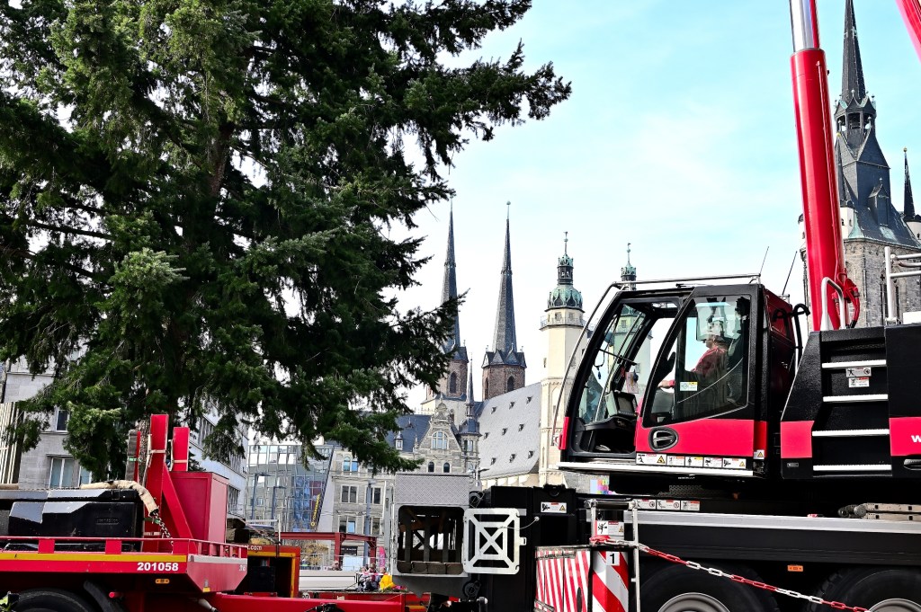 Wie jedes Jahr wird die Weihnachtstanne auf dem Marktplatz zwischen Händeldenkmal und Ratshof aufgestellt. Der „Spender“ ist ein Anwohner aus der Gottfried-Keller-Siedlung. Ihm wurde der Baum in seinem Vorgarten einfach zu groß und es auch ab einer bestimmten Größe nicht ganz ungefährlich, zumal schon ein Baum im Vorgarten im letzten Sturm entwurzelt wurde. Und so wurde die Douglas-Tanne, die eigentlich in Nordamerika beheimatet ist, heute in seinem Vorgarten gefällt. Wie geplant ging es um 08:00 Uhr ans Werk, Tieflader und Kran wurden aufgestellt und Absperrungen eingerichtet. Der Baum wurde am Kran angehängt und damit gesichert. Die Arbeit mit der Kettensäge dauerte gerade mal 15 Minuten und der Baum hatte seinen Platz, auf dem er ca. 60 Jahre stand, verlassen. Übrig bleibt ein Baumstumpf und gutes Feuerholz für den Kamin. Die ca. 25 hohe Tanne wurde noch für den Transport von unten nach oben auf etwa 16 Meter eingekürzt und anschließend auf dem bereitgestellten Tieflader abgelegt und verzurrt. Von dort ging es 2 Stunden später mit Polizeieskorte in Richtung Marktplatz.