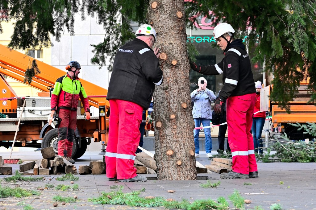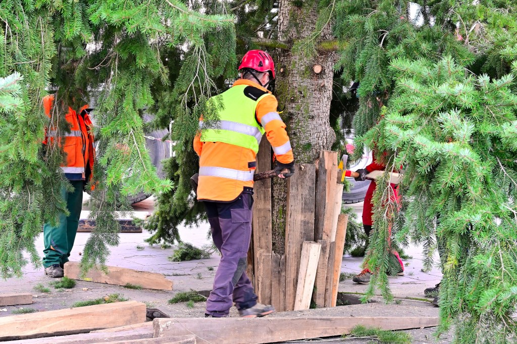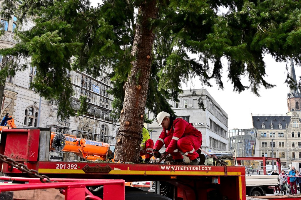 Weihnachtstanne wird auf dem Marktplatz aufgestellt.