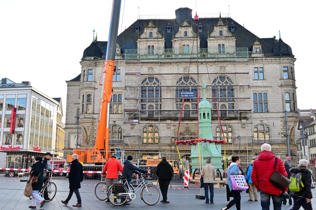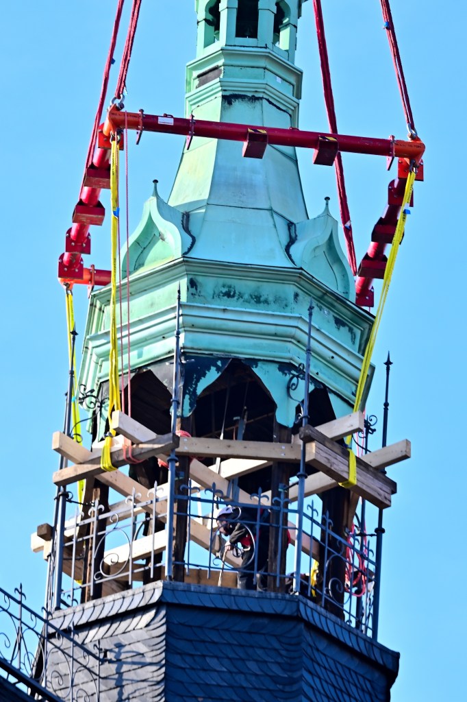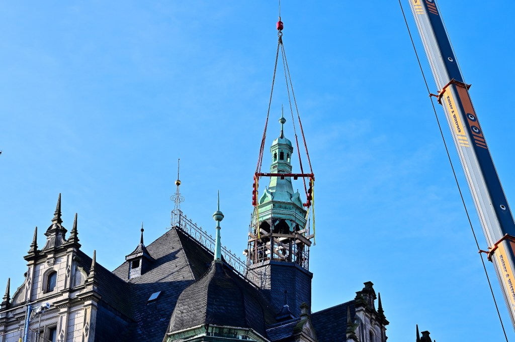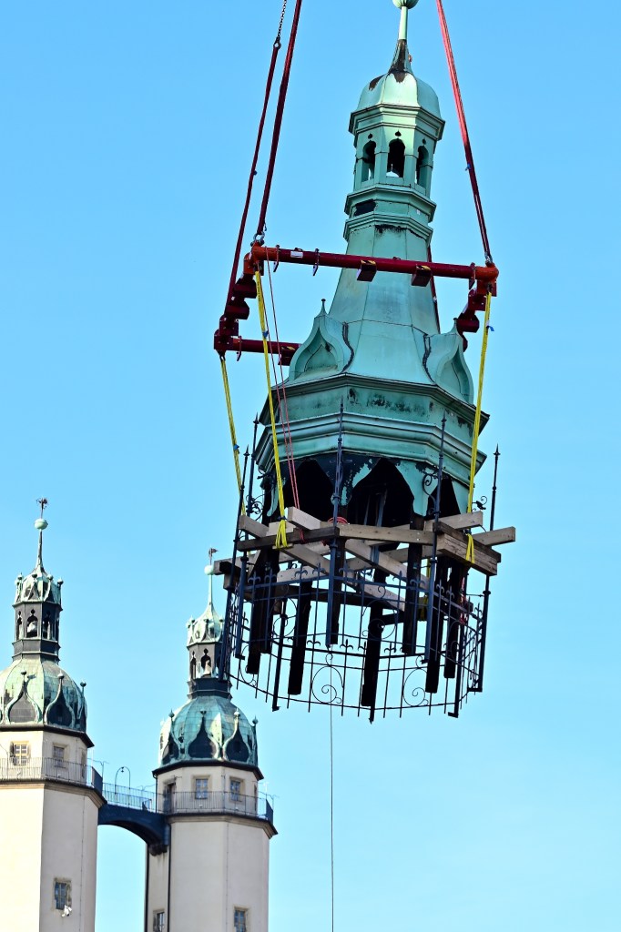 In Vorbereitung der notwendigen Arbeiten am Dachstuhl wurde gestern die Turmhaube des Stadthauses abgenommen. Dafür waren umfangreiche Vorbereitungen notwendig. Schon mit Beginn der Woche wurde Großgerät von der Firma Kaiser & Wittrock [www.wittrock-gruppe.de] aus Halle auf dem Marktplatz aufgefahren und installiert. Das ist auf dem belebten Platz nicht ganz einfach, denn allein der Kran, der die Turmhaube herunterheben soll, musste auf eine Arbeitslänge von über 50 Metern ausgefahren werden. Während noch am Boden die Traverse montiert wurde, die später über die Turmhaube geführt wird und den Turm während der Demontage sichern soll, wurden im Dach-Turm die Verankerungen und Befestigungen weitgehend gelöst. Gegen 10:00 Uhr wurde der Turm in der Traverse gesichert, die letzten Befestigungen abgetrennt und der Turm mit einem Gewicht von ca. 2 Tonnen konnte langsam herabgelassen und vor dem Stadthaus abgesetzt werden.