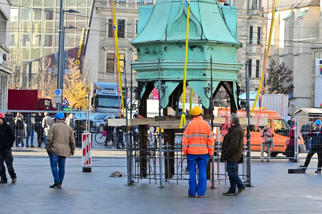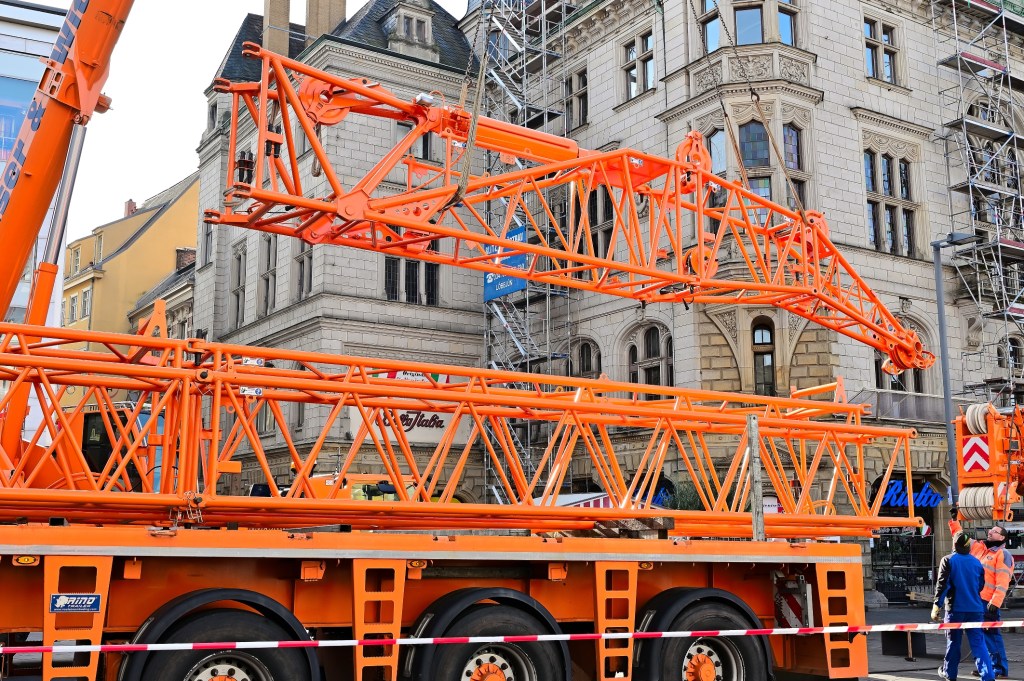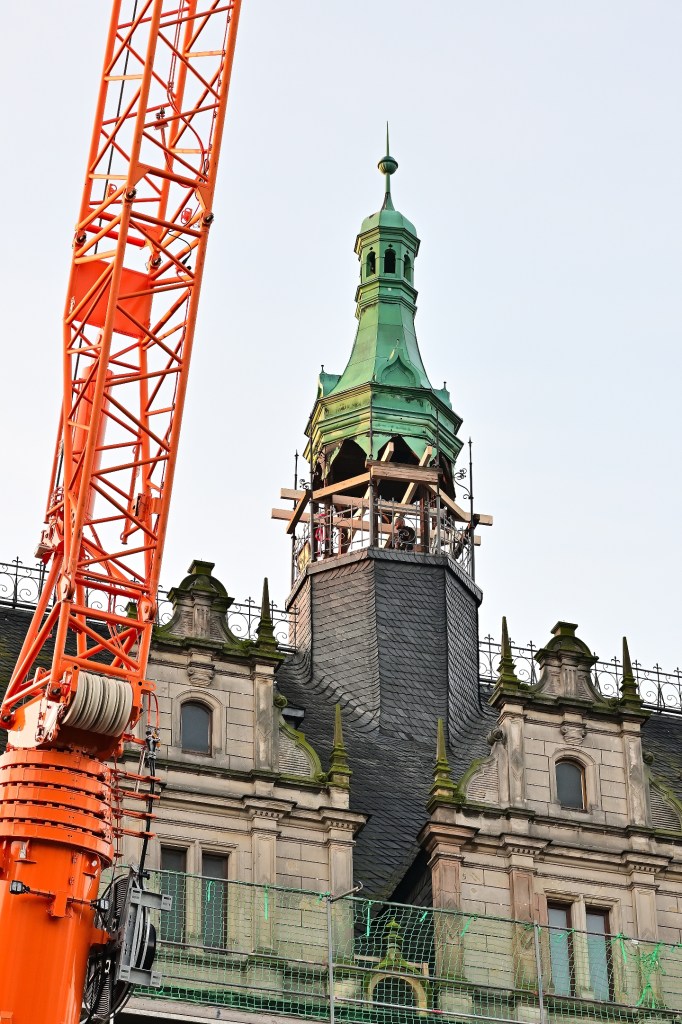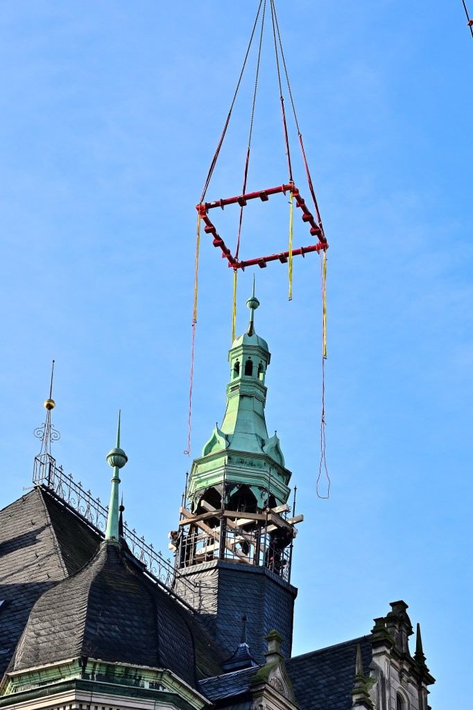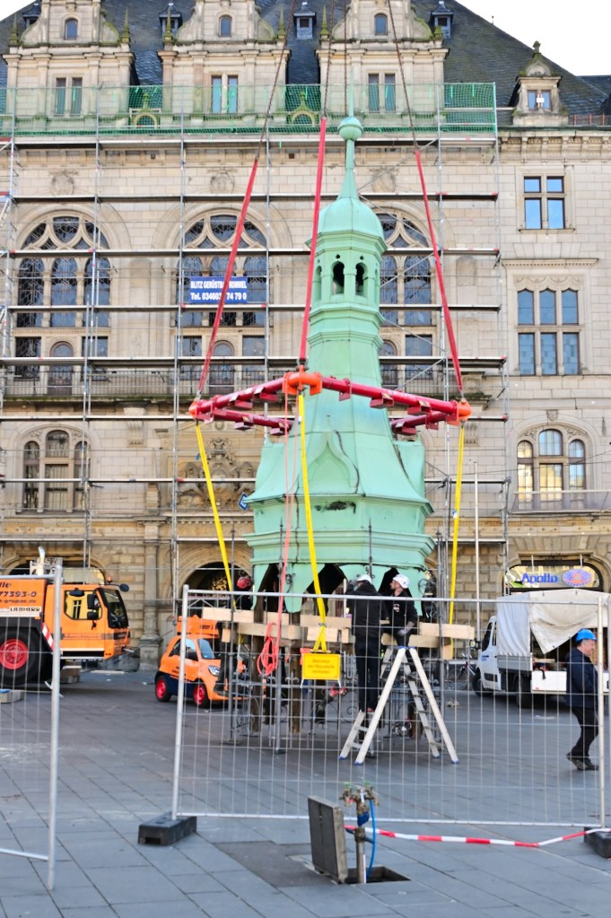 In Vorbereitung der notwendigen Arbeiten am Dachstuhl wurde gestern die Turmhaube des Stadthauses abgenommen. Dafür waren umfangreiche Vorbereitungen notwendig. Schon mit Beginn der Woche wurde Großgerät von der Firma Kaiser & Wittrock [www.wittrock-gruppe.de] aus Halle auf dem Marktplatz aufgefahren und installiert. Das ist auf dem belebten Platz nicht ganz einfach, denn allein der Kran, der die Turmhaube herunterheben soll, musste auf eine Arbeitslänge von über 50 Metern ausgefahren werden. Während noch am Boden die Traverse montiert wurde, die später über die Turmhaube geführt wird und den Turm während der Demontage sichern soll, wurden im Dach-Turm die Verankerungen und Befestigungen weitgehend gelöst. Gegen 10:00 Uhr wurde der Turm in der Traverse gesichert, die letzten Befestigungen abgetrennt und der Turm mit einem Gewicht von ca. 2 Tonnen konnte langsam herabgelassen und vor dem Stadthaus abgesetzt werden.