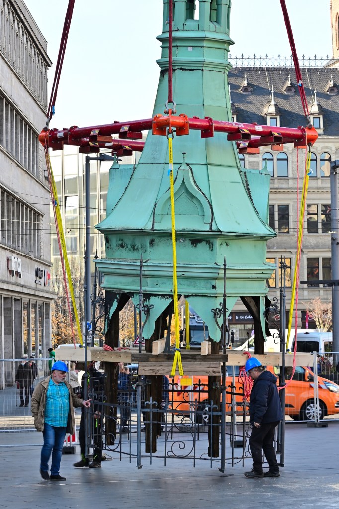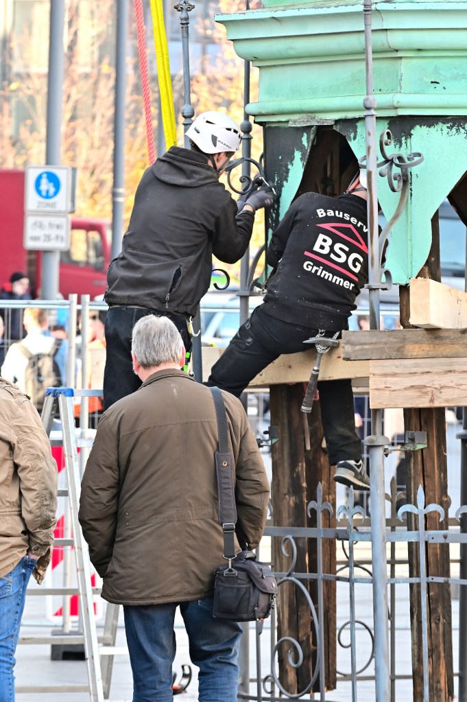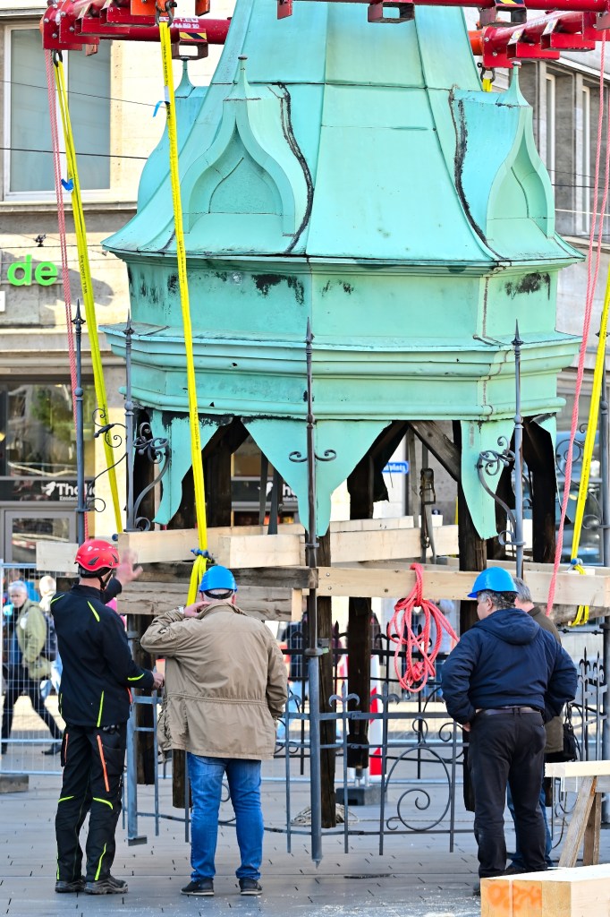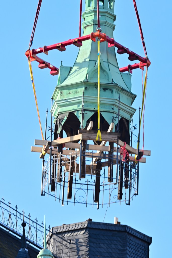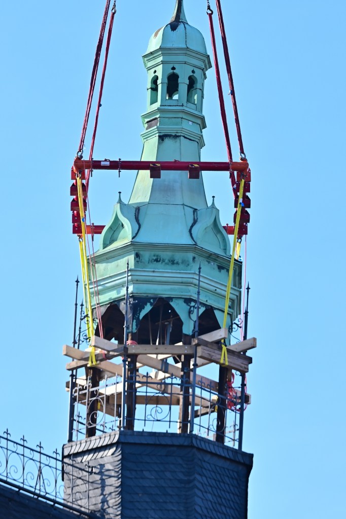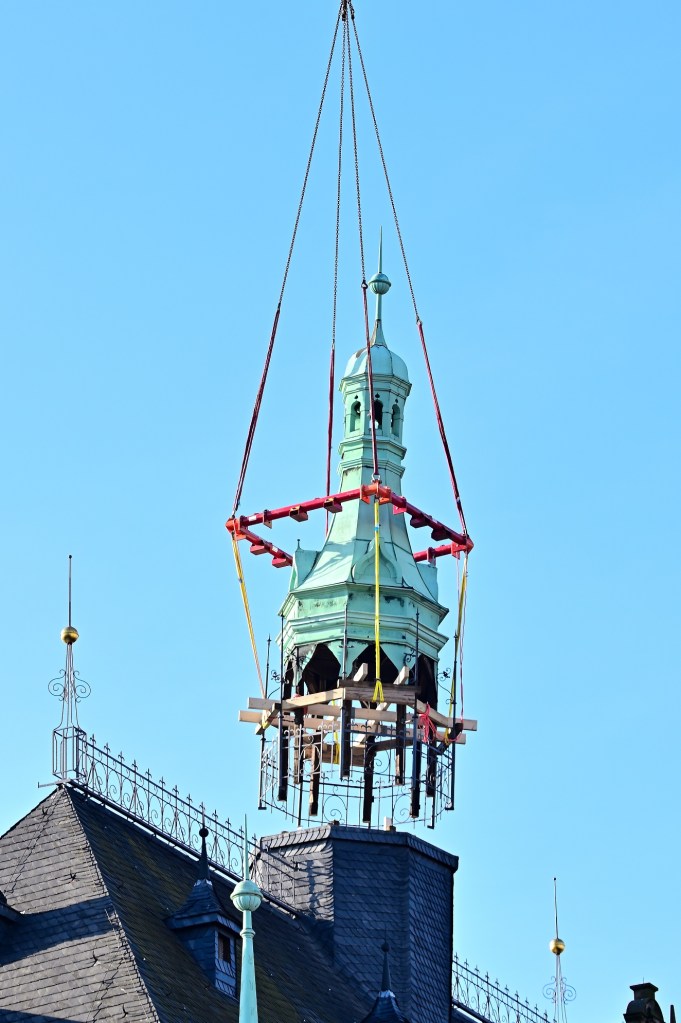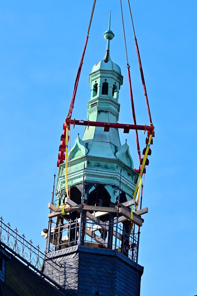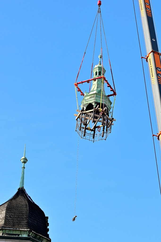 Bevor der Turm während der Sanierungsarbeiten im Innenhof des Stadthauses deponiert wird, erfolgte noch eine kurze Inspektion des baulichen Zustandes.