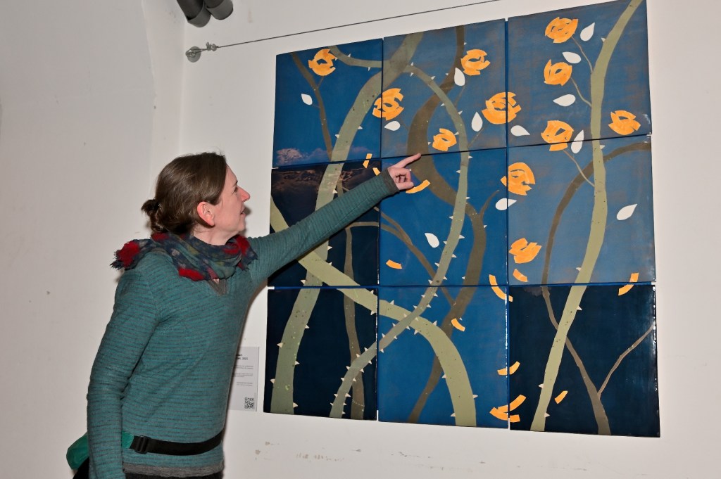 Die zweite Wandgestaltung, geschaffen von der diplomierten Keramikerin Claudia Klinkert aus Halle, zeigt eine Keramikarbeit, bestehend aus 9 Einzelplatten in Intarsientechnik. Die verschieden farbig abgestuften Quadrate von insgesamt 114 x 114 cm, stellen die verschiedenen Zeitetappen dar, wobei im heller werdenden Bereich sich die Dornenhecke und die Rosenblüten öffnen. Die Oberfläche wird mit Glasur überzogen und damit gut gegen äußere Einflüsse geschützt.