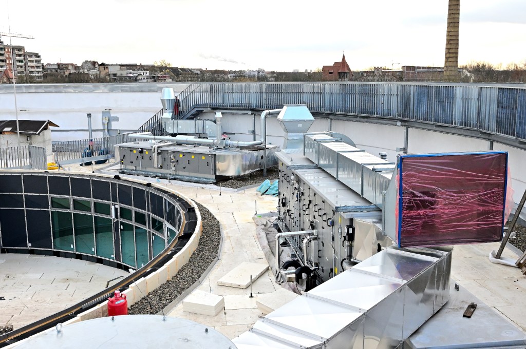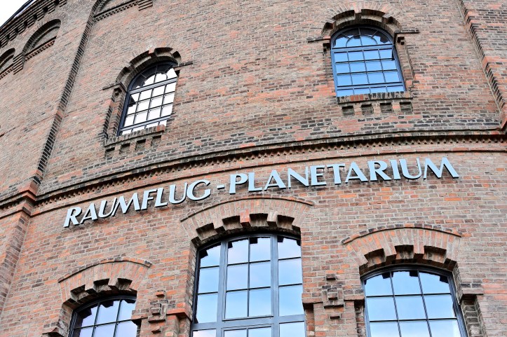 Der Name des neuen Planetariums ist über dem Haupteingang gut sichtbar installiert. Übrigens ist es der alte Schriftzug vom abgerissenen Planetarium auf der Peißnitz. Derzeit werden parallel zu den intensiven Arbeiten im inneren des Gasometers die Außenanlagen gestaltet. Auf allen Etagen des Planetariums hat sich mittlerweile vieles verändert. Im „Sternen-Cafe“, das sich gleich im Eingangsbereich befindet, werden schon die Fußböden aus massiver Eiche verlegt. Schulungs- und Büroräume stehen kurz vor der Fertigstellung. Viele der technischen Einbauten sind hinter den Einbauwänden versteckt. Bereits final installierte Geräte, Treppen und Geländer oder der schon eingebaut Fahrstuhl sind mit Schutzfolie verhüllt, um sie während der Bauarbeiten vor Beschädigungen zu schützen. Selbst einige Handwerker müssen ihre Schuhe ausziehen, damit bereits eingebaute Bodenbelege zu schonen.