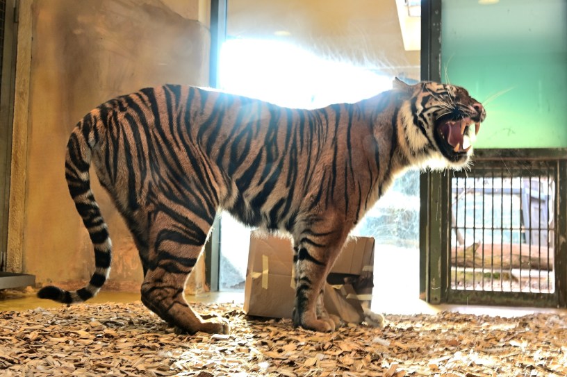 Sumatra-Tiger kommen ausschließlich auf der Insel Sumatra vor. Es ist die kleinste noch lebende Unterart bzw. Inselunterart des Tigers. Sumatra-Tiger sind im Vergleich zum Sibirischen Tiger relativ klein. Weibliche Exemplare könne eine Körperlänge bis zu 230 cm, ein Körpergewicht bis zu 90 kg und eine Schulterhöhe bis zu 75 cm erreichen. Lara hat eine kräftige Fellfarbe mit markanten Streifen und einen langen Backenbart. Alles in allem eine „Schönheit“.