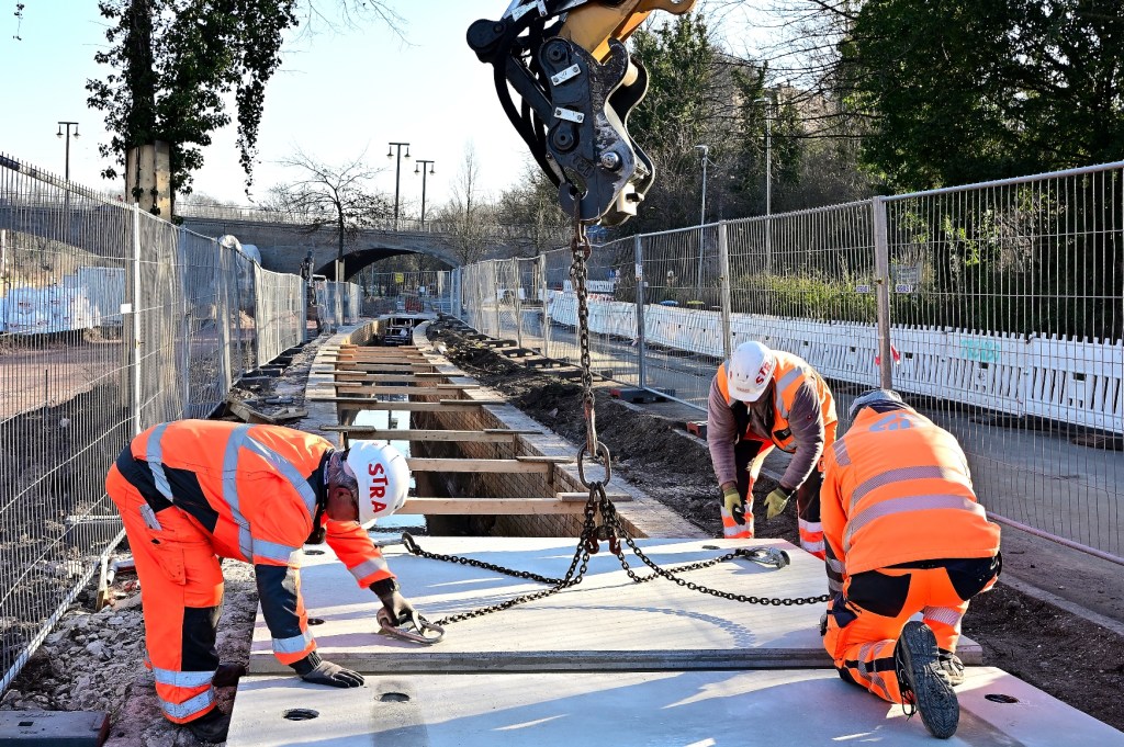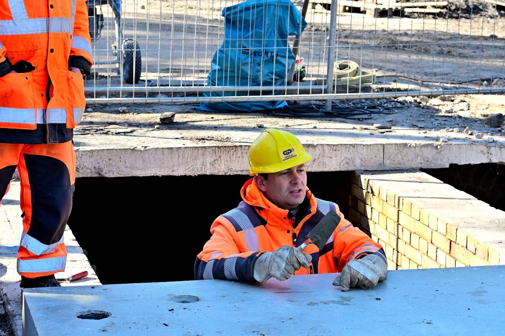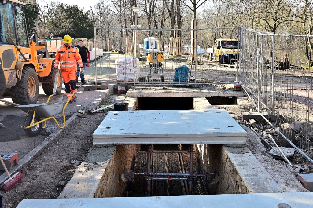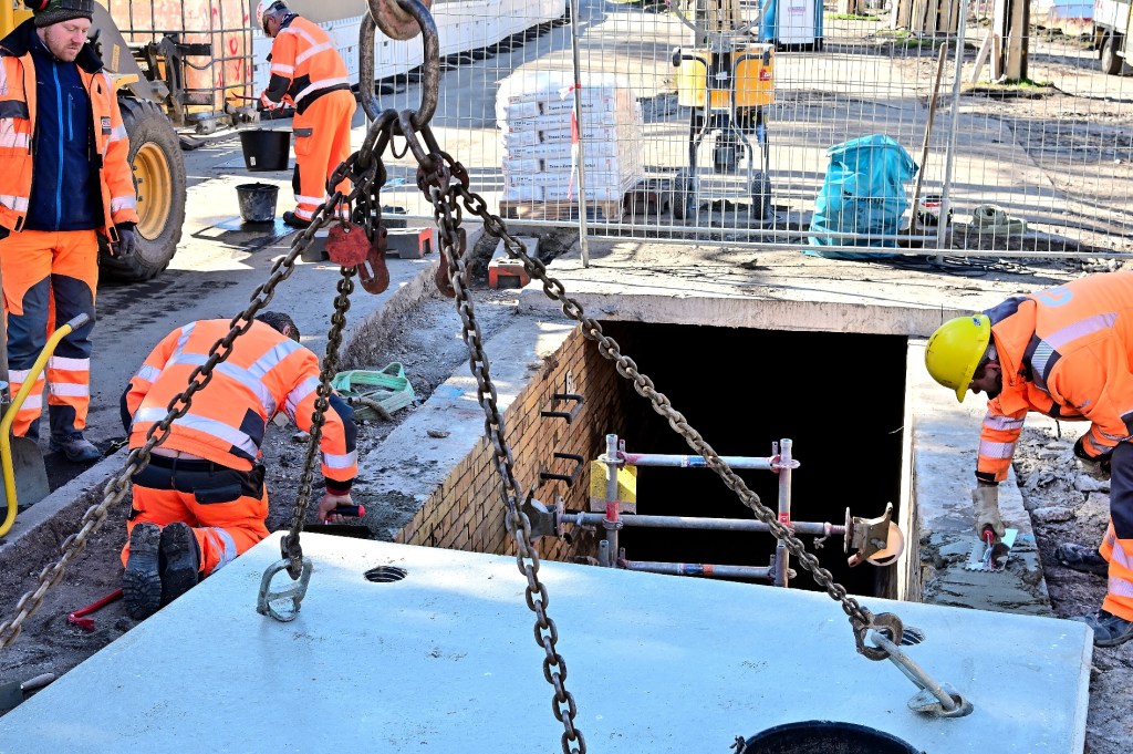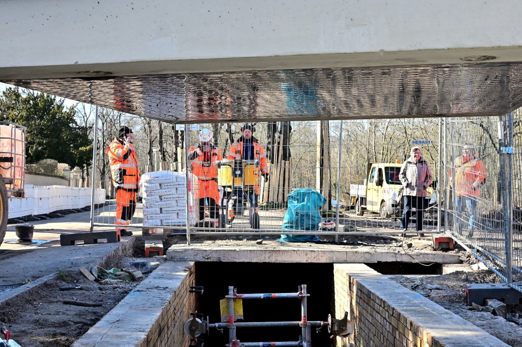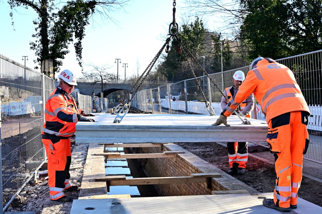 Die vorgefertigten Spezialelemente, die eigens dafür angefertigt wurden, müssen jetzt kontinuierlich angeliefert werden. Die Platten sind 2,5 Tonnen schwer, in der Auflagenfläche 2,50 mal 2,0 Meter groß sowie 16 cm bis 19 cm hoch. Unterhalb der Platte wurde eine Spezialbeschichtung aus Kunststoff aufgetragen, um sie weitgehend vor der permanenten Feuchtigkeit zu schützen. Sobald die ersten Platten verbaut sind, werden die Verbindungsfugen unterhalb der Platten verschweißt. Das ist bei der Geruchsbelästigung für die Mitarbeiter, die auch direkt im Kanal arbeiten müssen, nicht einfach. In den nächsten Tagen wird der Kanal in Richtung Giebichenstein geschlossen.