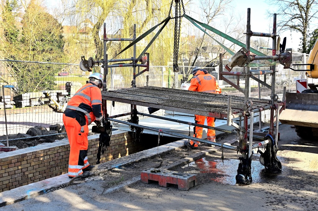 Heute Morgen wurde die erste neue Platte zur Abdeckung des Hauptwasserkanals am Riveufer verlegt. Nachdem in den vergangenen Tagen der Kanal geöffnet, gereinigt und wo nötig ausgebessert wurde, konnten heute die ersten neuen Abdeckungen verlegt werden. Dazu wurden im und am Wasserkanal Vorbereitungen getroffen. Die erste Platte muss äußerst präzise eingebaut werden. Sie sorgt für eine exakte Ausrichtung und vor allem für die vorgegebene Auflagenhöhe.