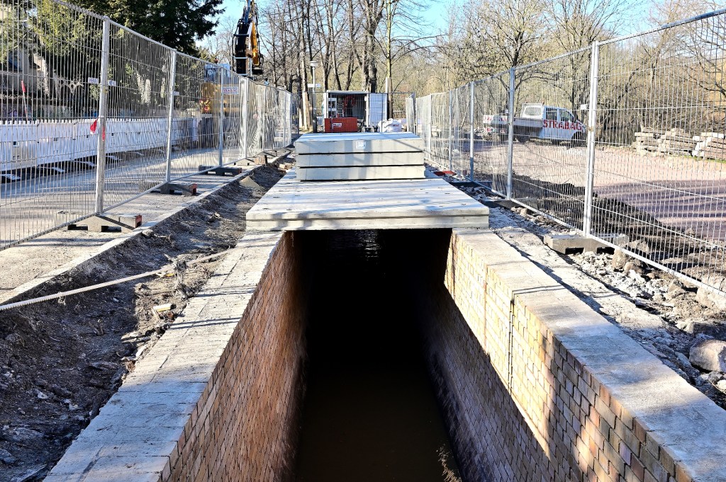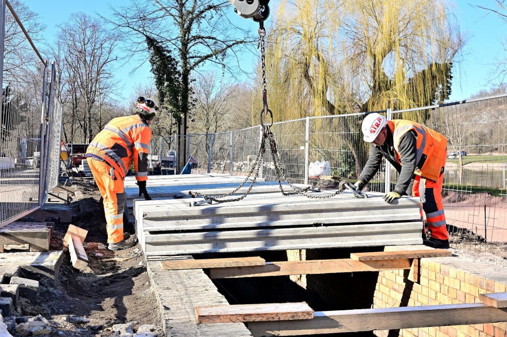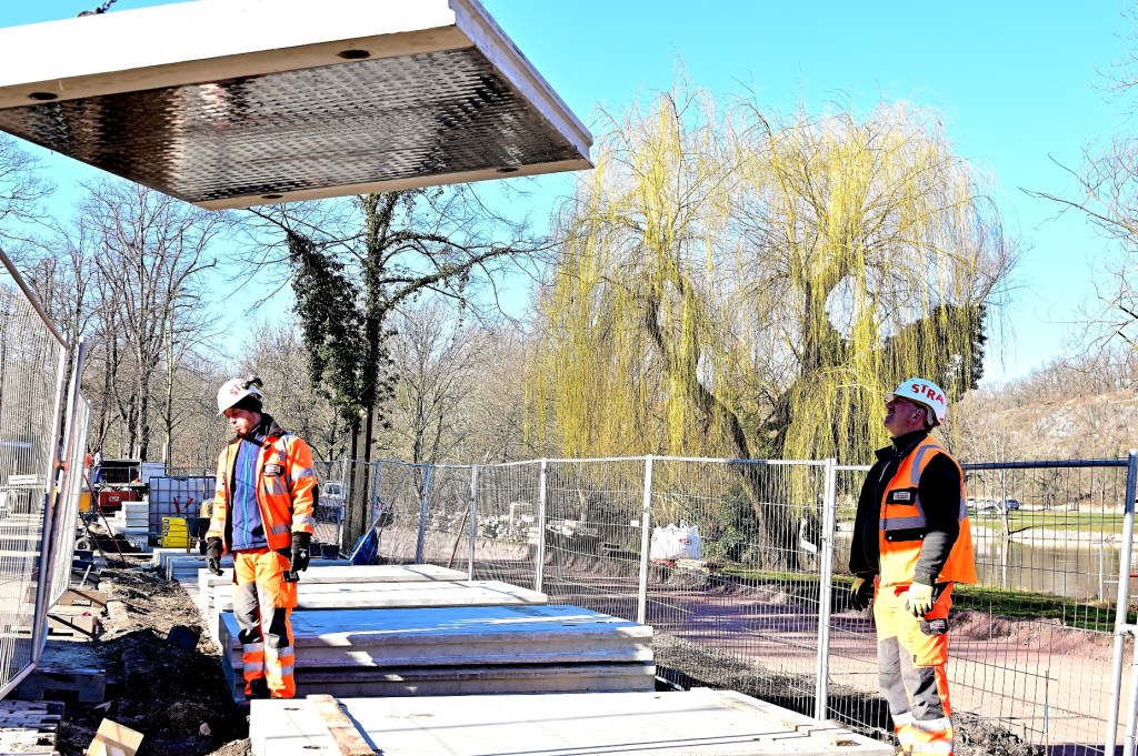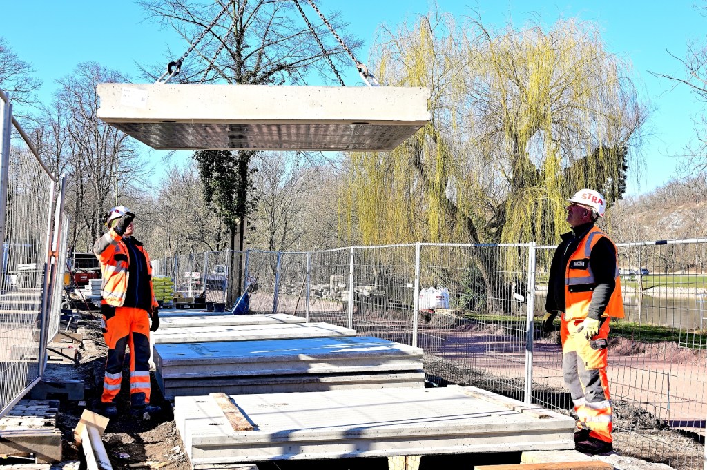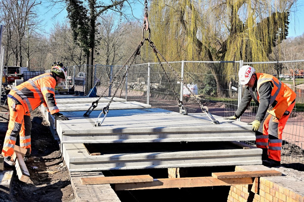 Das Wetter auf der Baustelle am Riveufer könnte nicht besser sein. Die neuen Platten, die heute am geöffneten Kanal angeliefert werden, können ohne Verzug entladen und auf der Kanaloberkante abgelegt werden, um sie schnell weiter verbauen zu können. In den nächsten Arbeitsschritten wird jede einzelne Platte durch Stahlbolzen mit dem Kanal sicher verbunden. Die Löcher wurden bereits bei der Fertigung vorinstalliert. Danach werden die Kunststoffflächen unterhalb der Platten wasserdicht verschweißt. Von oben werden die Fugen und andere Öffnungen mit Beton verschlossen.