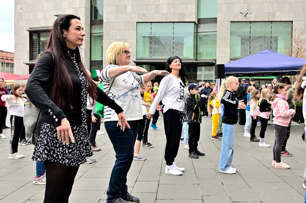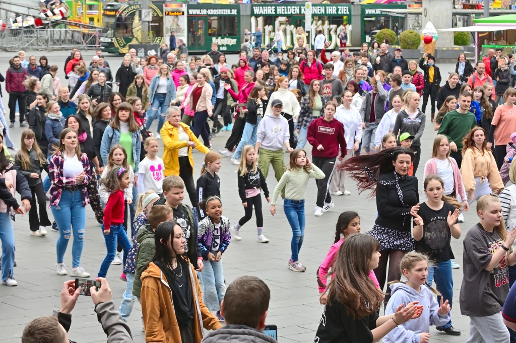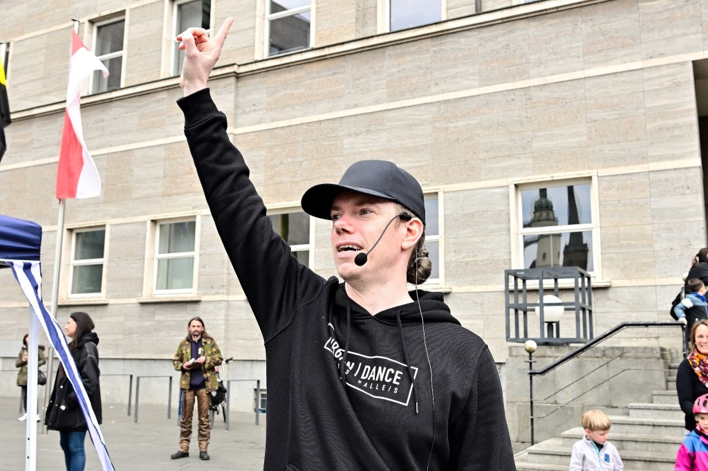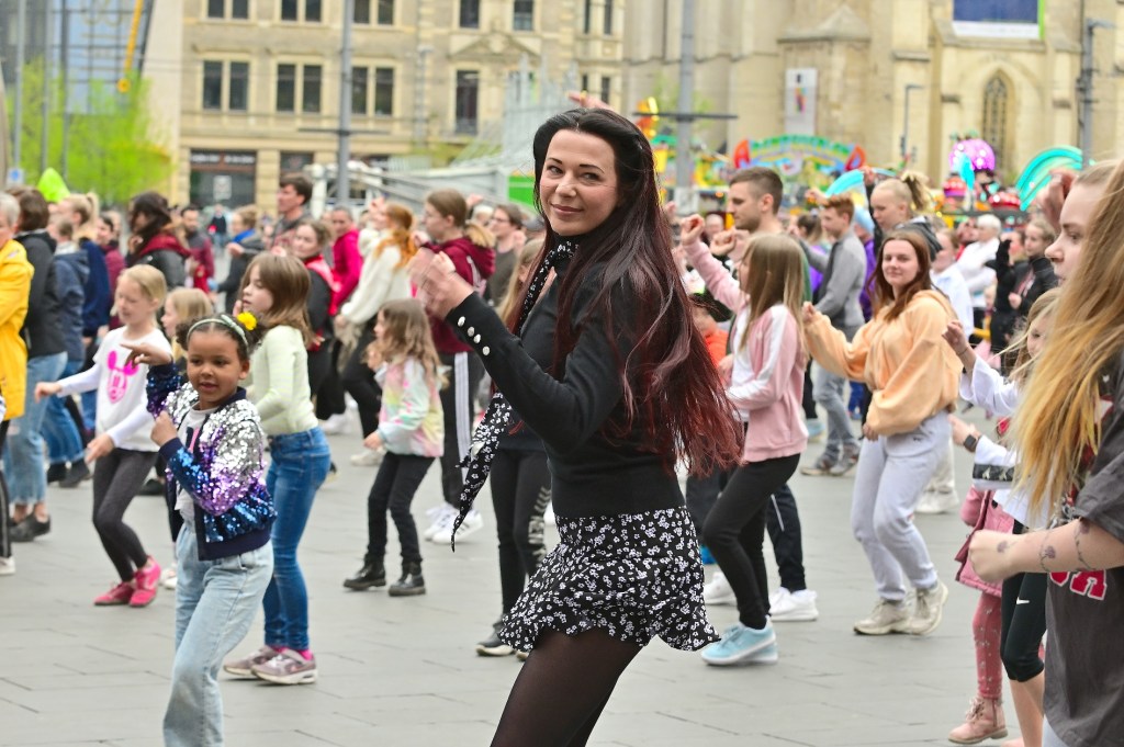 Die Choreografie zum Einüben war im Vorfeld über ein Tutorial auf der Webseite von UDC Halle abrufbar hochgeladen worden, so dass es nur wenig Zeit brauchte, die Tanzschritte auf dem Markt vor dem eigentlichen Flashmob zu üben.