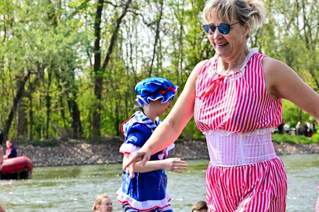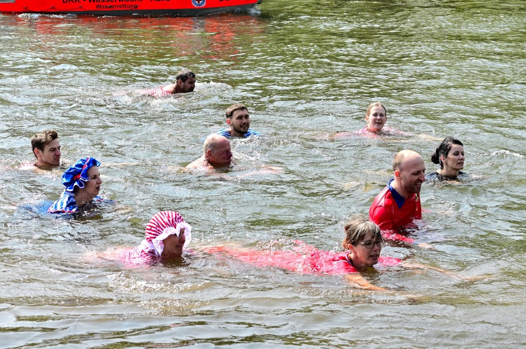 Bei schönsten Wetter hatten sich wieder sehr viele Besucherinnen und Besucher zu dem sportlichen Ereignis eingefunden. Eingeleitet wurden das Schwimmen mit Wassertreten im Uferbereich der Saale, der Kostümvorstellung und Kostümprämierung und dann ging es gleich los zum Anschwimmen. An Kostümen war auch wieder einiges zu bestaunen, von „Ganzkörperbadeanzügen“, die schon vor Einhundert Jahren als Badebekleidung benutzt wurden sowie einem Amphibienanzug oder ein Abendkleid. Beobachtet wurde das Treiben von einer „Saalenixe“ mit goldenem Haar.