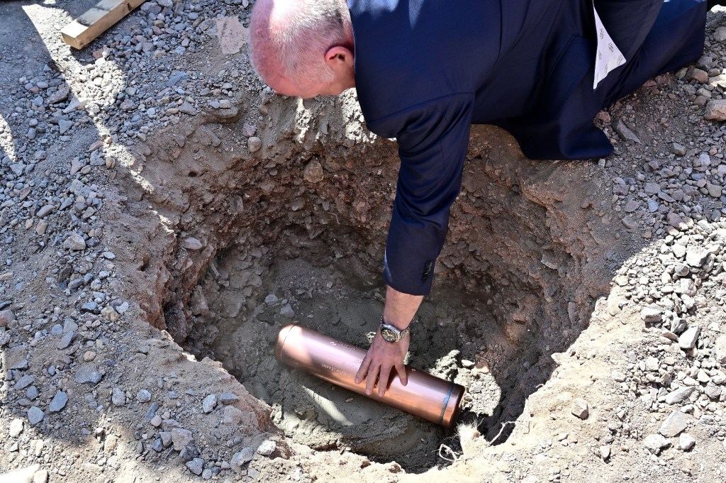 Nach alter Tradition wurde heute der „Grundstein“, in Form einer Zeitkapsel ins Fundament eingelassen, die vorher mit Gegenständen aus der heutigen Zeit gefüllt wurden.