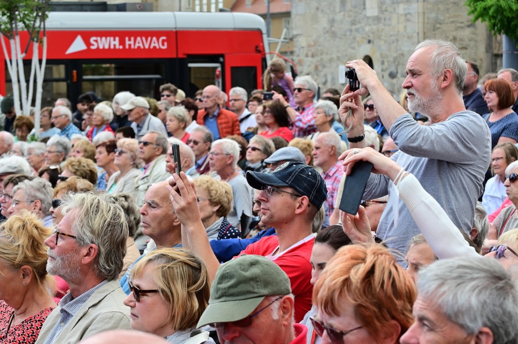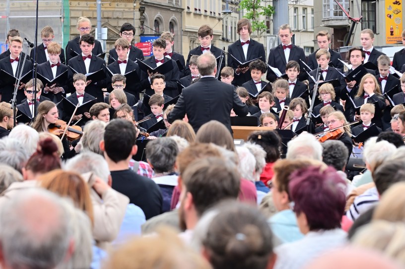 In einer Feierstunde am Händel-Denkmal auf dem Marktplatz hat Bürgermeister Egbert Geier gestern die 100. Händelfestspiele in Halle (Saale) eröffnet. Der Stadtsingechor zu Halle, das Blechbläser-Ensemble des Musikzweigs der Latina „August Hermann Francke“ und das Akademische Orchester der Martin-Luther-Universität Halle-Wittenberg haben das Programm musikalisch gestaltet; begleitet wurden sie von den Halloren, der Salzwirker-Brüderschaft im Thale zu Halle. Schon vor dem Beginn hatten sich zahlreiche Gäste auf dem Platz vor dem Händel-Denkmal eingefunden und der Einstimmung der Musikerinnen und Musiker zugehört.