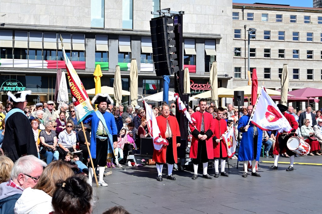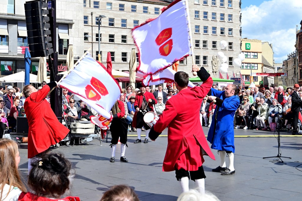 Heute geht das Programm auf dem Marktplatz weiter mit einer barocken Straßentheater-Performance, mit Musik, Akrobatik und Tanz.